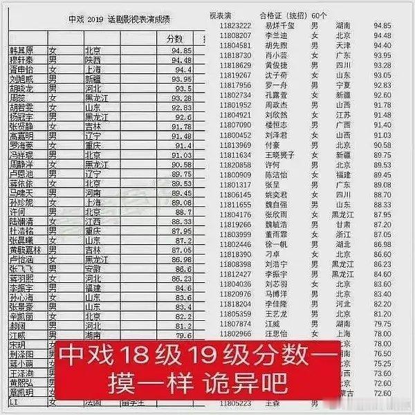 中戏1.8级和1.9级的前三十一大半的分数一样?这是干什么?对比前后几年都不大一样……表格上是易烊千玺,李兰迪,胡先煦这一届和下一届……