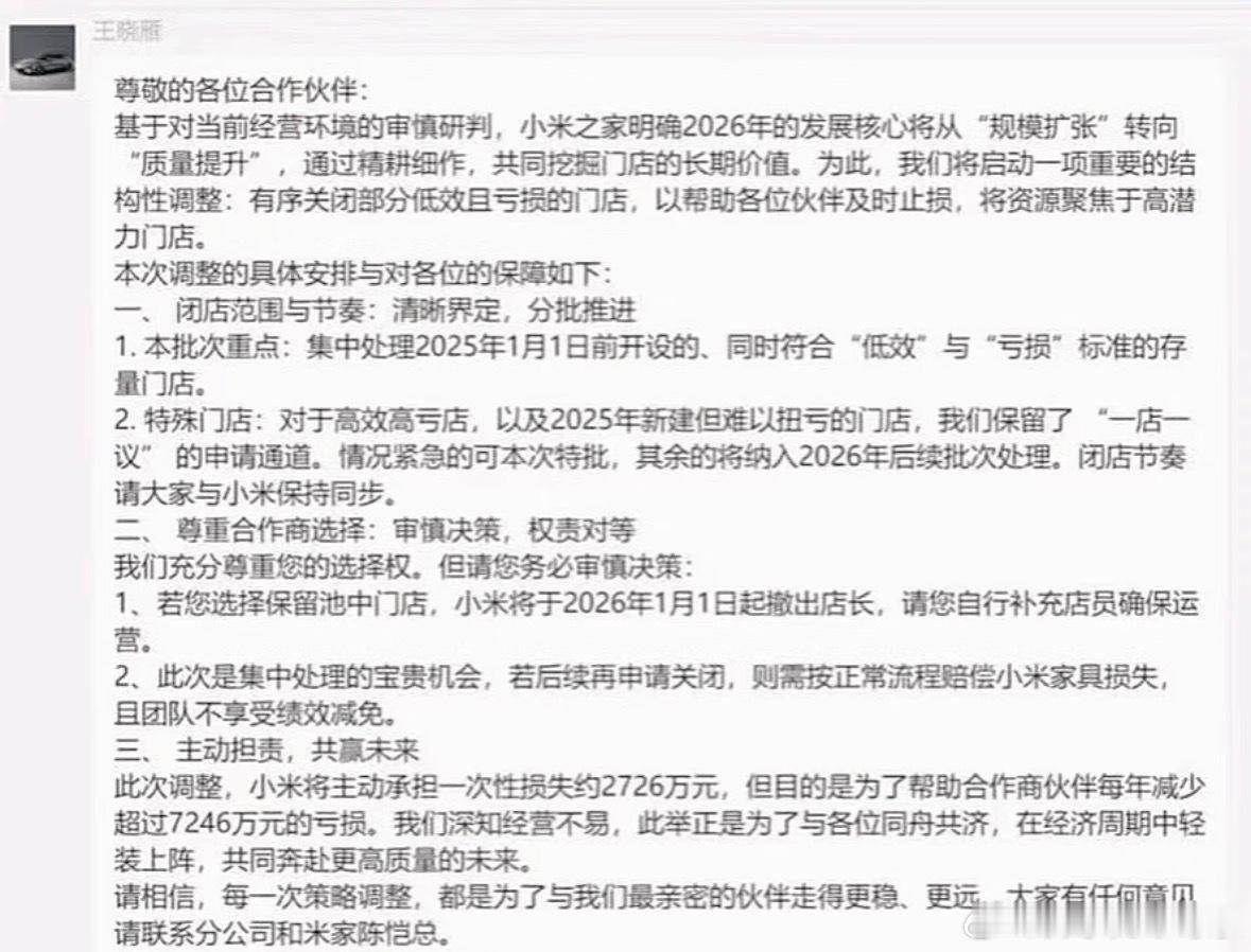 这次只是调整掉经营效益不好的店铺,总数大概1000家?其实对小米影响不大,毕竟长期亏损经销商也受不了啊,现在还有小米兜底,可以了小米将承担门店调整损失约2726万元