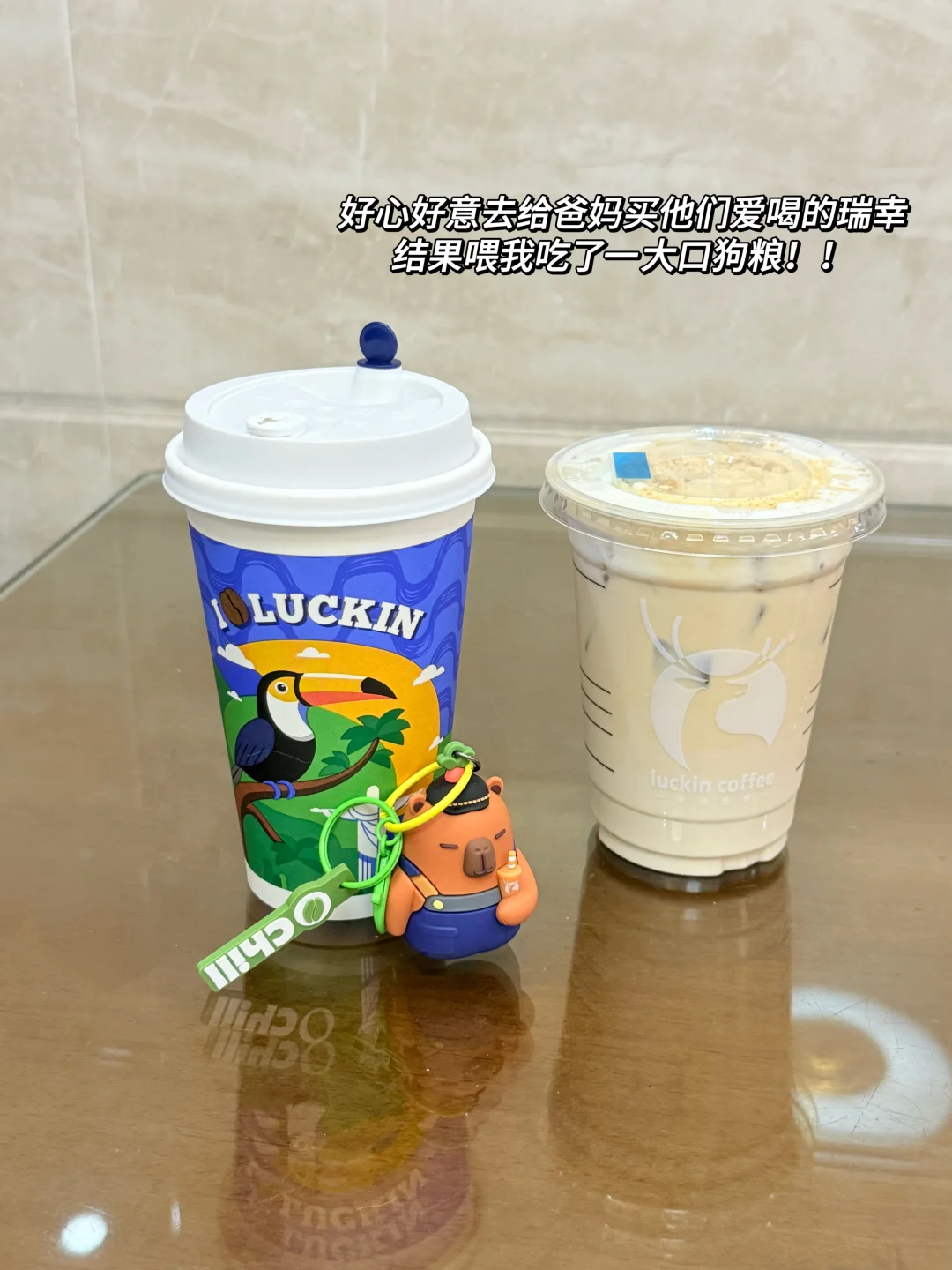 本来好心给爸妈买点好喝的,反倒被喂了一大口狗粮,好好好,我再去买两杯瑞给自己喝,爸妈两人喝两杯,我自己一个人就喝两杯!爱你老己明天见
