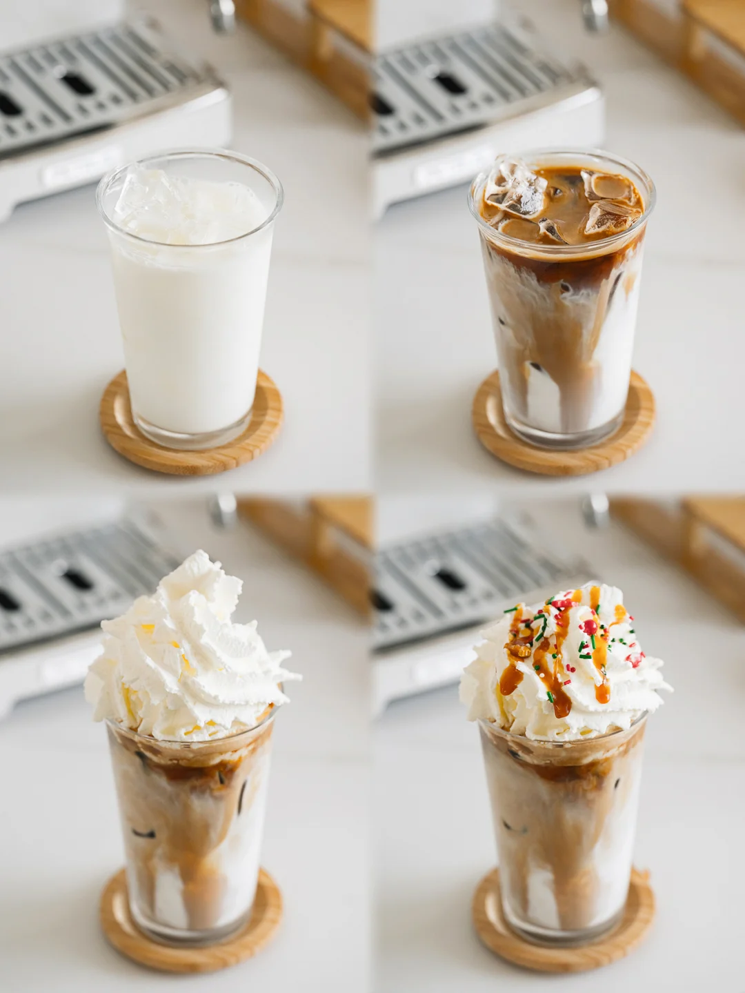 ❶冰牛奶倒入浓缩咖啡,挤两圈奶油