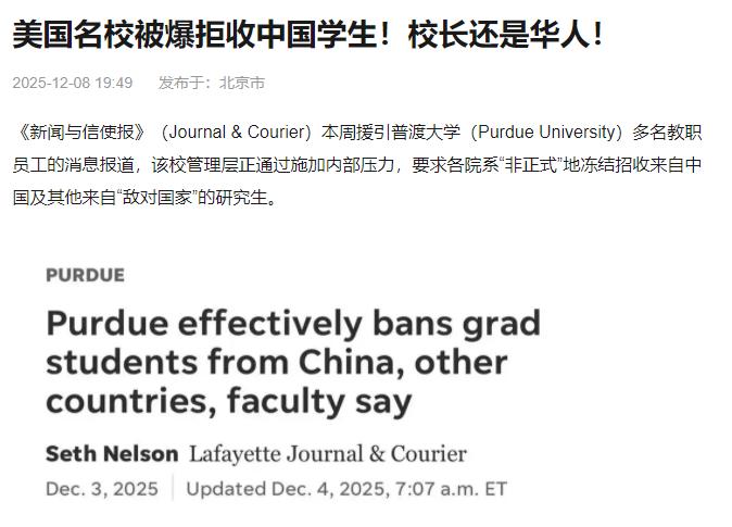 美国普渡大学拒招中国留学生,作出决定居然是一名华裔校长! 最近美国普渡大学宣