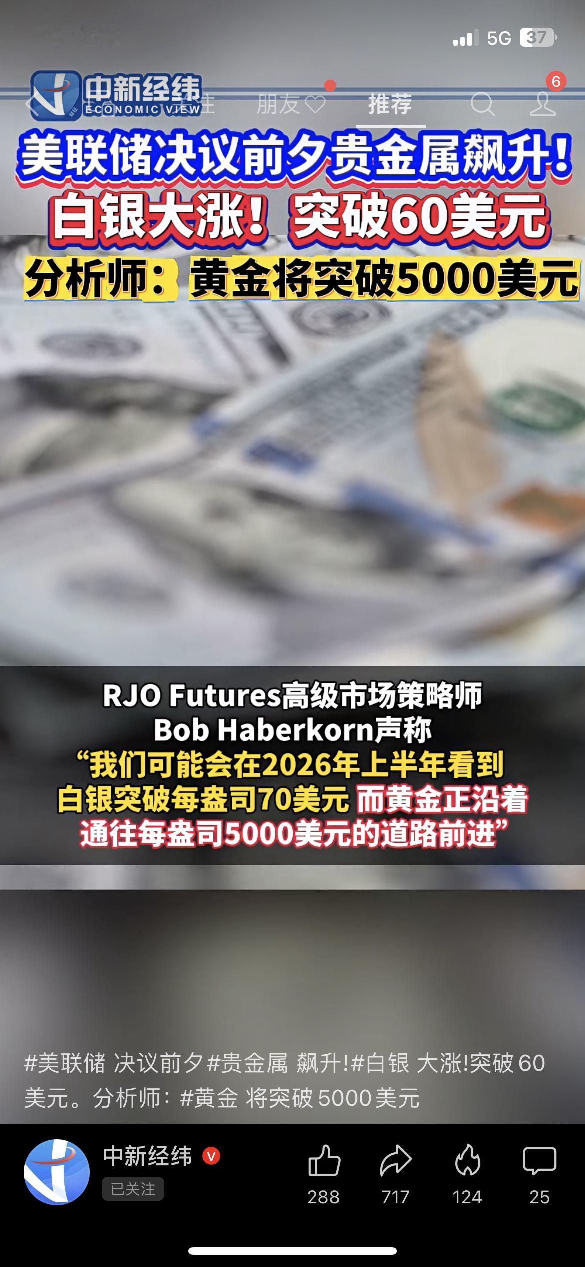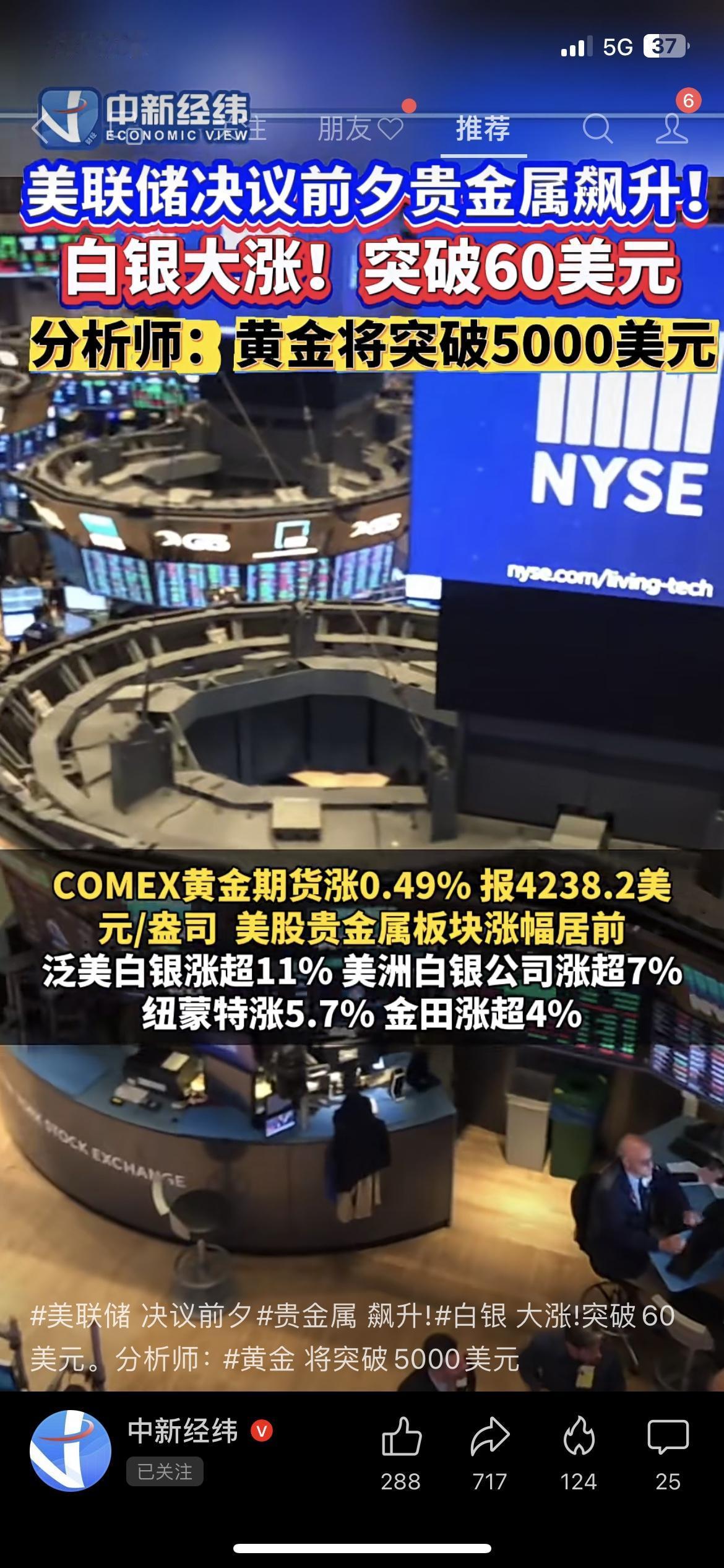 💥疯了!白银突破60美元,黄金竟要冲5000美元? 美联储决议前夕,贵金属直接