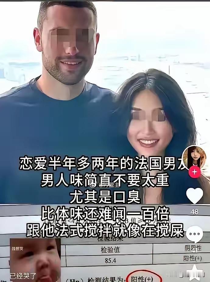 集美谈了个法国男友,当初还觉得所谓的“男人味”挺特别,结果相处下来才发现,那口臭比街边垃圾桶发酵的味还冲,法式接吻简直跟往嘴里塞脏东西似的,每次都恶心得想yue。[捂脸][捂脸][捂脸] 处了大半年,最近查出来幽门螺杆菌阳性,数值还超了不少,不用想都知道是被他传染的!合着这是找罪受呢?以前总觉得歪果仁浪漫,现在算是栽坑里了。