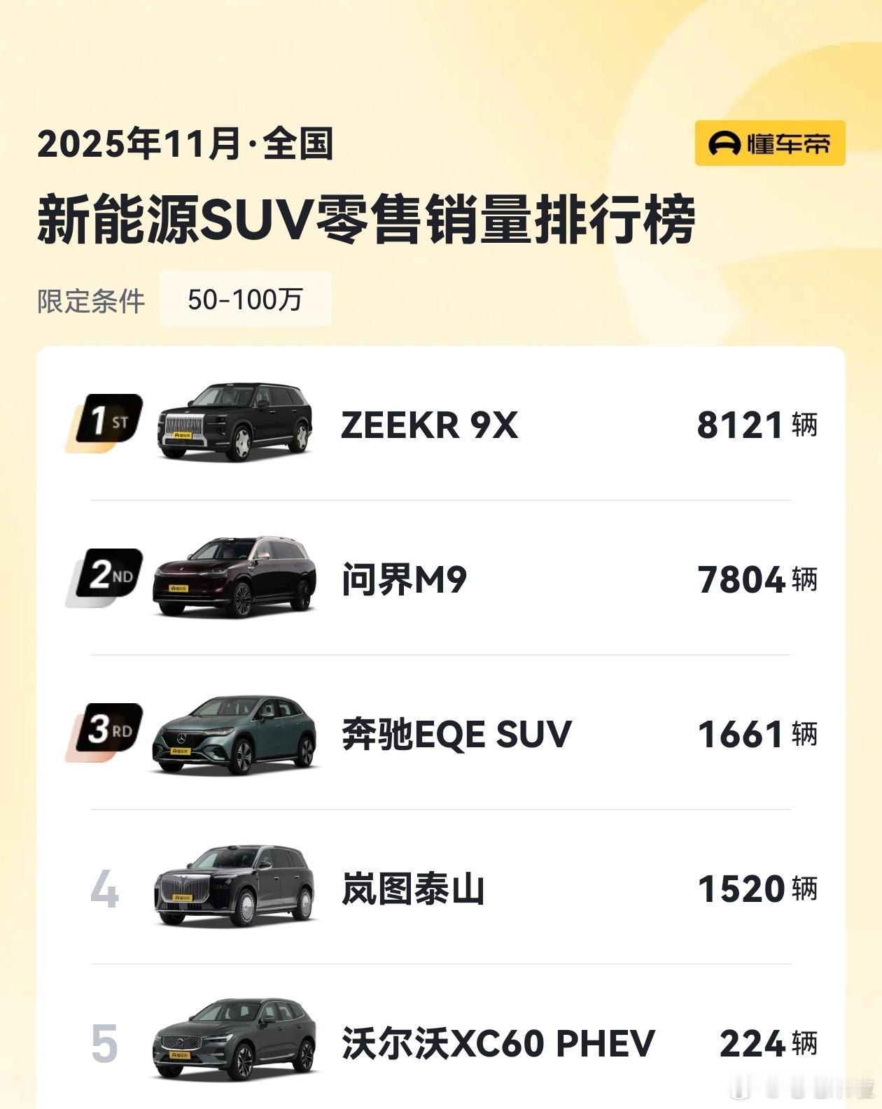 这是真的吗?11月50万以上的SUV市场销冠易主了么?极氪9X还真超问界M9了呀