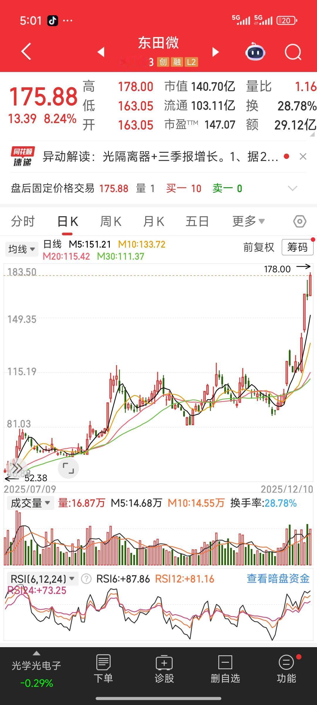 最近的大牛股东田微(CPO概念),近几日连续大幅上涨。如此走势,可见主力控盘能力极强,这K线图形绘制得着实令人赏心悦目。这般牛股,为何我又错过了呢?