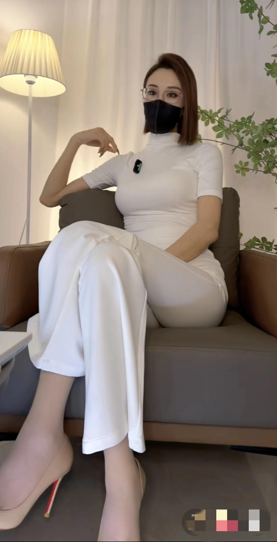 优雅白衣女,静坐沙发间,高跟鞋搭配丝袜,时尚与舒适并存。御姐高跟鞋大长腿