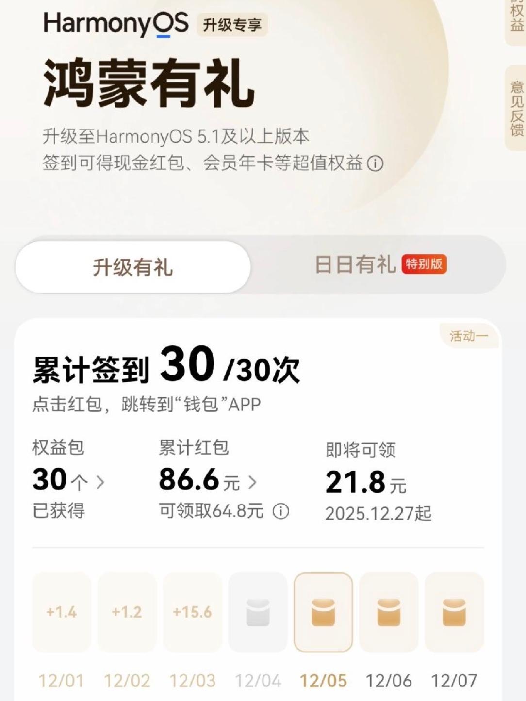 终于攒够30天了!华为这羊毛必须薅🐑 用了一年多的华为Mate70 Pro~ 终于把鸿蒙有礼的羊毛薅完了,辛辛苦苦才签到30天😭 有一说一,Mate70 Pro这机器手感确实舒服 边框更圆润,镜头模组也做了坡形过渡 整体看上去还是很大气的 影像表现更是没得说,基本上完全没有短板 流畅度也很ok,用上三五年应该没问题🤔