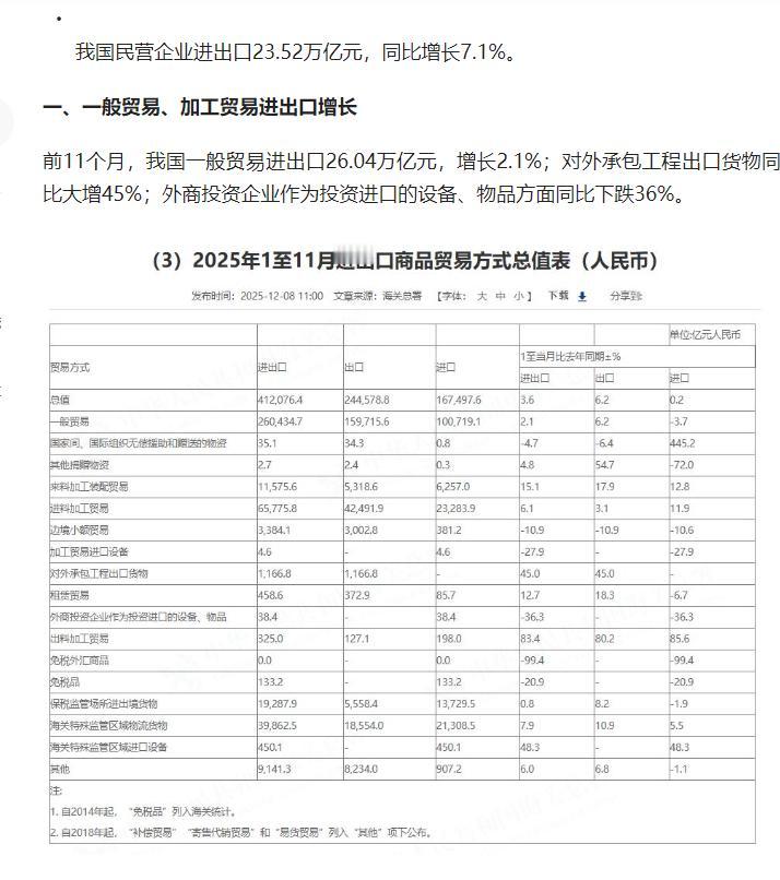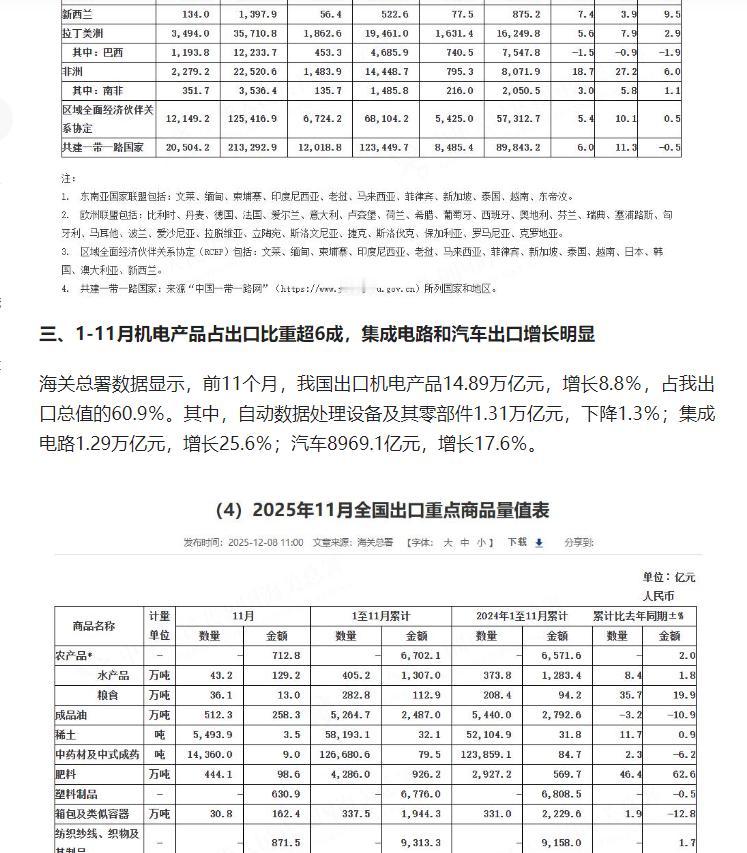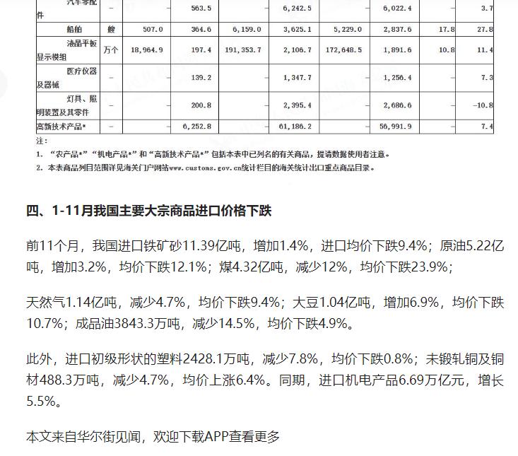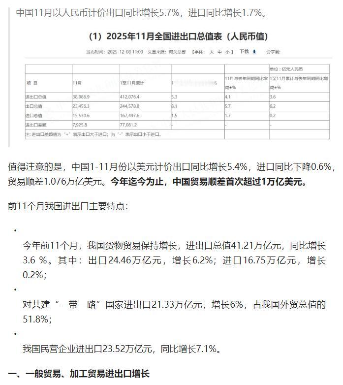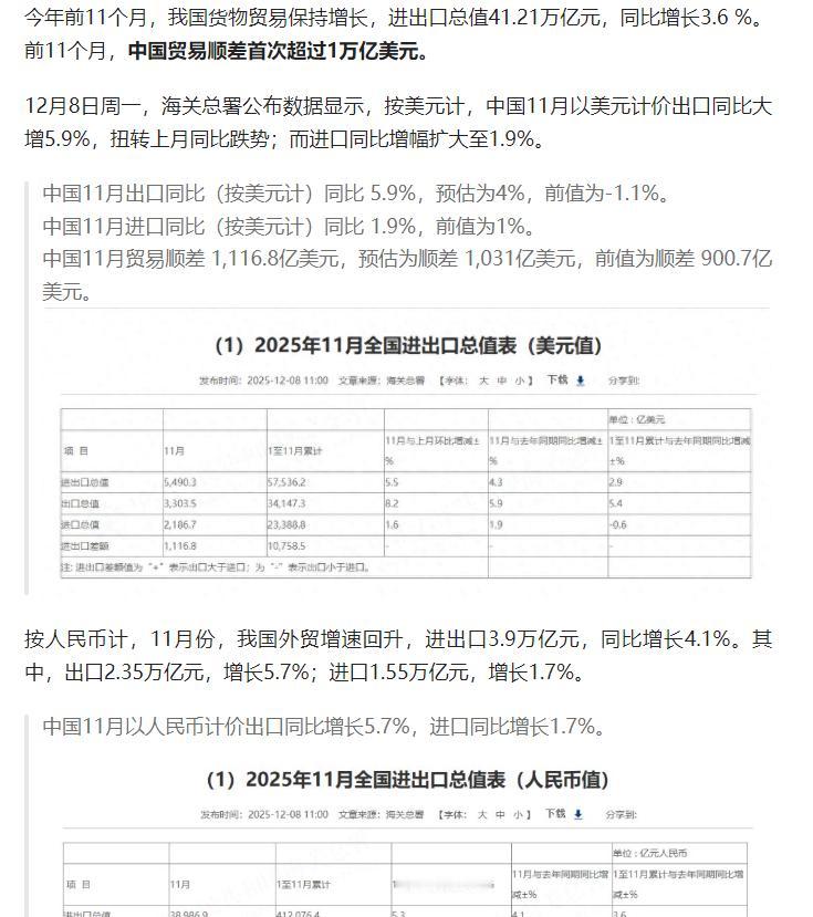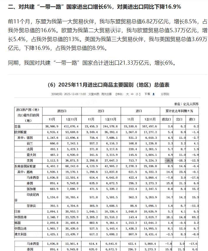 今年前 11 个月我国货物贸易进出口总值 41.21 万亿元、同比增长 3.6%,贸易顺差首超 1 万亿美元,对 “一带一路” 国家贸易增长、机电产品出口亮眼,中美贸易同比下降 16.9%。 原文来自头条创作者华尔街见闻的文章: