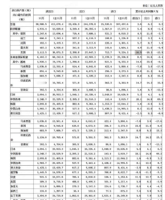 今年前11个月我国货物贸易进出口总值41.21万亿元、同比增长3.6%