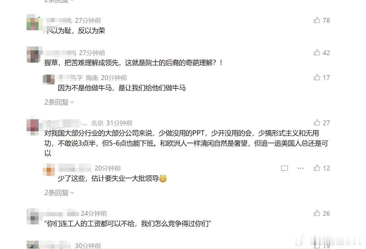 孔辉科技董事长兼CEO郭川在某活动上做一个演讲,说了一番话,引起不小的争议。原话是:11月底,我去了慕尼黑等5个德国城市,走访了几家主机厂。大概下午三点半的时候,我们在一家企业交流结束,在前台退访客卡,我发现德国车企员工开始纷纷下班了。当时我是很震撼的,也让我觉得全球汽车产业的未来应该是我们中国人的。这话听起来好像没错。但仔细一品又有点不对劲。网友的评论是:1、不以为耻,反以为荣,已经无语2、就是这种东西太多了,天天鼓吹加班超越这个超越那个3、以牺牲员工健康来发展,不长远4、内卷,把国际一流生产力的汽车产业做成负利润💰,做到极致PUA和996还说隔壁不努力,真的是。。。5、这是可悲,还是可怜?一代人干了三代人的活儿,但是那一代人才不用去卷了?现在996都是福报了,上个厕所都是计时五分钟以内。可能中国企业家真的无法理解…