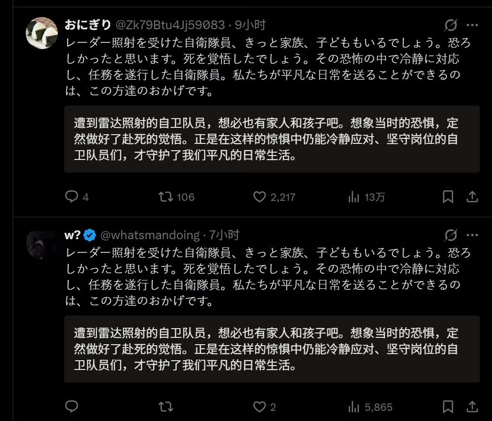 日本这水军的质量不行啊。连自卫队员的家人和孩子都搬出来搏同情了。搬的还一字不差,完全是复制粘贴,这水军也太不走心了。 复制粘贴看着眼熟,招数和1450、粉圈有点像,可以说是找到师承了…… 再次证明,这类货色可能都是一个师傅教出来的。 下次换个搞法,直接给他远程播放“葫芦娃,葫芦娃,一个藤上七个娃”、“钵钵鸡,一元一串的钵钵鸡。”