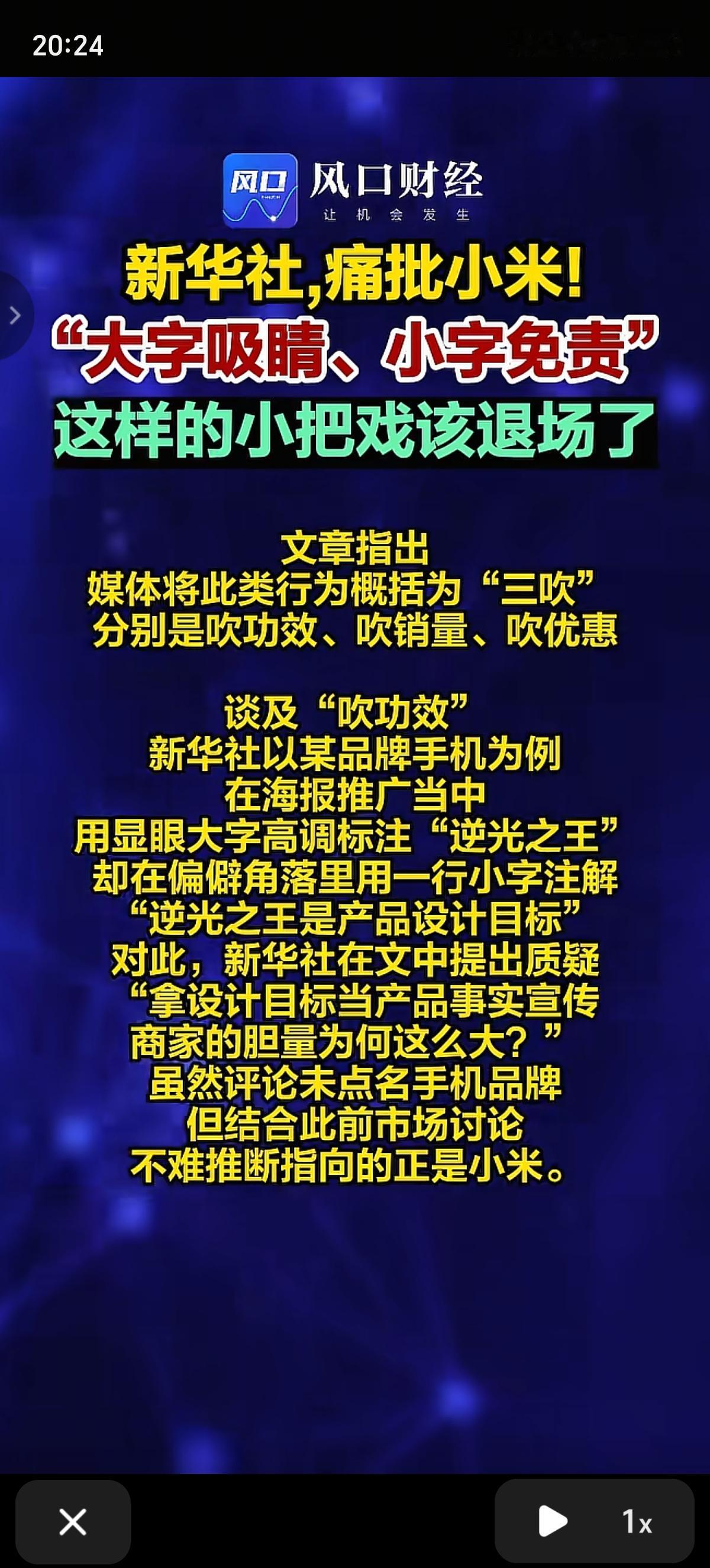 新华社痛批小米“大字吸睛、小字免责”:营销套路该退场 近期,新华社以《“大字吸睛、小字免责”,这样的小把戏该退场了》一文,直指小米营销乱象,虽未点名却精准戳中其核心问题。小米17 Pro宣传“逆光之王”“徕卡光影大师”等醒目大字吸睛,右下角却藏着“逆光之王是产品设计目标”的极小免责小字,让消费者误以为宣传即事实。 这种套路并非孤例:小米汽车曾宣称“城市领航辅助先锋版推送”,小字标注“仅对特定用户开放”;充电桩“终身包流量”实为“产品寿命8年”。更引发争议的是SU7 Ultra 4.2万元选装的“碳纤维前舱盖”,宣传“高效导流散热”,实际却是无功能的装饰件,车主维权仅获2000元积分补偿。 新华社质问“商家的胆量为何这么大”,强调商业本质是诚信,广告基础是真实。小米作为头部品牌,将快消品营销套路用在汽车等重资产领域,既违背行业规范,更透支用户信任,亟需回归产品本质与真诚沟通。
