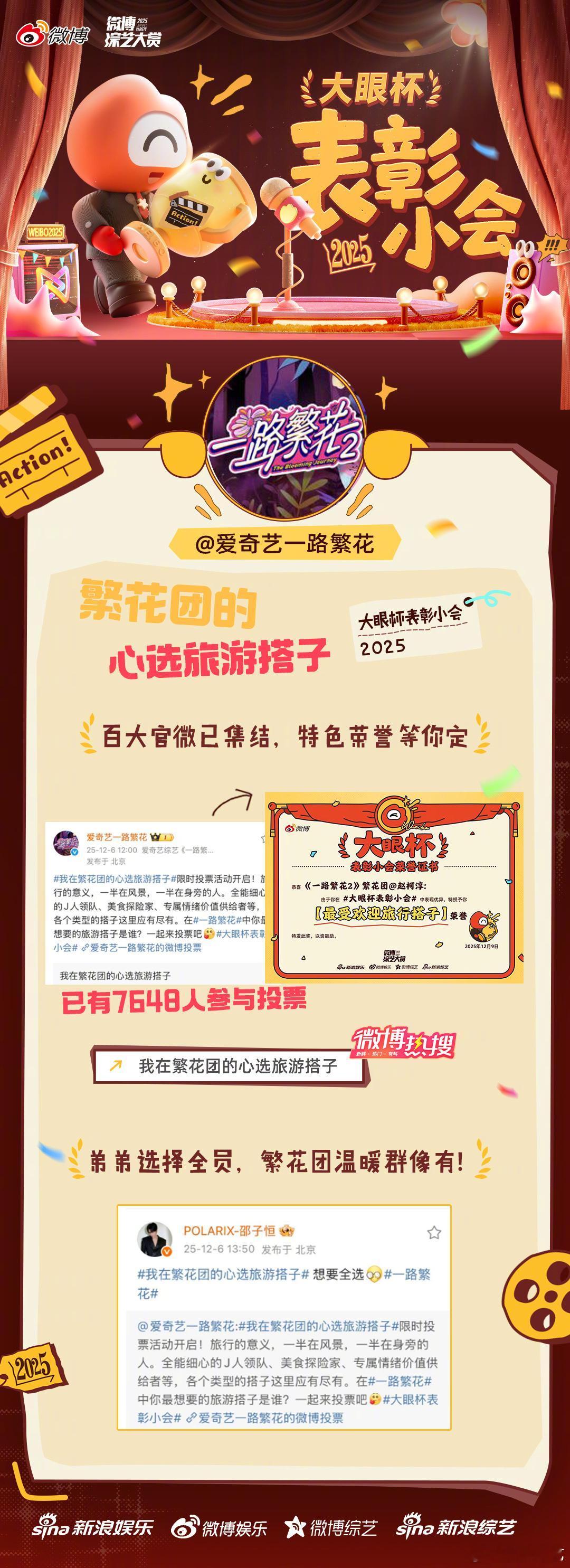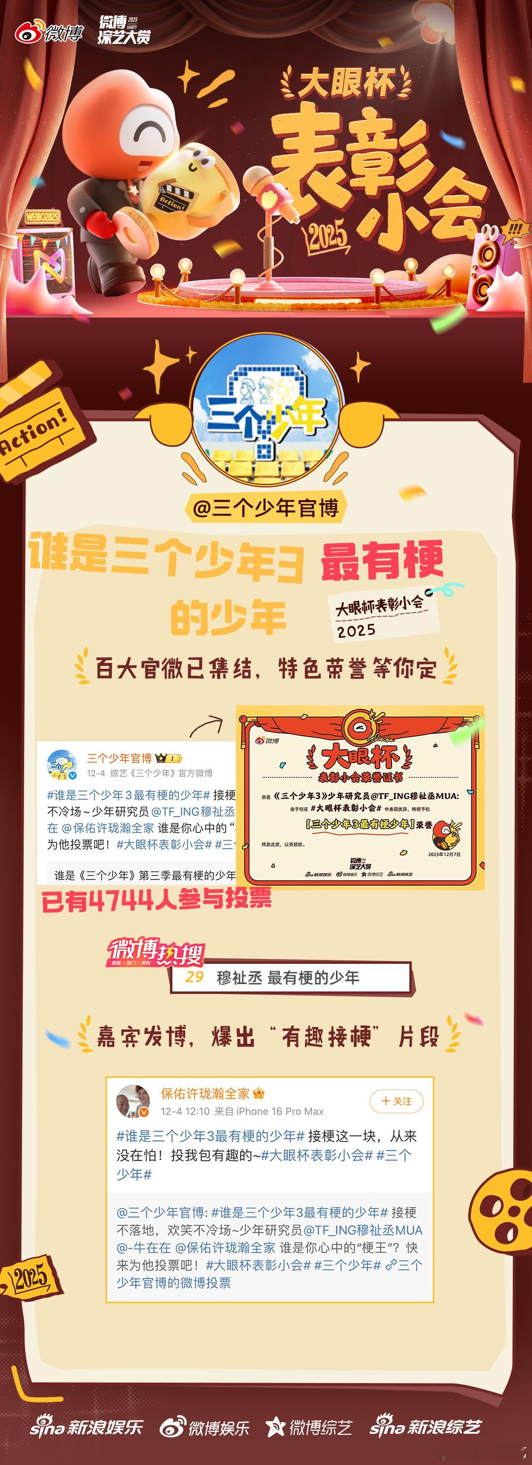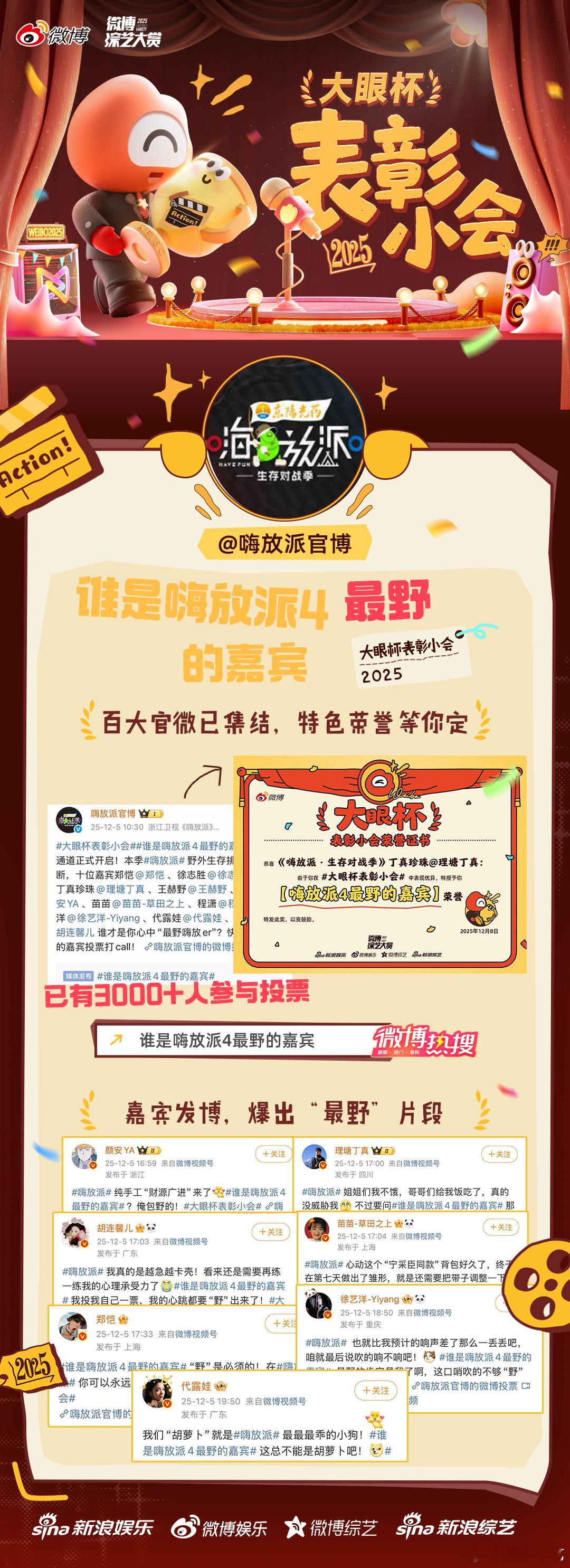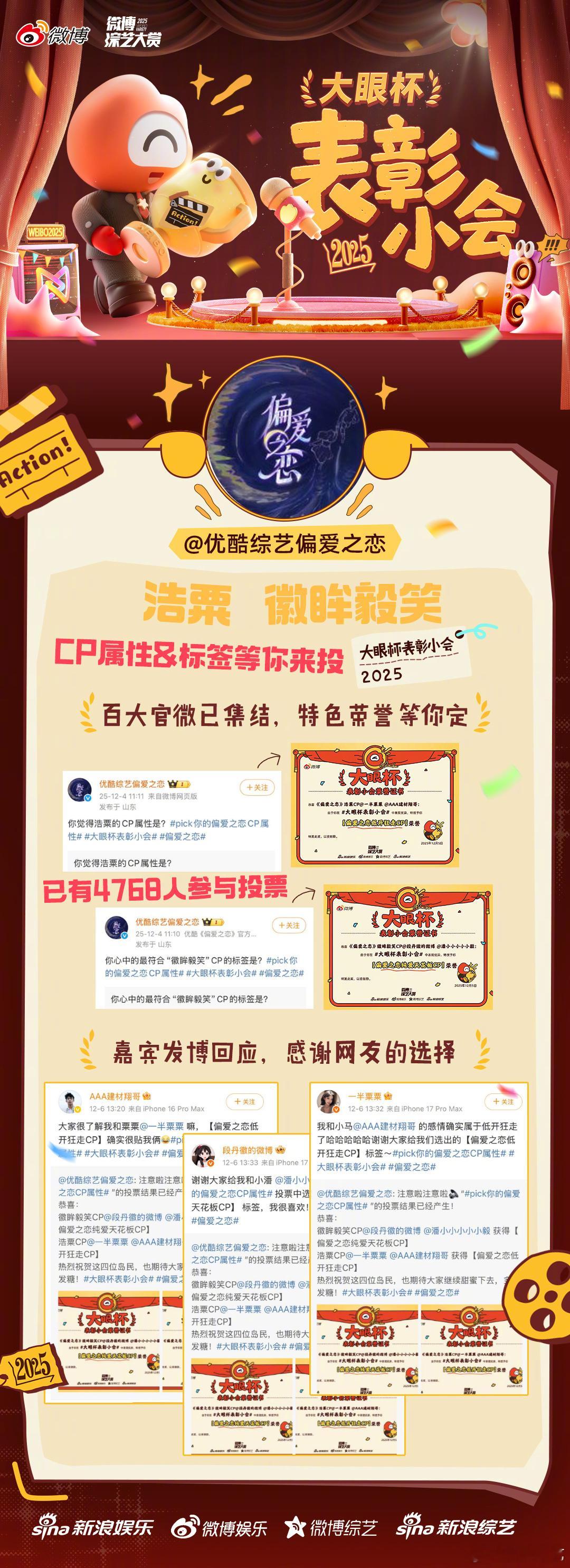 大眼杯表彰小会 来看看这些创意荣誉🏆花落谁家↓↓《奔跑吧》👉【宝藏旅行搭子】🎊《嗨放派4》👉【嗨放派4最野的嘉宾】🎊《偏爱之恋》“浩粟”CP“徽眸毅笑”CP👉【偏爱之恋纯爱天花板CP】🎊《三个少年3》👉【三个少年3最有梗少年】🎊《天赐的声音6》👉【声线自带单曲循环buff】🎊《现在就出发》👉【最想绑定的旅行伙伴】🎊《一路繁花2》👉【最受欢迎旅行搭子】🎊《声鸣远扬》8强表彰小会、《喜人奇妙夜2》金句热梗征集火热进行中,答案等你揭晓!百大官微、节目嘉宾、选手已集结,快来参与你最喜欢的创意表彰吧~