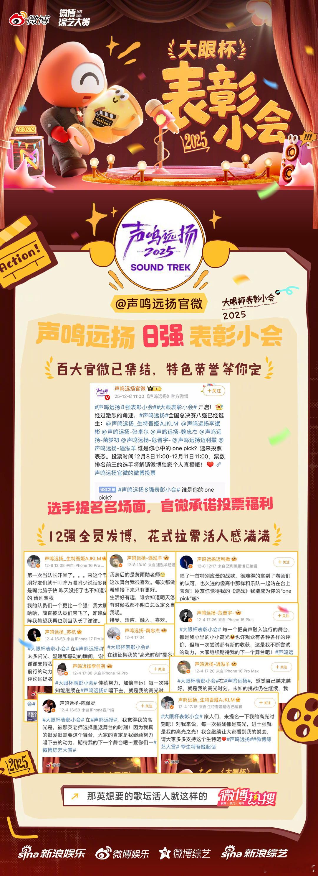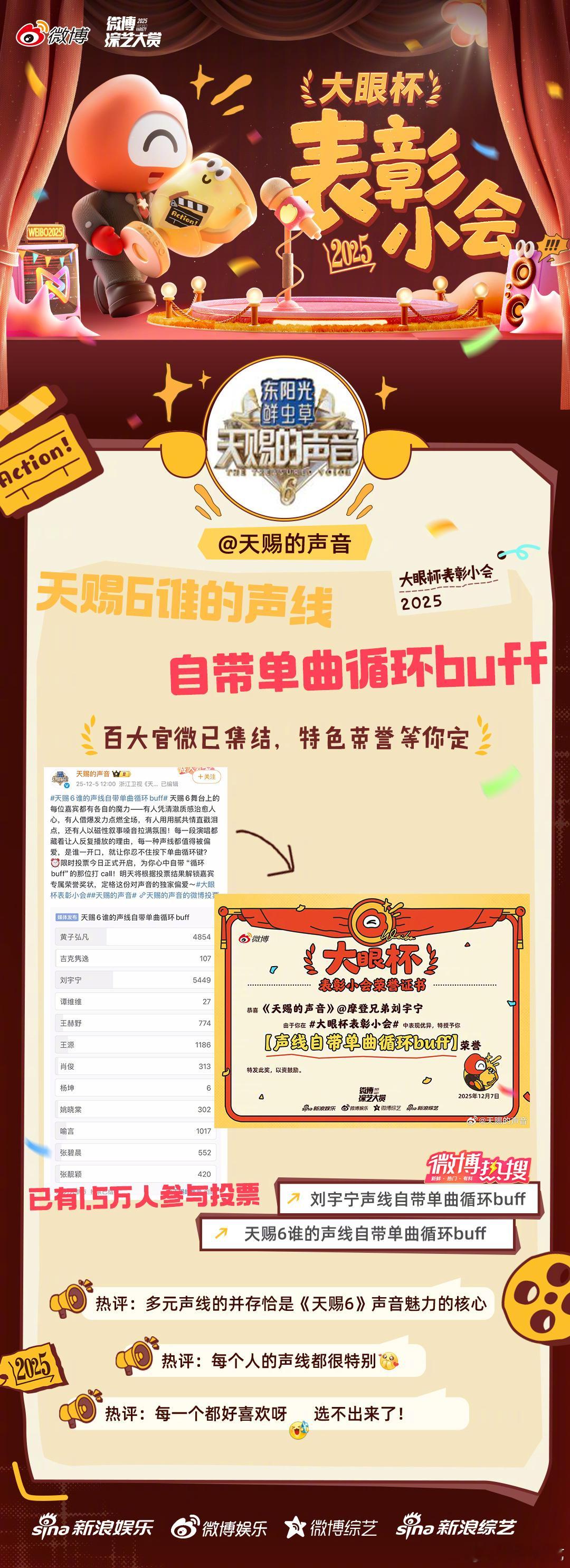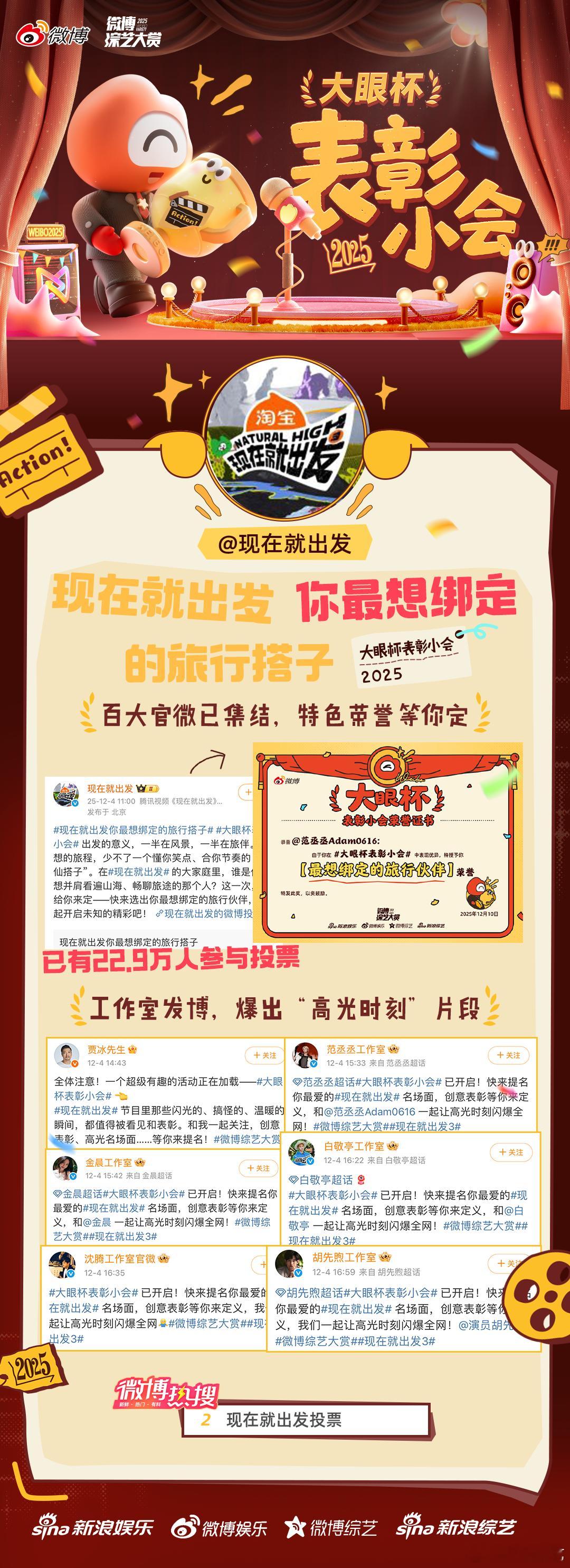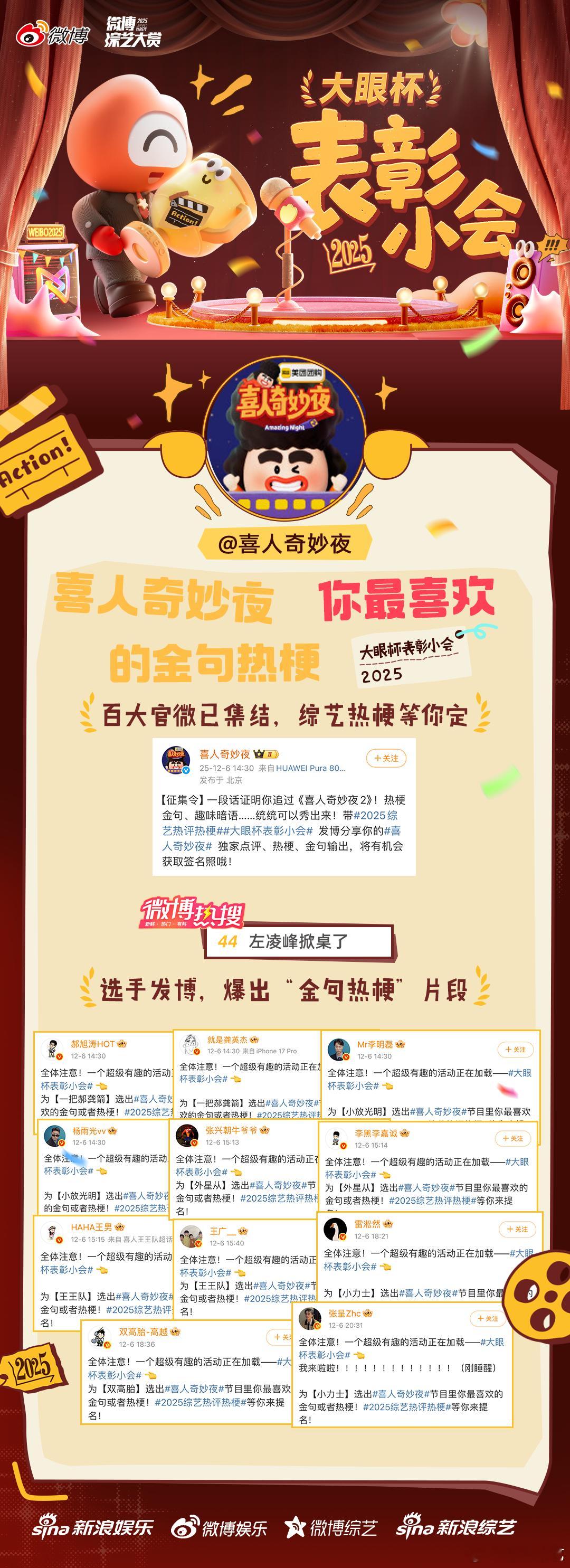 大眼杯表彰小会 来看看这些创意荣誉🏆花落谁家↓↓《奔跑吧》👉【宝藏旅行搭子】🎊《嗨放派4》👉【嗨放派4最野的嘉宾】🎊《偏爱之恋》“浩粟”CP“徽眸毅笑”CP👉【偏爱之恋纯爱天花板CP】🎊《三个少年3》👉【三个少年3最有梗少年】🎊《天赐的声音6》👉【声线自带单曲循环buff】🎊《现在就出发》👉【最想绑定的旅行伙伴】🎊《一路繁花2》👉【最受欢迎旅行搭子】🎊《声鸣远扬》8强表彰小会、《喜人奇妙夜2》金句热梗征集火热进行中,答案等你揭晓!百大官微、节目嘉宾、选手已集结,快来参与你最喜欢的创意表彰吧~