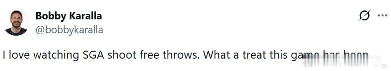 今日NBA常规赛,独行侠对阵雷霆的比赛正在进行中。目前,谢伊-吉尔杰斯-亚历山大投篮8中7,三分1中1,罚球10中9,得到24分3篮板5助攻1盖帽。比赛中,DLLS Mavs的独行侠记者Bobby Karalla更推,并写道:“看SGA罚球真是种享受。这场比赛太精彩了。”