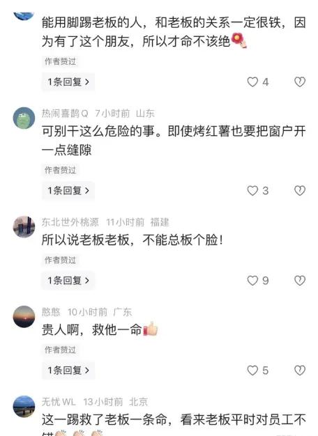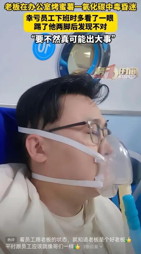 命这东西,有时候真就是一脚踢回来的!山东青州一老板,差点在办公室因烤红薯丢了命,谁能想到,救他的竟是员工下班时随口的吆喝和两脚无情踹? 炭火闷烧的一氧化碳,让老板血碳浓度飙到42%(超50可能致命),人彻底昏死。员工临走前多瞅一眼,吼一嗓子没反应,干脆踢了踢他鞋底。就这不礼貌的举动,愣是嗅出不对劲,抢在鬼门关前把人送医抢回一条命! 都说职场冷冰冰,可这老板能被踢,正说明人家平日不摆架子!网友锐评能随便踢老板的关系,才是救命底气。要我说,好人缘真是隐形护身符。你攒下的善意,指不定哪天就成了你的生机。 事儿火了后,全网炸出多少后怕案例。封闭空间烤火,取暖中毒…...专家连夜提醒!通风!通风!通风! 老板这回捡条命,不如直接给员工颁个救命恩人奖?