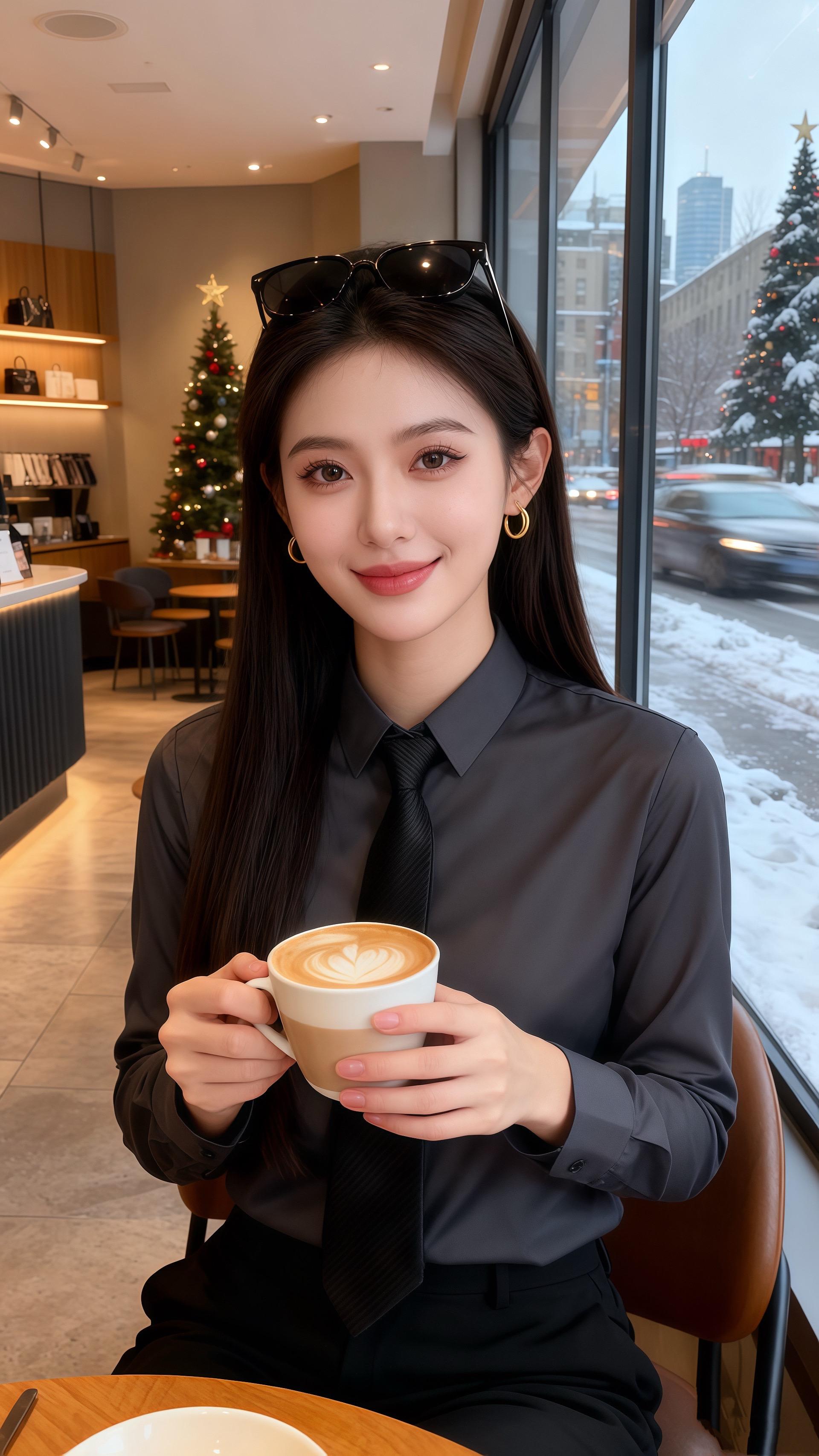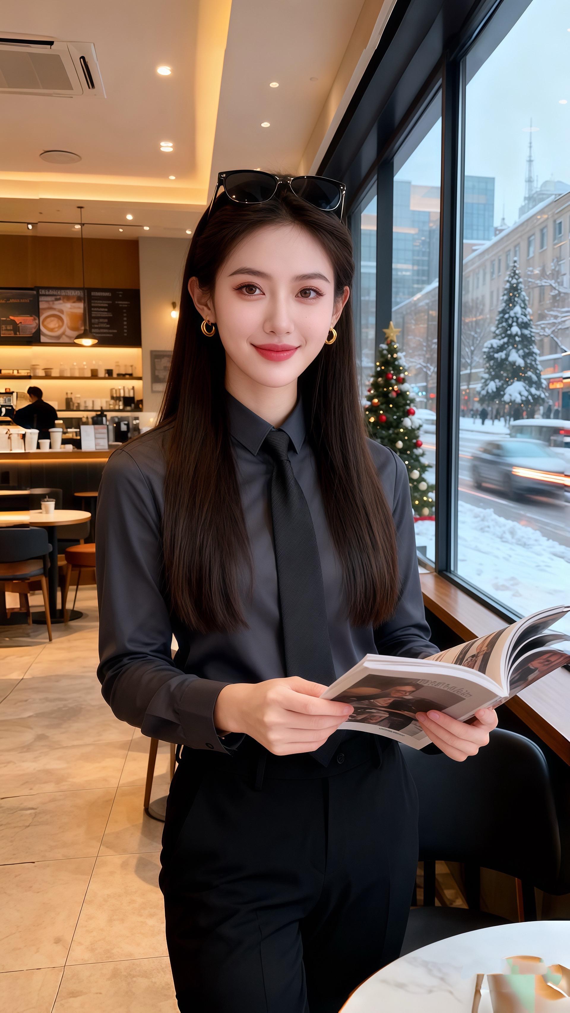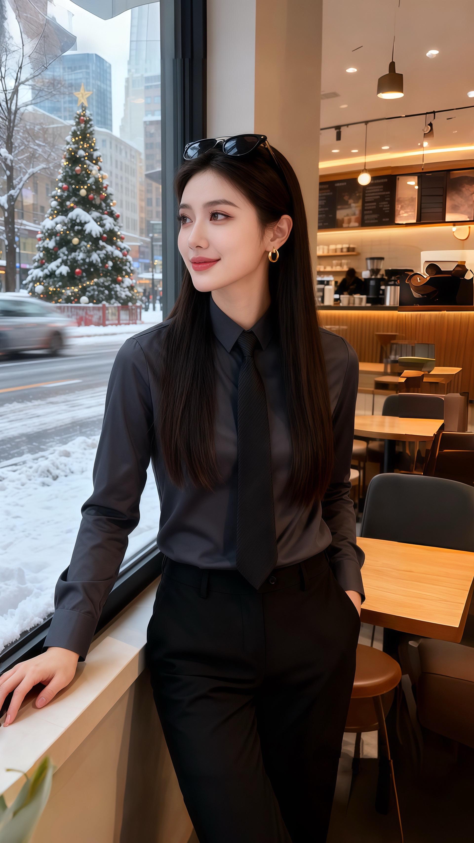 她穿深灰色缎面衬衫,配同色系细领带,领口收得利落,衬得脖颈线条清隽又温柔。黑色西裤贴合身形,裤线笔直得像裁纸刀刻出来的,和衬衫的哑光质感呼应,冷调的搭配却被她腕间细金镯揉进了几分暖。墨镜架在乌黑的发顶,碎发贴著鬓角,金环耳饰在窗边的光里晃出细碎的亮,中性的穿搭被她穿出了柔中带刚的味道,像冬日里融了奶泡的拿铁,甜醇里藏着清苦的层次。