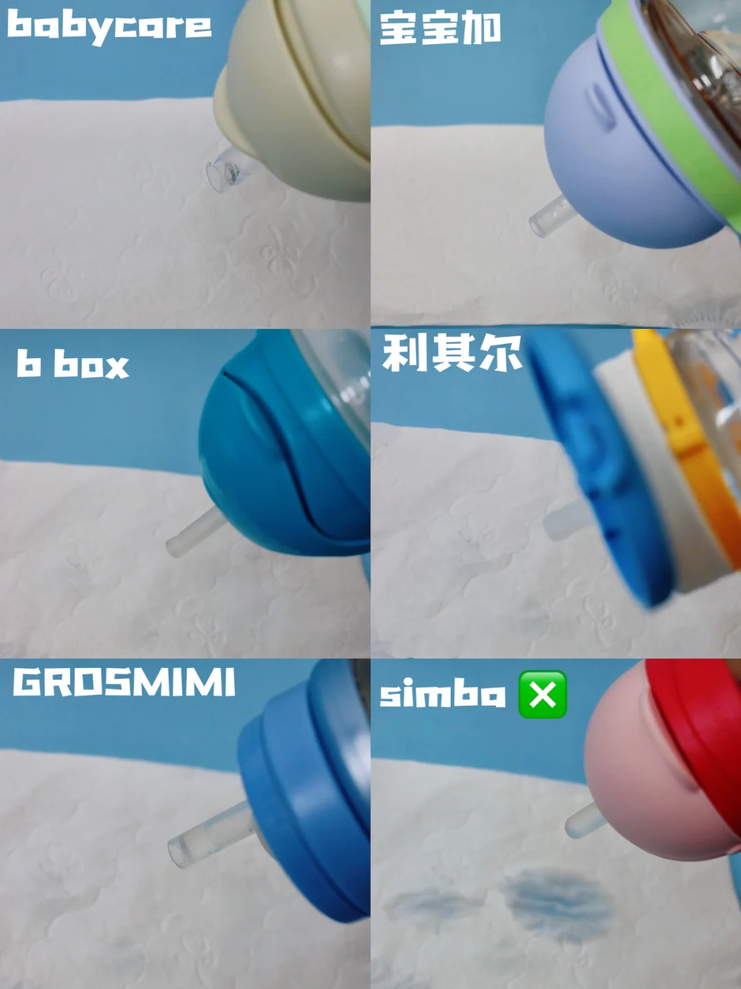 把6款学饮杯倒过来拿着,simba漏水比较严重,其他5款都未漏水