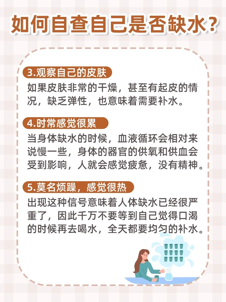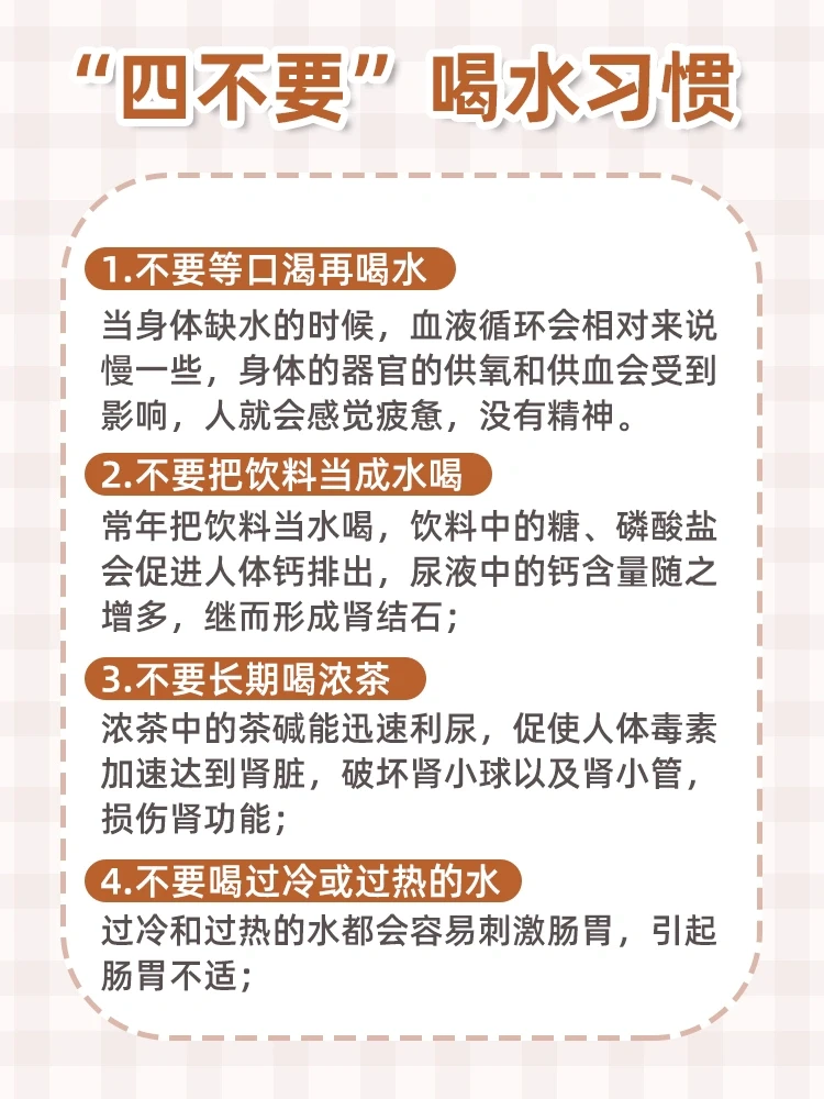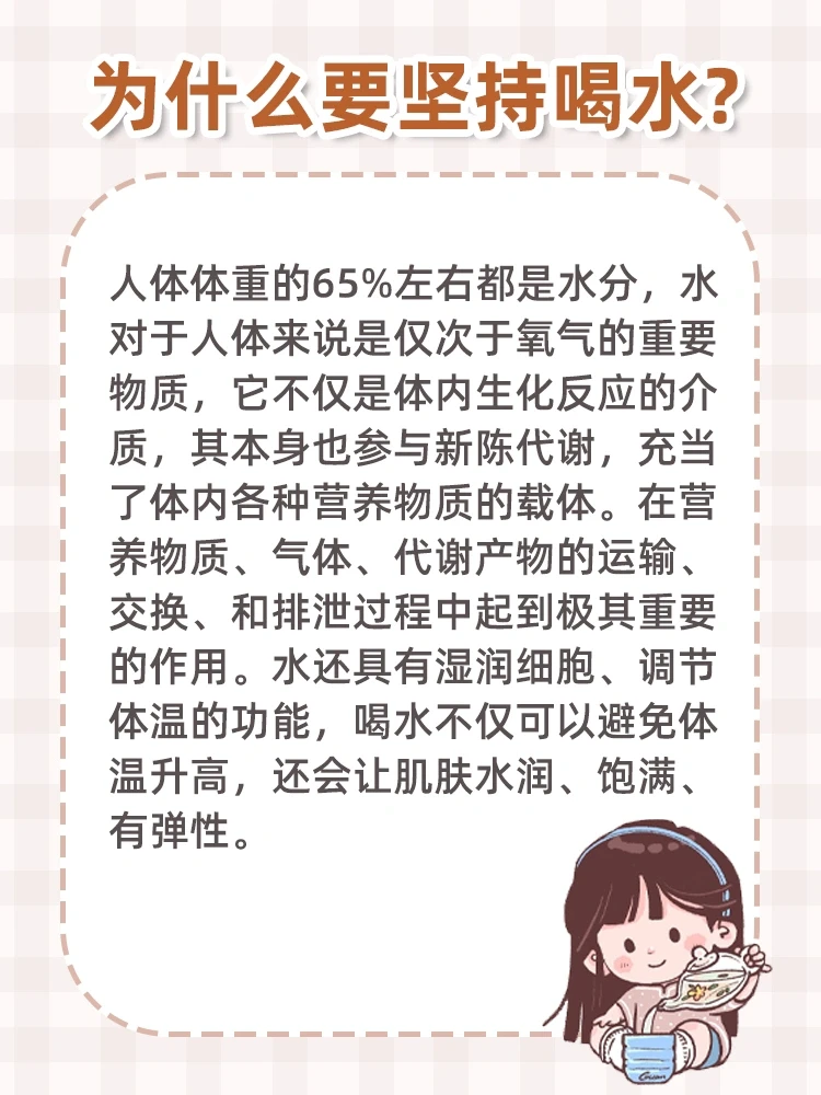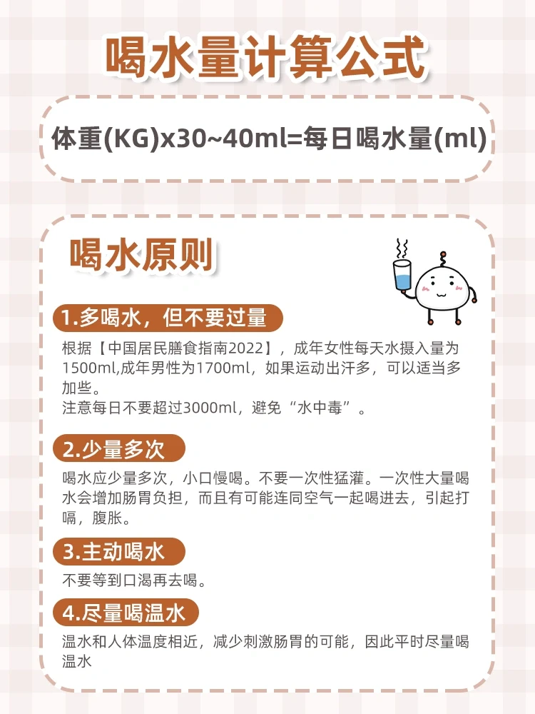📝人体中有60%~70%是水分,人体含水量达到90%以上,喝水是生命不可或缺的行为[赞R]喝水量可以根据自己的情况酌量增减~ 今天教你如何正确喝水[偷笑R] ✅为什么要坚持喝水? ✅每天8杯水这是真的吗? ✅如何自查自己是否缺水? ✅喝水量计算公式 ✅喝水量计算公式 ✅四不要喝水习惯