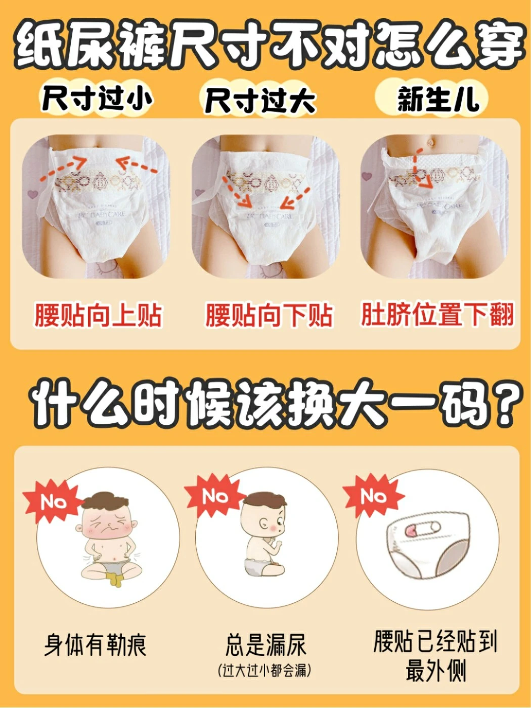 🔹尺寸不适合:过大或过小都会出现漏尿,选纸尿裤是先参考体重,后参考体型。