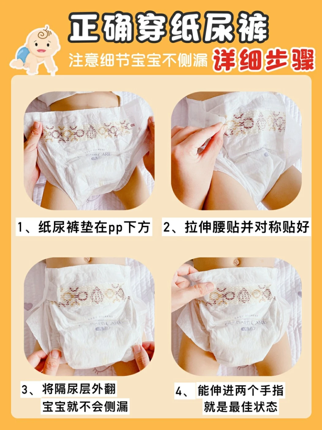 🔹穿法有错误:纸尿裤环贴要左右对称,穿好后以能伸进两个手指为好,隔尿层要外翻;