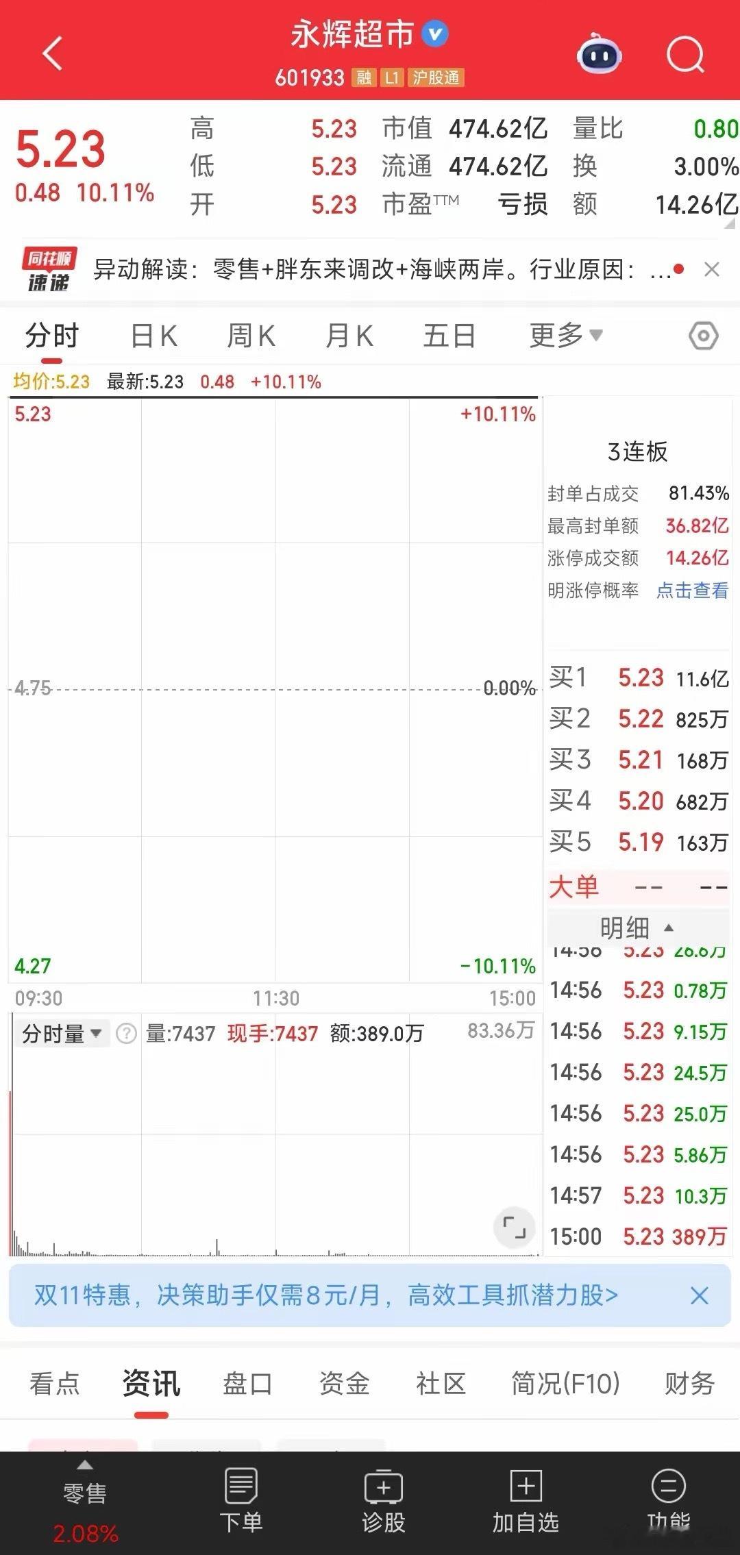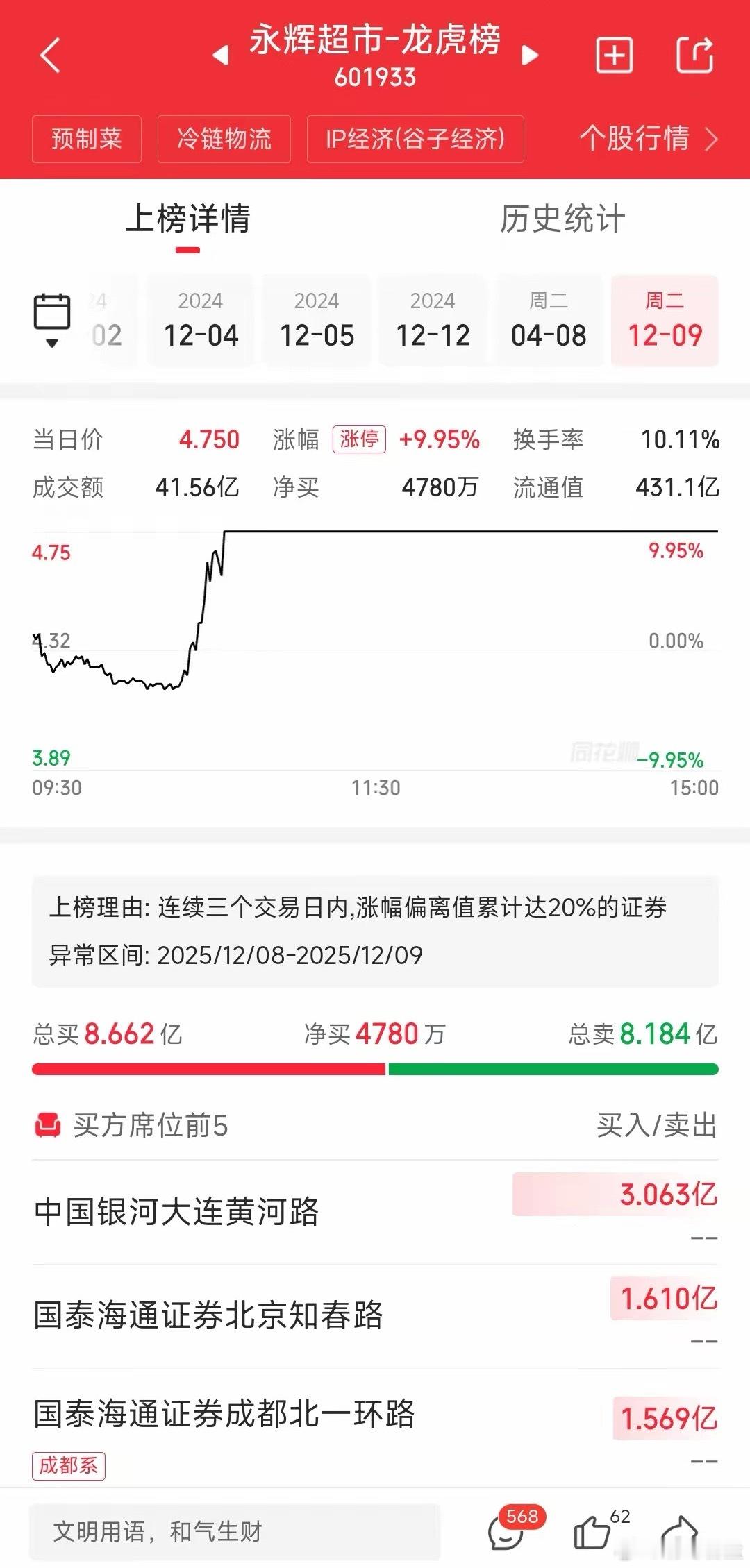 A股今天最强的票诞生了陈小群3亿杀入,打造消费股新的龙头该票竞价一字涨停,全天都没炸过一次板成交额14.26亿,买一的位置还有11.6亿昨日龙虎榜显示,陈小群席位中国银河大连黄河路,净买入3.063亿就是在二板的时候顶一字进的由于位置在低位,再加上游资的号召力引来了大批散户接力不管怎么说,二近三成功了能走多远就是市场决定得了还是要恭喜吃大肉的股友