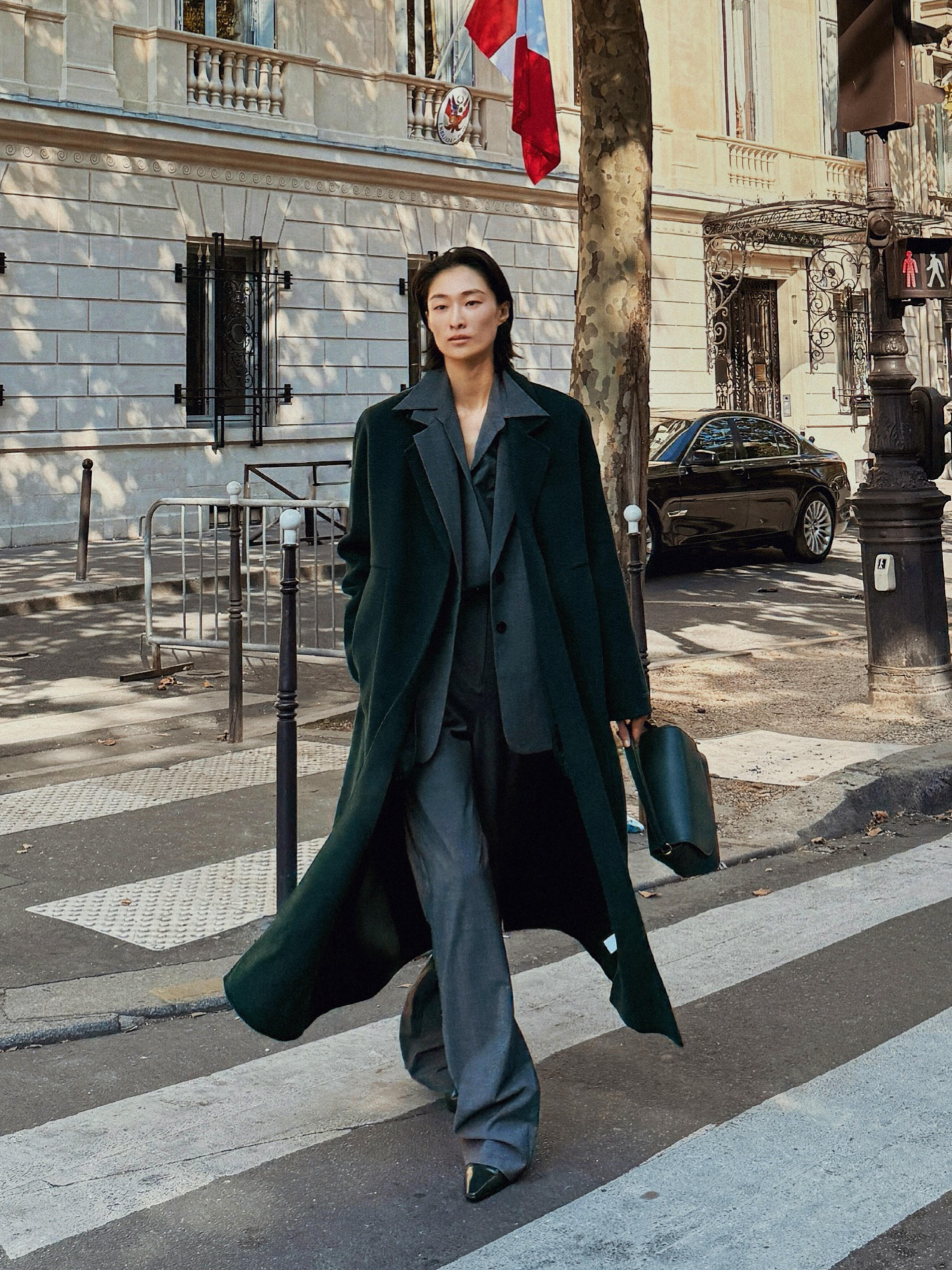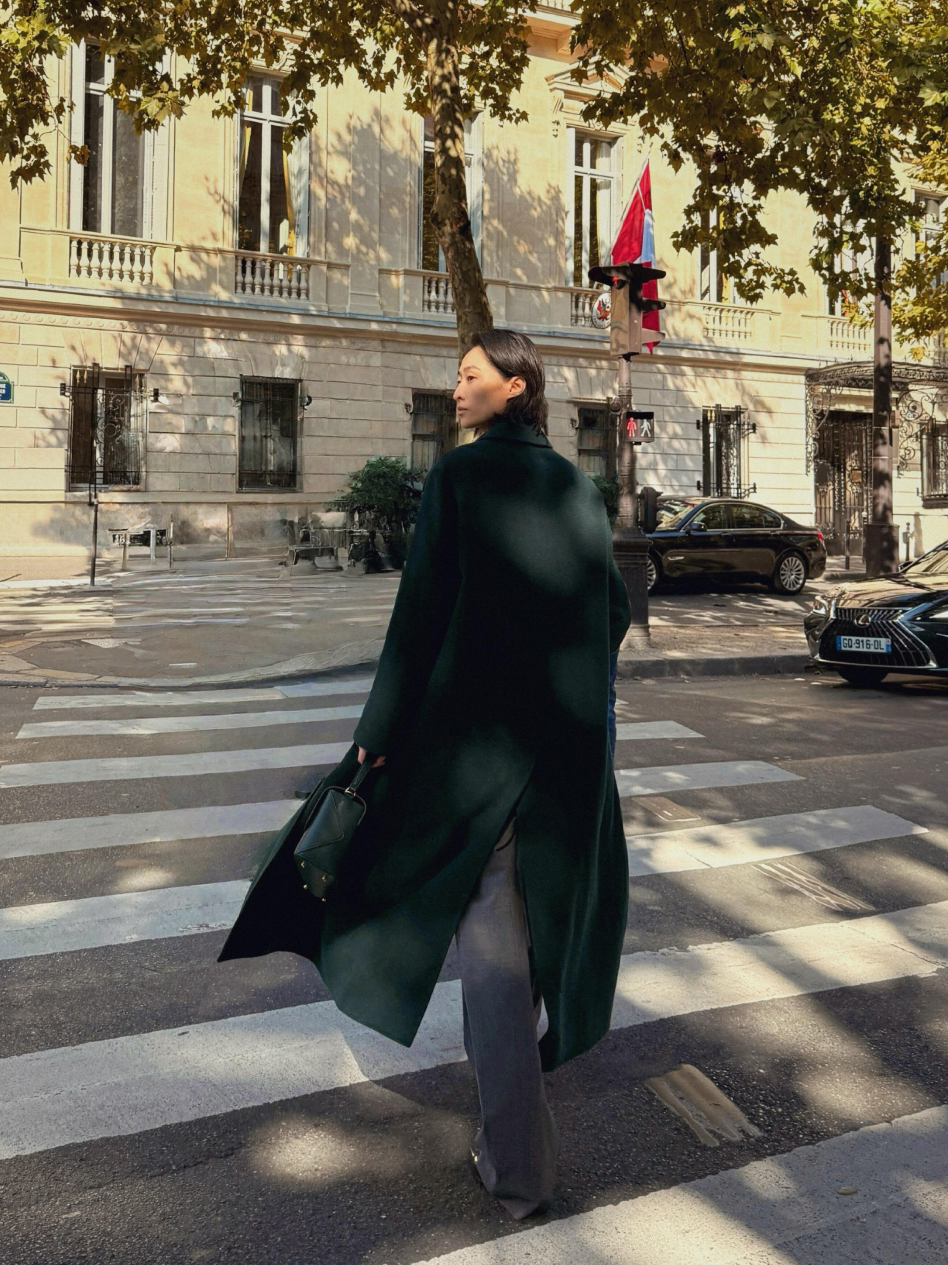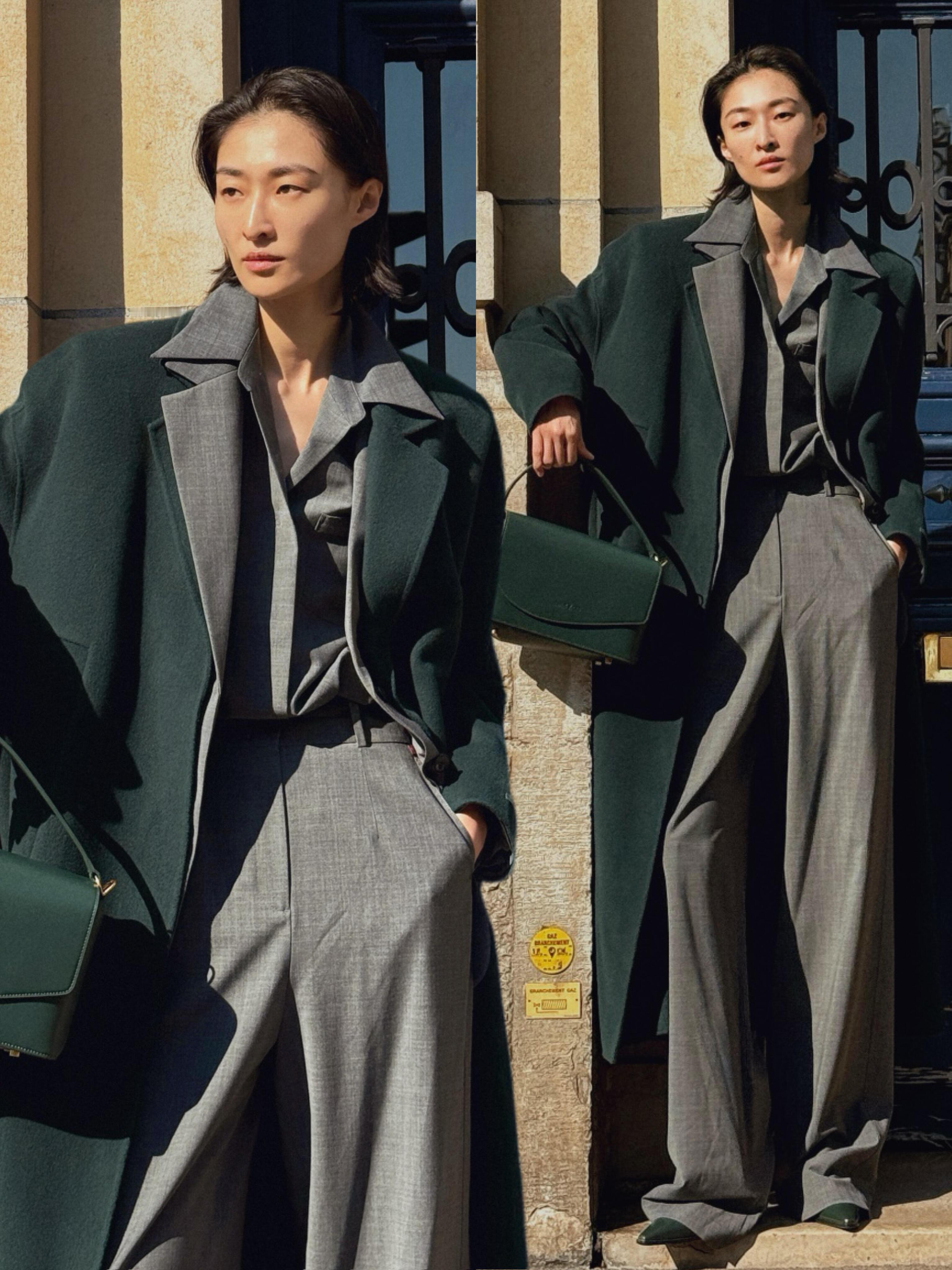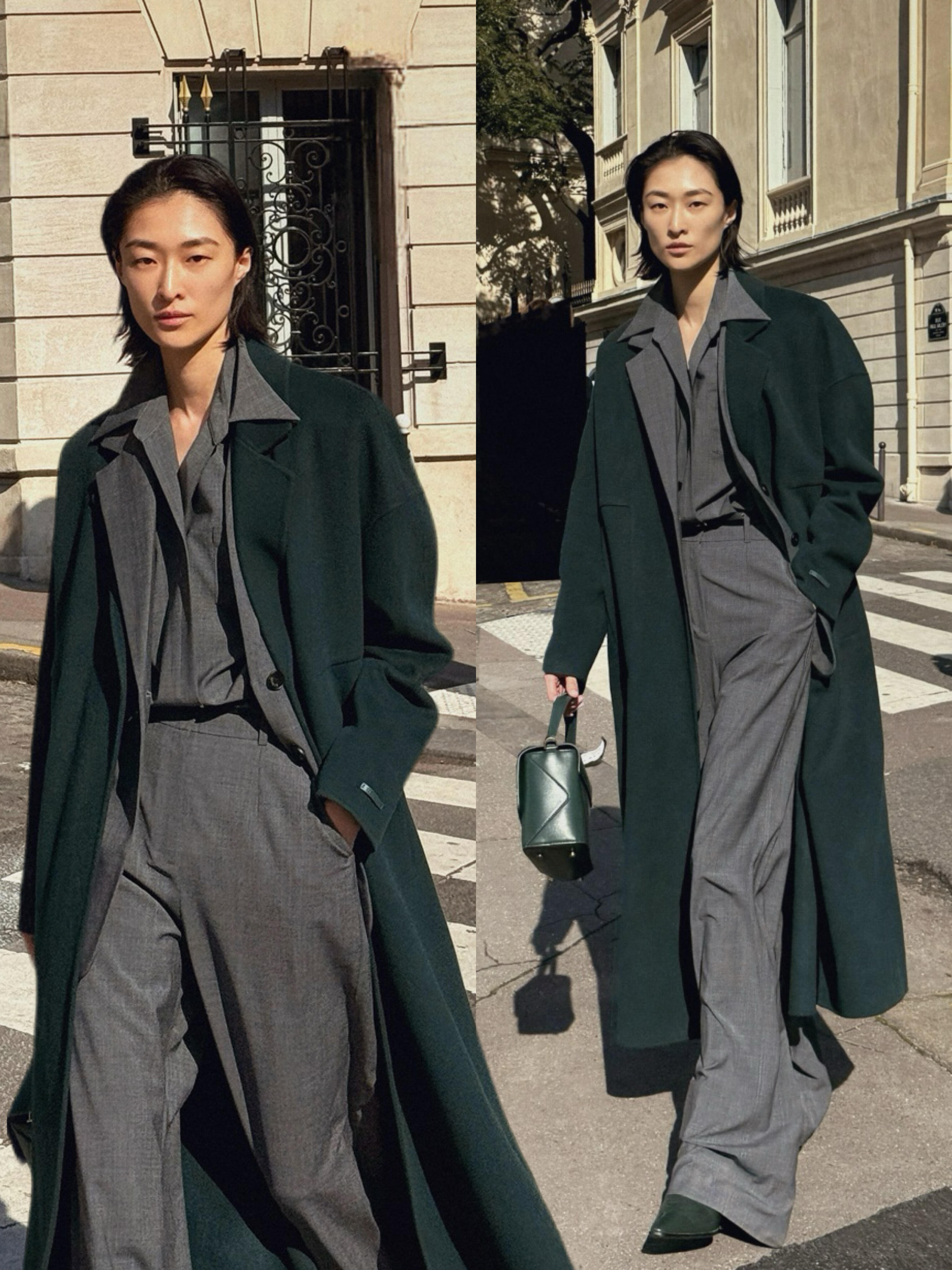 风格大赏都市户外风汪曲攸这组巴黎街拍把“高智极简风”焊在身上了。深墨绿长大衣+灰调同色系套装,配色高级又沉稳,宽肩廓形衬得气场全开,内搭衬衫的翻领叠在大衣领外,细节里全是松弛的精致感。搭配也够克制:同色系墨绿手提包和尖头鞋首尾呼应,没有多余装饰,全靠材质的质感(大衣的绒面、衬衫的垂感)撑住氛围。走在巴黎街头自带“不费力的高级”,既把奈蔻系列的“自适力量感”穿出来,又衬出她本身冷静又松弛的超模气质。