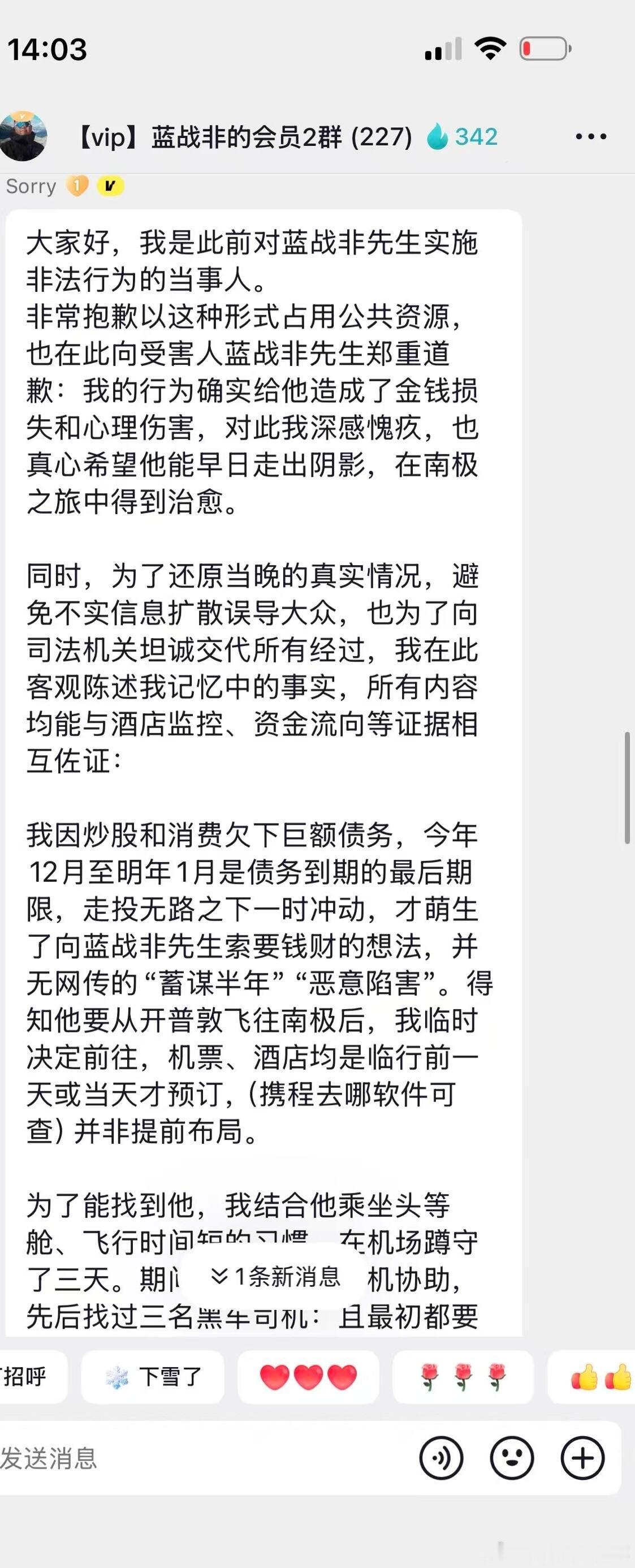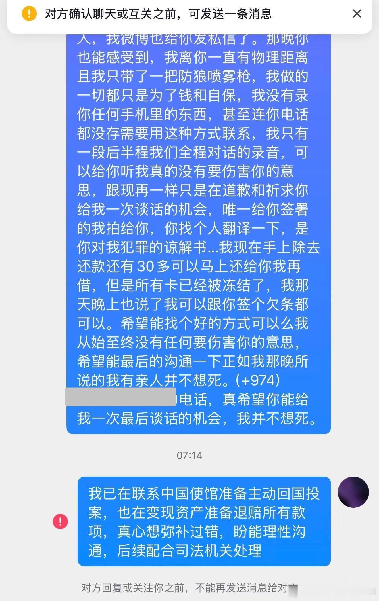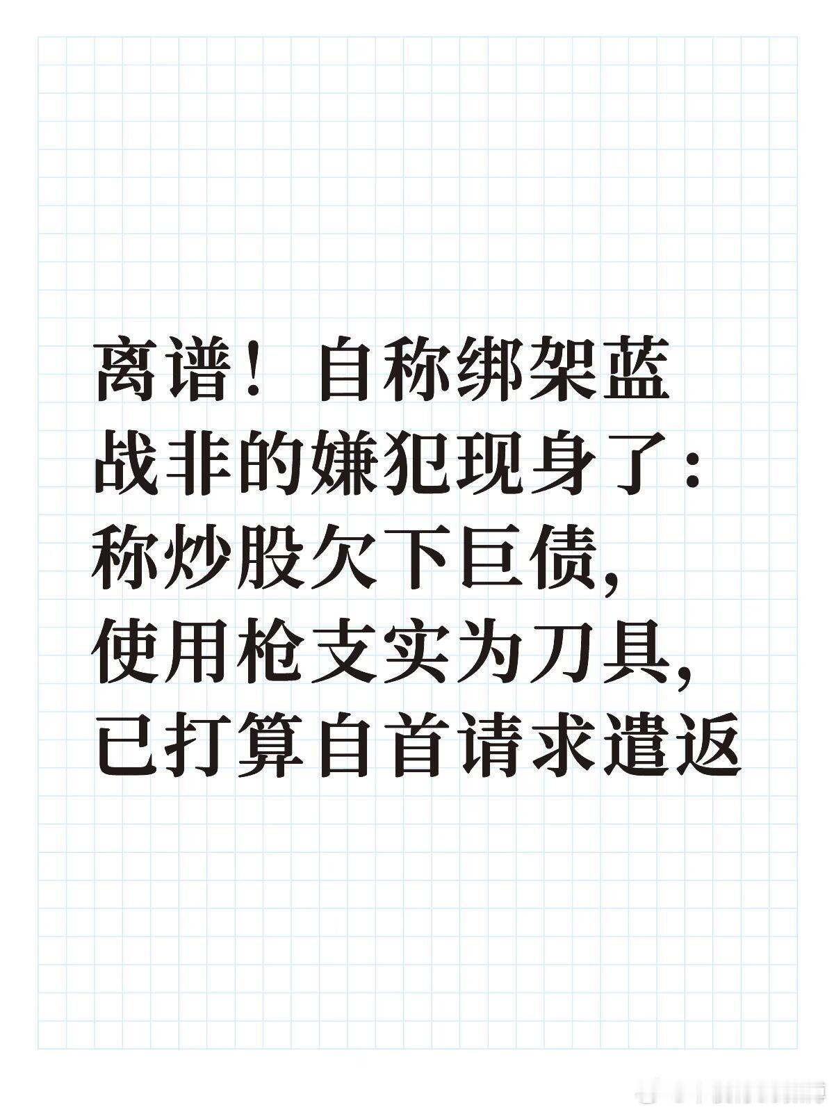 离谱!自称抢劫蓝战非的嫌犯主动现身……刚刚社群刷到了惊天大瓜,聊天记录显示,那个绑架抢劫了蓝战非的人主动在网上现身忏悔了。他说自己是炒股和消费导致巨债缠身,然后得知蓝战非的行踪后,提前3天去往开普敦筹划。最后是他一个人冒充蓝战非去前台补办了房卡。根据他的说法,他没有持刀威胁蓝战非,只拿了一个防狼喷雾,全程没有肢体接触。最后拿到钱是两笔,加起来正好是108.8万。事发后他给蓝战非私信希望私了,愿意退钱,没有得到蓝战非的回应后,目前已打算向卡塔尔中国大使馆自首了。热点观点华俊竹有话说