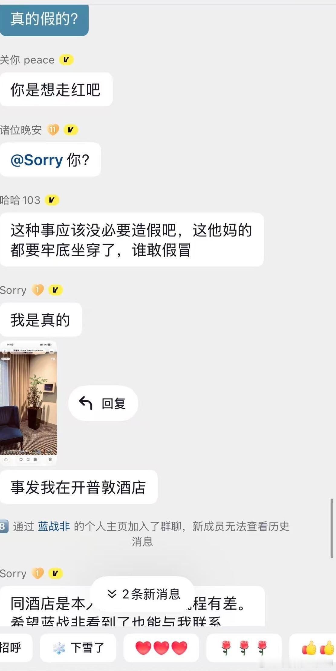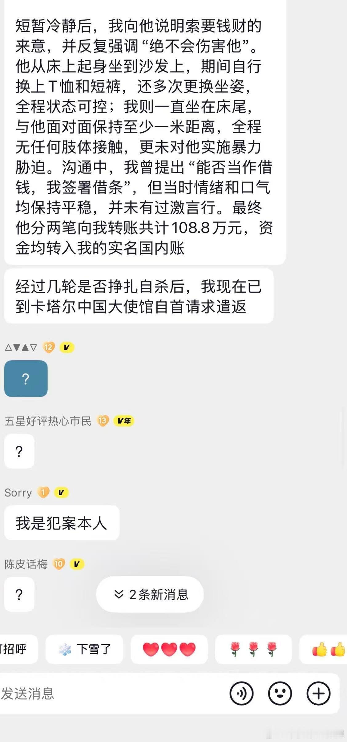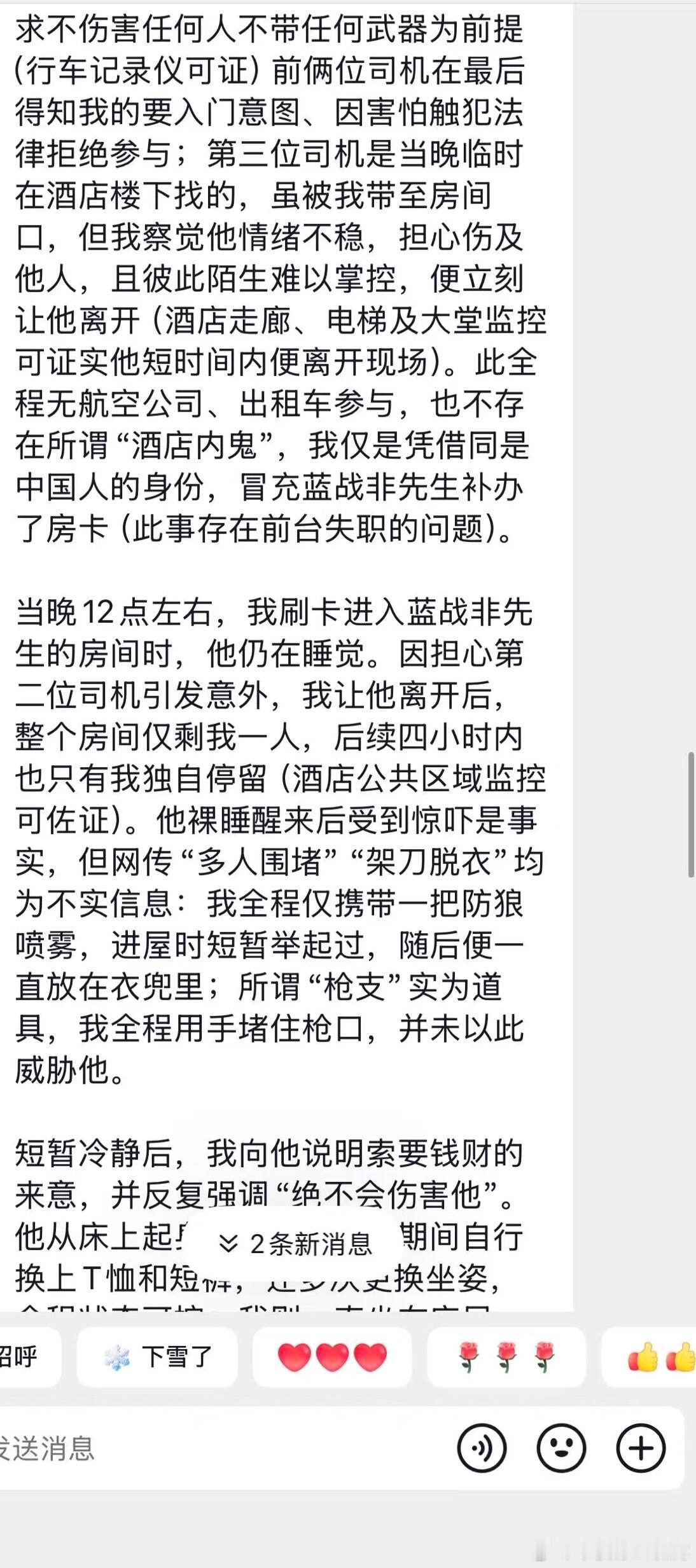 离谱!自称抢劫蓝战非的嫌犯主动现身……刚刚社群刷到了惊天大瓜,聊天记录显示,那个绑架抢劫了蓝战非的人主动在网上现身忏悔了。他说自己是炒股和消费导致巨债缠身,然后得知蓝战非的行踪后,提前3天去往开普敦筹划。最后是他一个人冒充蓝战非去前台补办了房卡。根据他的说法,他没有持刀威胁蓝战非,只拿了一个防狼喷雾,全程没有肢体接触。最后拿到钱是两笔,加起来正好是108.8万。事发后他给蓝战非私信希望私了,愿意退钱,没有得到蓝战非的回应后,目前已打算向卡塔尔中国大使馆自首了。热点观点华俊竹有话说