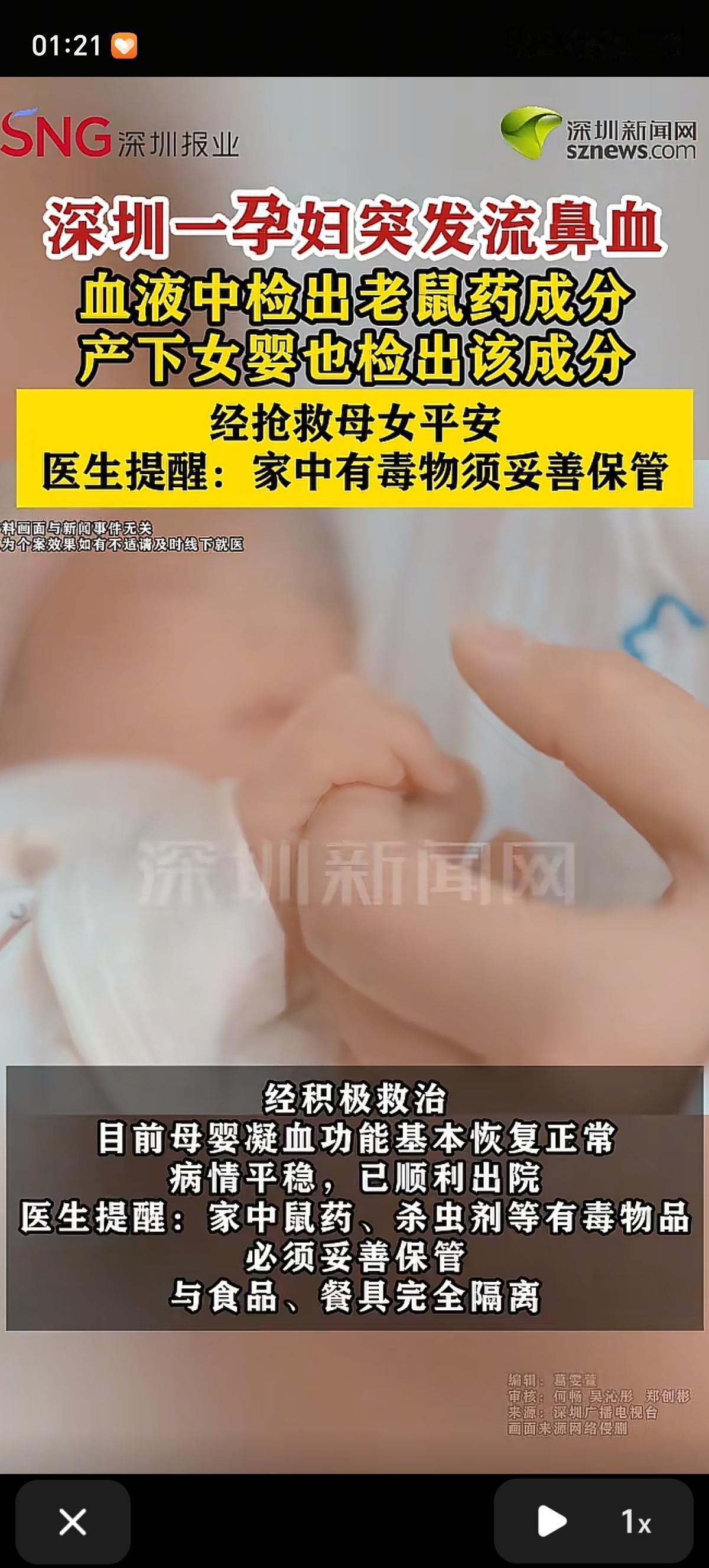 这是把老鼠药当调味料炒菜了还是当粗粮煮了?深圳35周孕妈妈老鼠药中毒,紧急剖宫产,新生儿的血液中也有老鼠药成分。 深圳一怀孕35周的女子突然流鼻血,还伴有口腔粘膜糜烂、尿道刺痛的症状,孕妇头疼和小便疼受不住了,要去医院。 医生很快从孕妇的血液和尿样里查出了杀鼠灵,也就是老鼠药的成分。直接给孕妇剖宫产了,就连宝宝的血液和尿样里都有老鼠药的成分,万幸救治及时,母子平安。 幸好以前加强版的老鼠药不让卖了,现在的老鼠药对老鼠效果不是那么立竿见影!