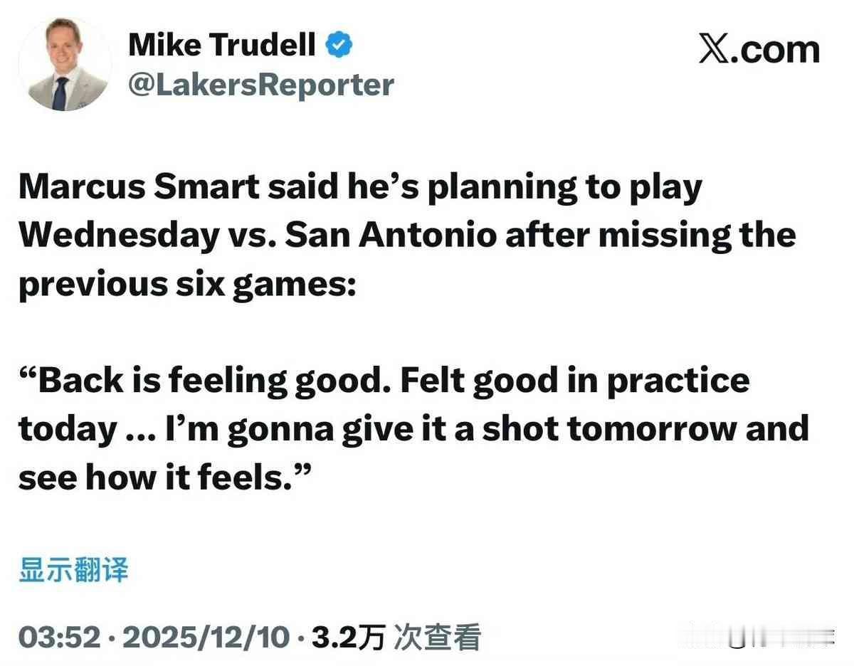 背部痉挛歇了六场,结果训练感觉良好。 斯玛特复出的消息出来了,计划打明天对马刺的比赛。媒体问他伤势,他说背部感觉很好,训练也不错,休战是队医和教练组的决定。明天这场是季中锦标赛八强战,赢球每人能拿10万美金,湖人需要他回来。 看起来是斯玛特伤了,湖人谨慎使用。但细琢磨一下,味儿不对。如果真为了健康,完全可以多歇两场。为什么偏偏挑这场奖金丰厚的锦标赛复出?这不就是看菜下饭么。常规赛可以打打停停养着,到了这种有钱拿的关键局,就得派上来干活。 这根本不是球员健康管理,这是资产效益最大化。斯玛特在湖人眼里,更像一台精密仪器,而不是一个活生生会累会疼的运动员。平时省着用,关键时候开足马力,确保季后赛能满血输出。这套操作逻辑,跟保养一台跑车没区别,定期维护,大赛才拉出来飙。 健康很重要,但把健康纯粹当筹码来算计,那股劲儿就变了。 球队的算盘打得响,球员的背,谁真的在乎?