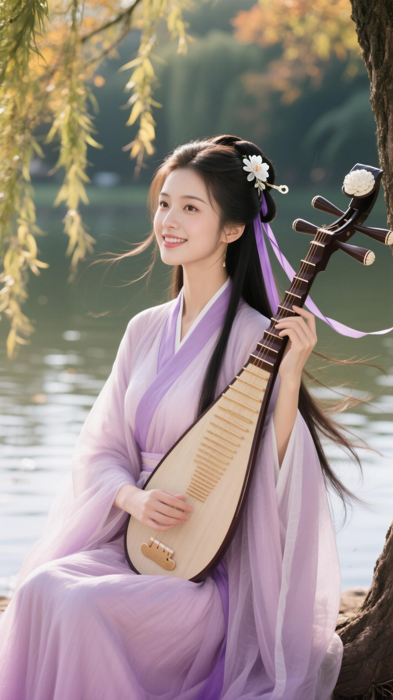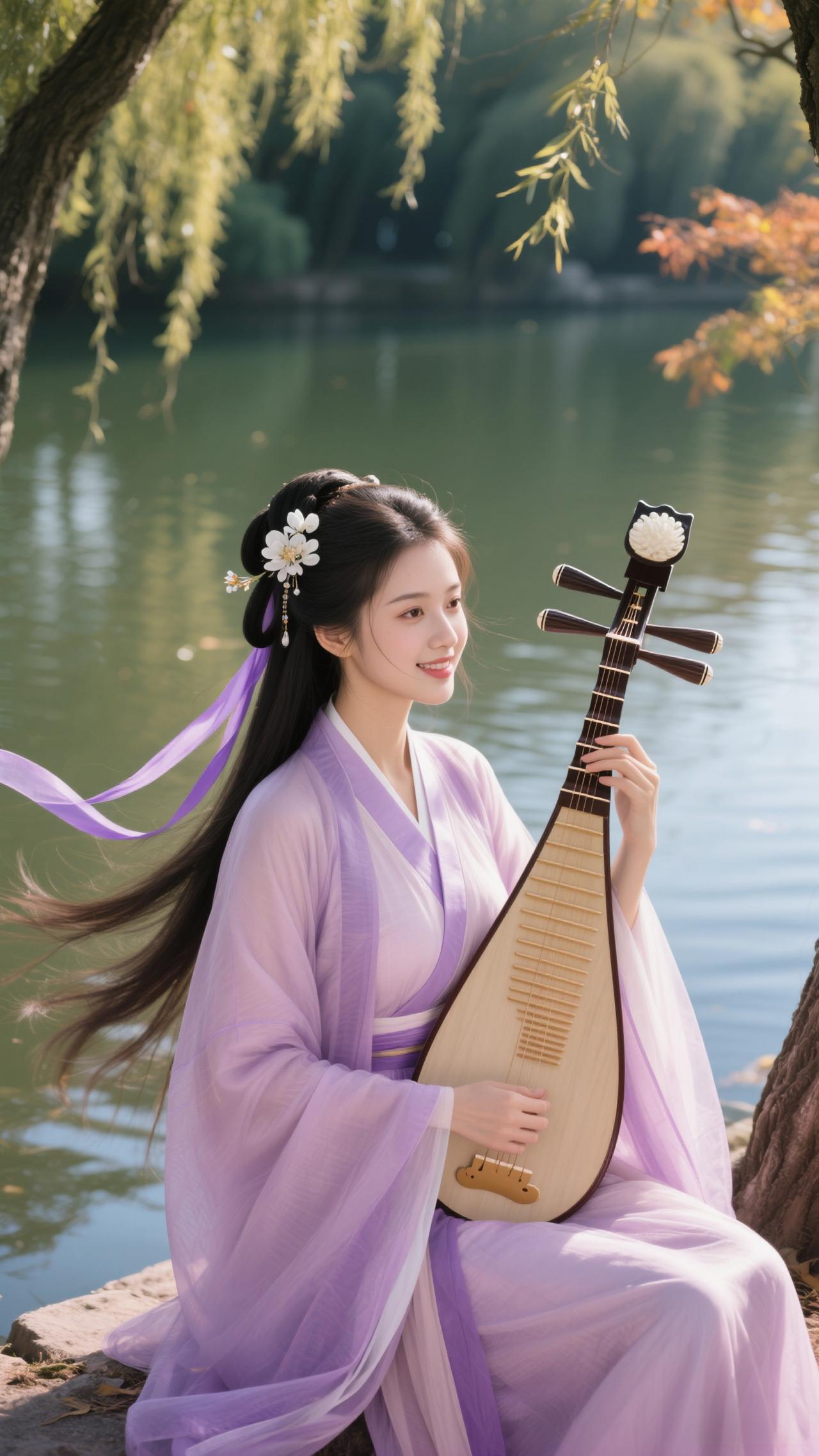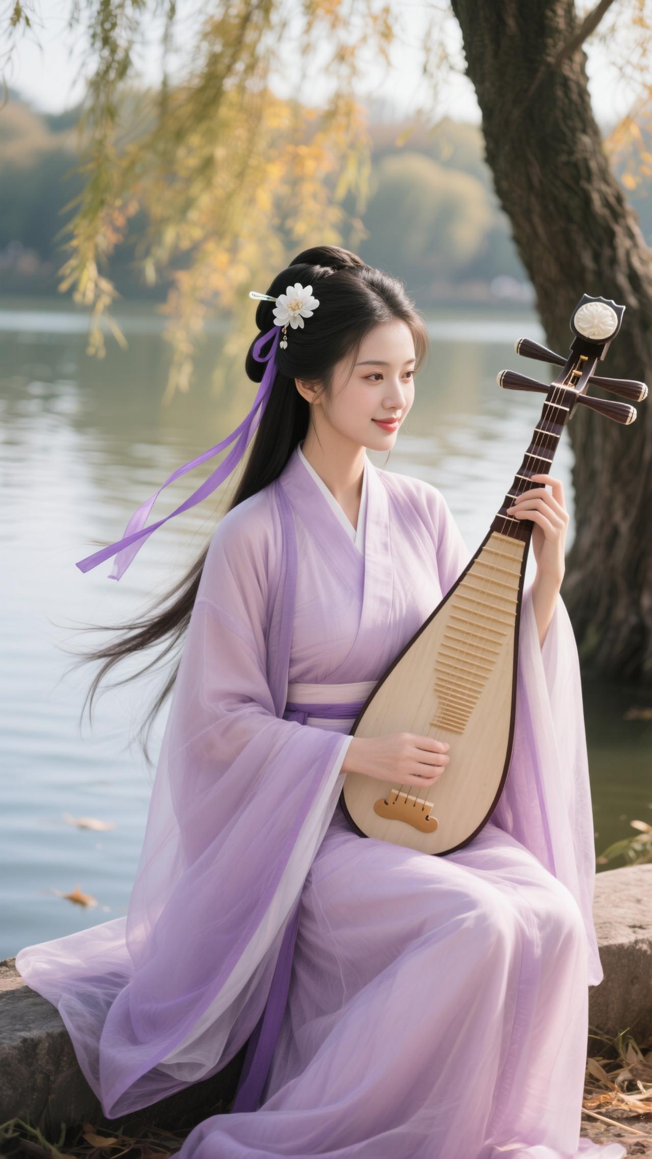 《鹧鸪天·秋湖弹琵琶》 紫袂轻笼柳岸风,琵琶半抱落霞中。 鬓边花颤随波软,袖底香浮与水融。 弦未动,意先慵,秋光漫浸玉颜红。 一湖云影分襟坐,笑入清波第几重?