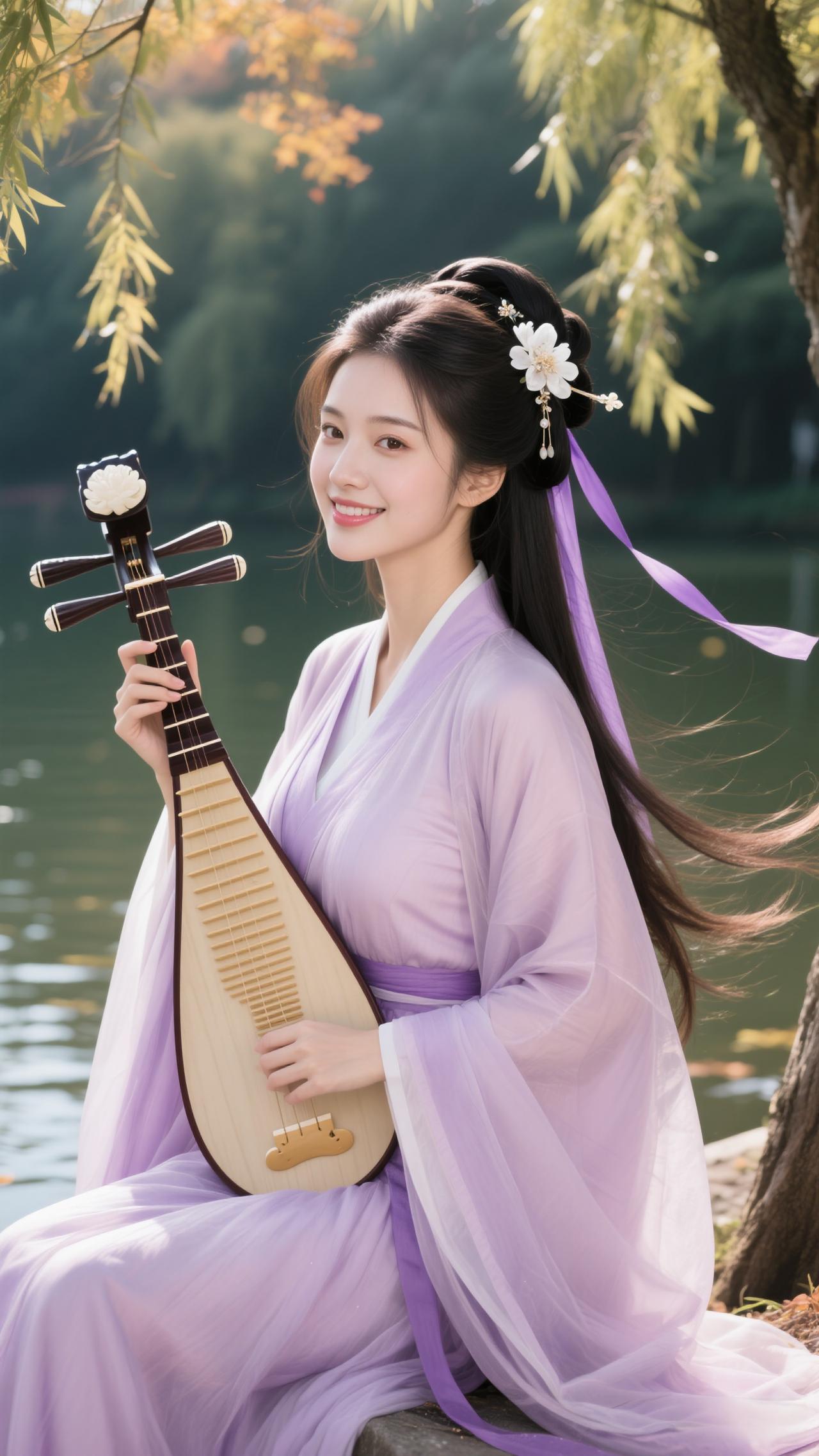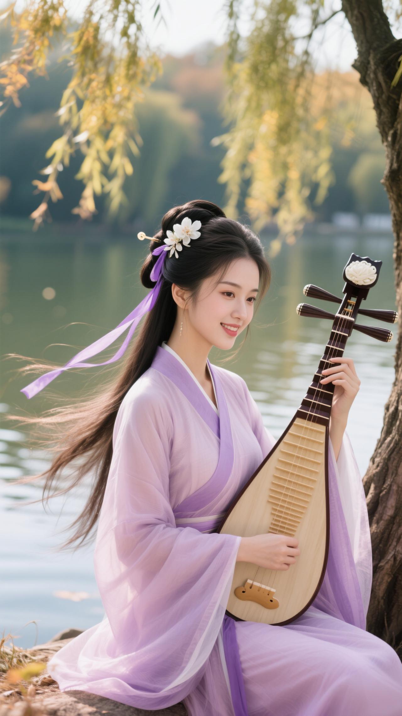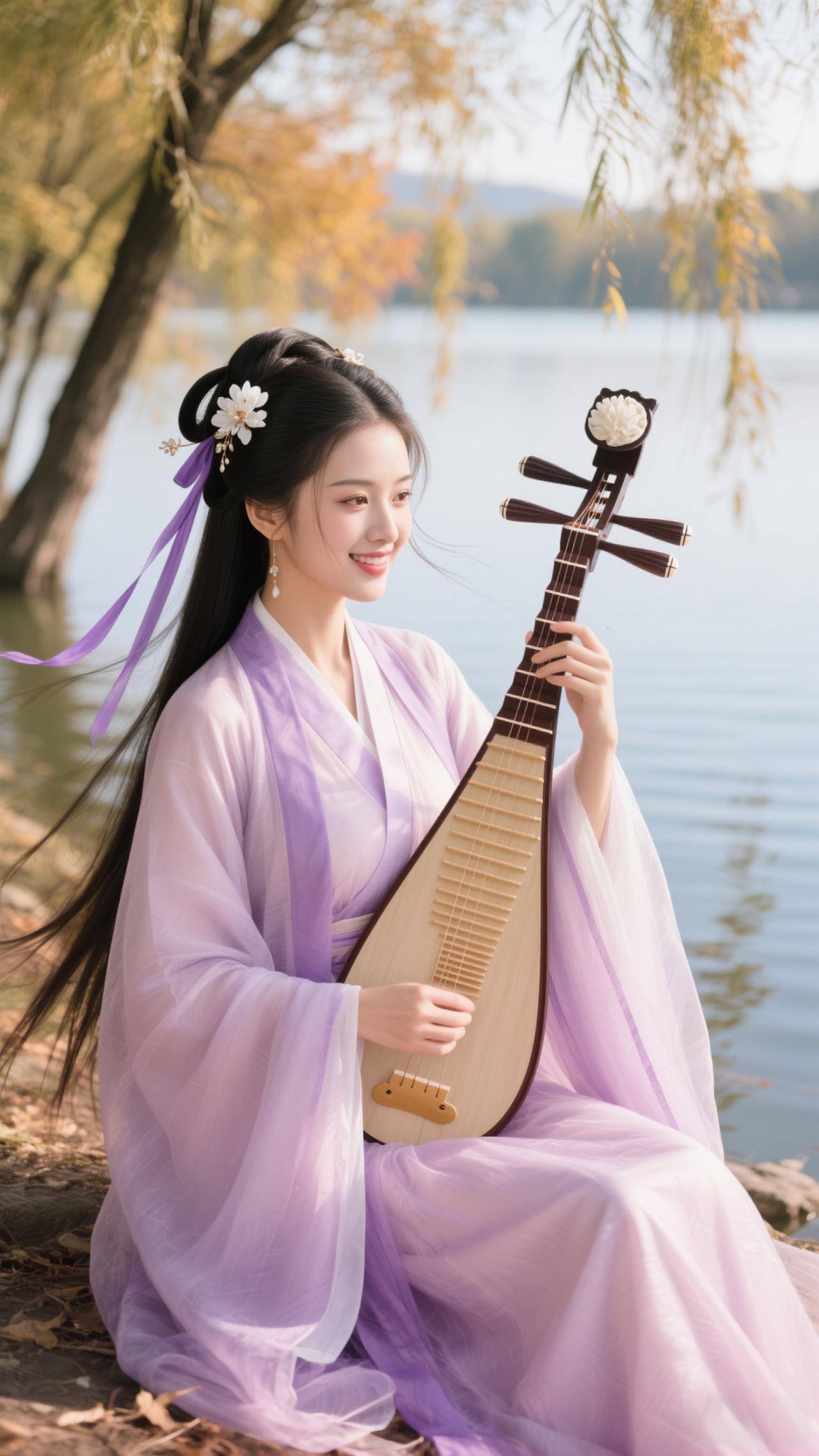 《鹧鸪天·秋湖弹琵琶》 紫袂轻笼柳岸风,琵琶半抱落霞中。 鬓边花颤随波软,袖底香浮与水融。 弦未动,意先慵,秋光漫浸玉颜红。 一湖云影分襟坐,笑入清波第几重?