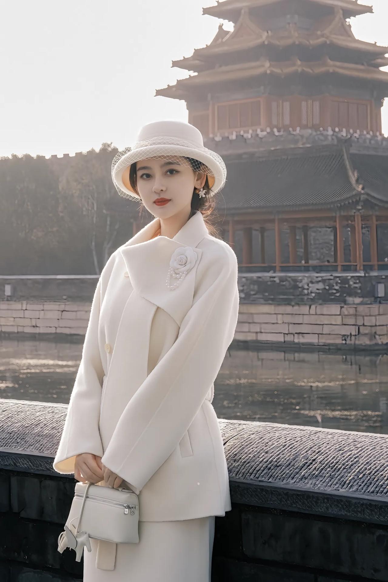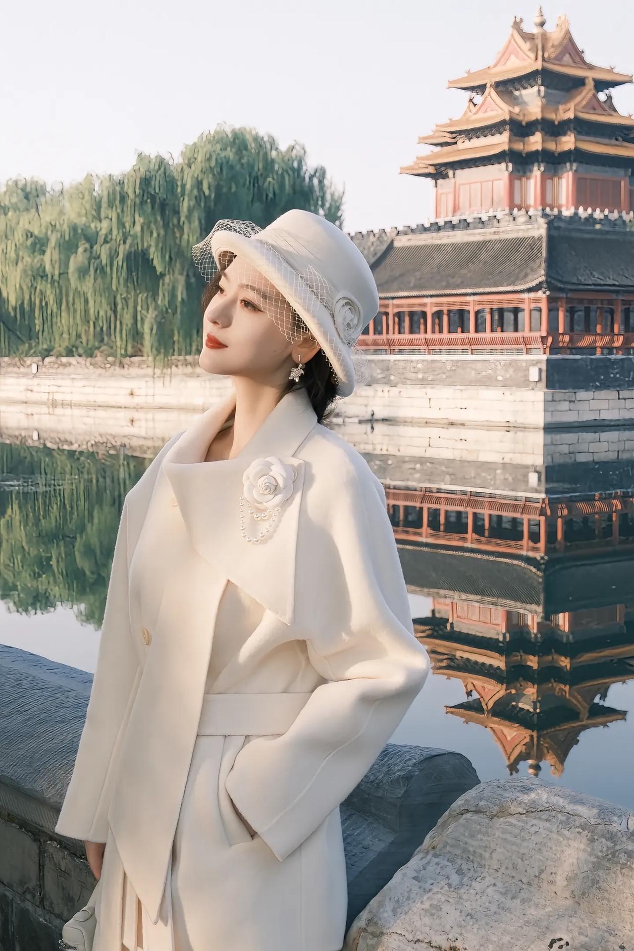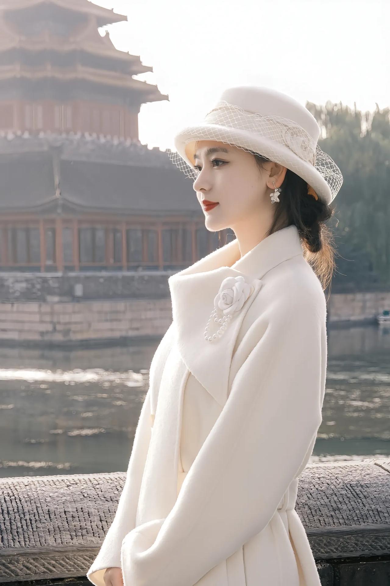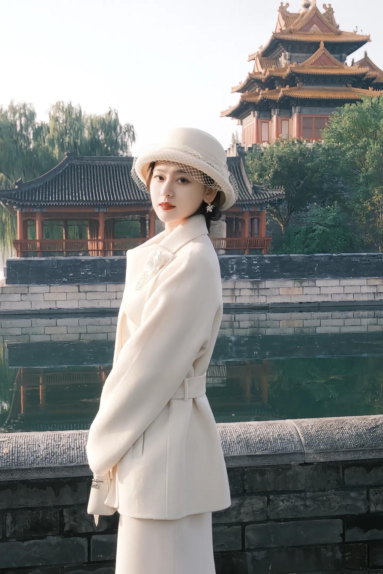 优雅的白色大衣,搭配复古的白色帽子,在古老的建筑前,尽显时尚与古典的完美融合。