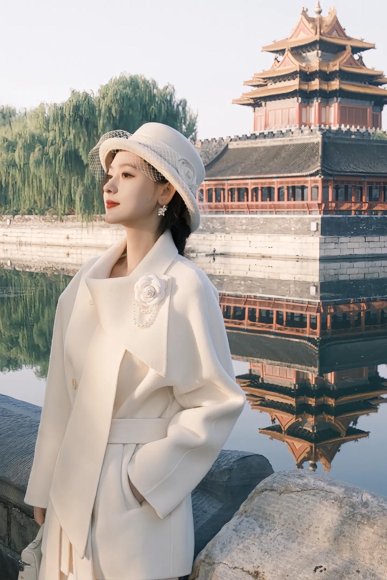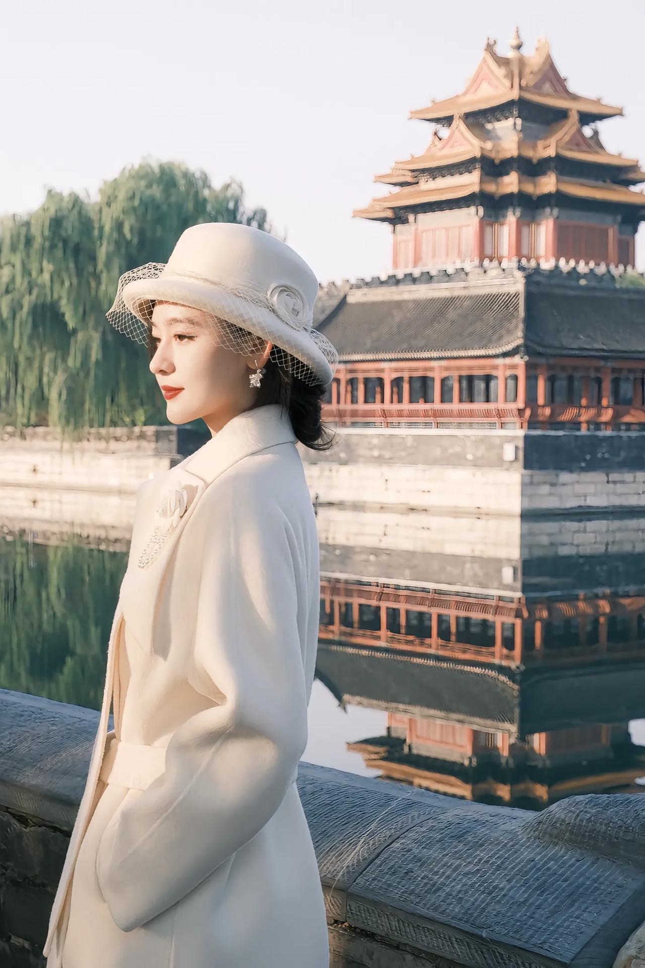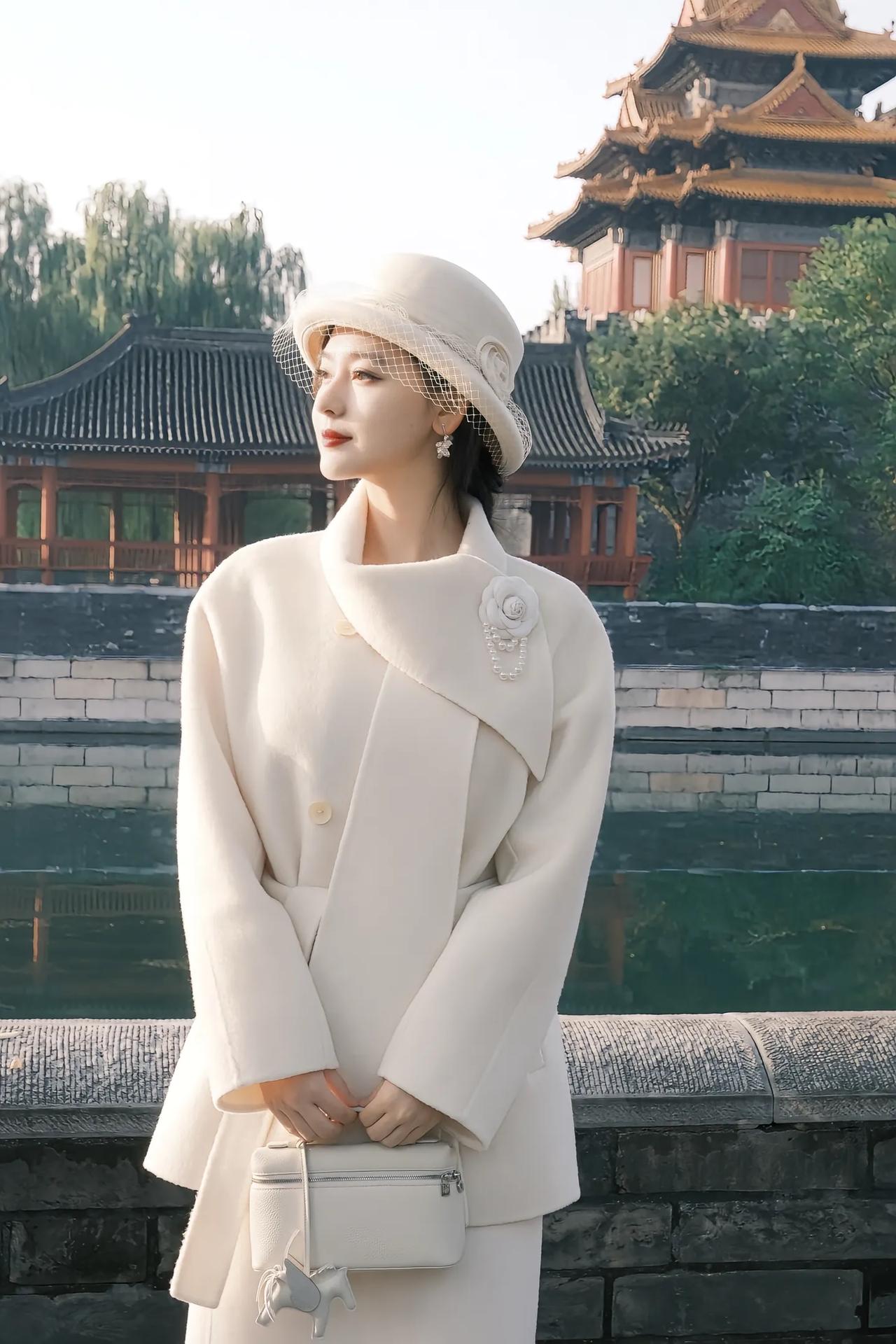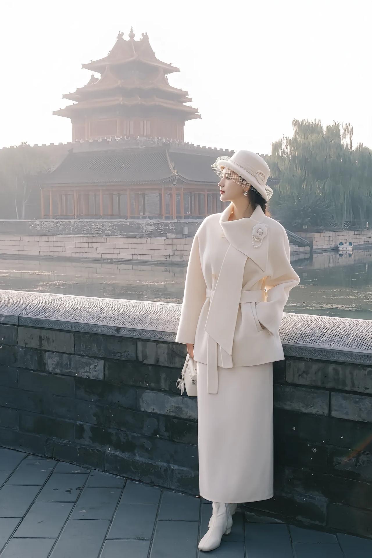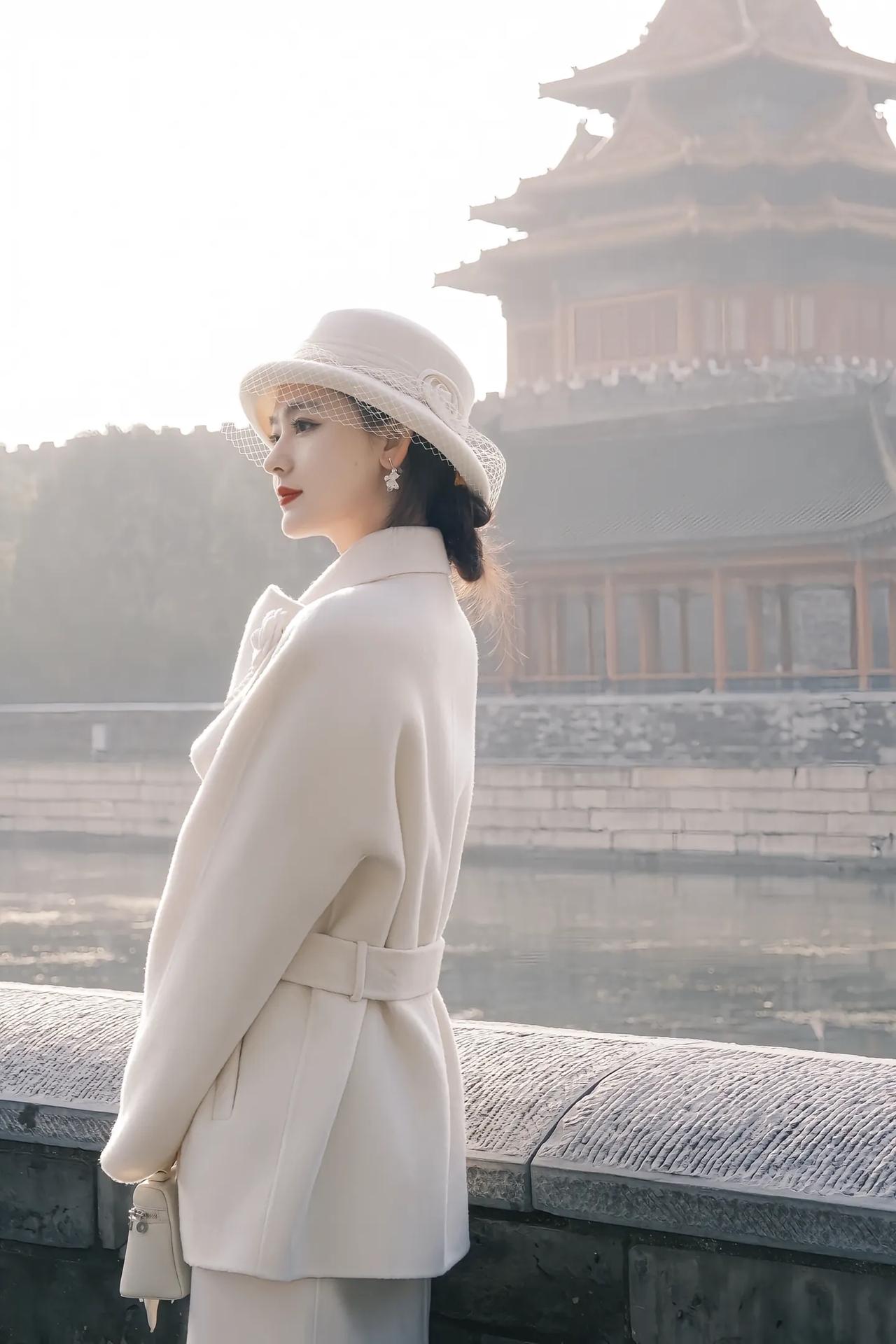 优雅的白色大衣,搭配复古的白色帽子,在古老的建筑前,尽显时尚与古典的完美融合。