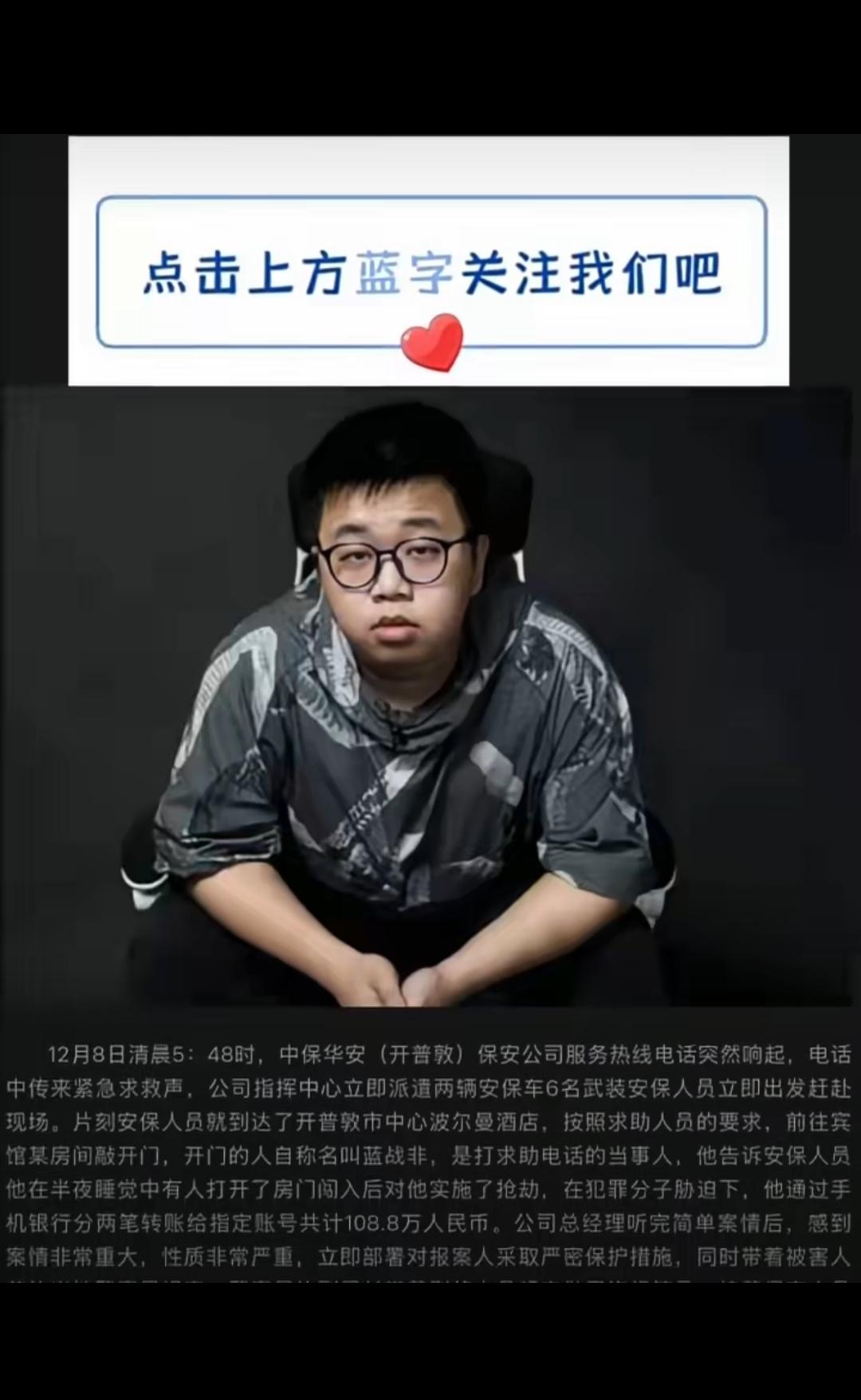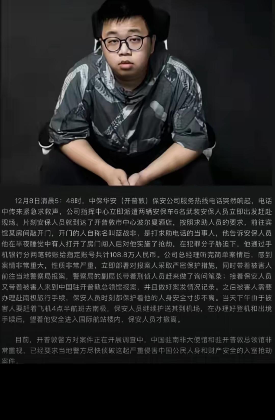 吓出冷汗!千万粉旅游主播蓝战非在南非五星级酒店遭绑架,惊魂4小时太窒息! 绑匪是中国籍头目带两名黑人,提前半年布局,买通机场和酒店人员拿到房卡,半夜持刀闯入。不仅逼他转108.8万,还逼申网贷、拍裸照,甚至胁迫采集精液伪造性侵证据,威胁敢报警就栽赃。 万幸他凌晨求救,中保华安保安火速赶到,带他报警并向中国驻开普敦总领馆报备。目前使馆已介入施压,当地警方全力破案,蓝战非已安全离开南非。 海外出行真得绷紧安全弦,这波操作太刷新认知了。 蓝战非南非遇袭 海外安全警示