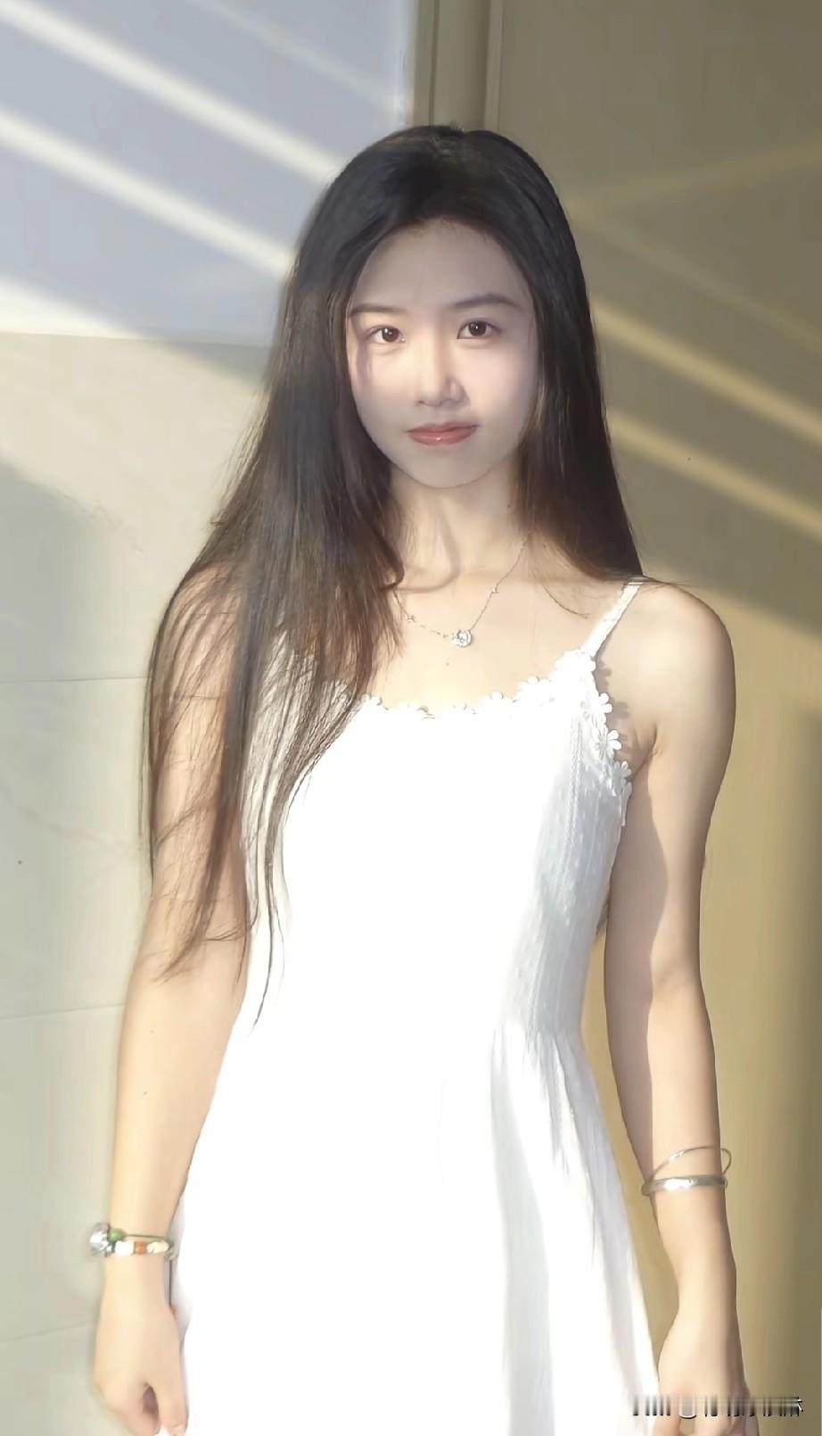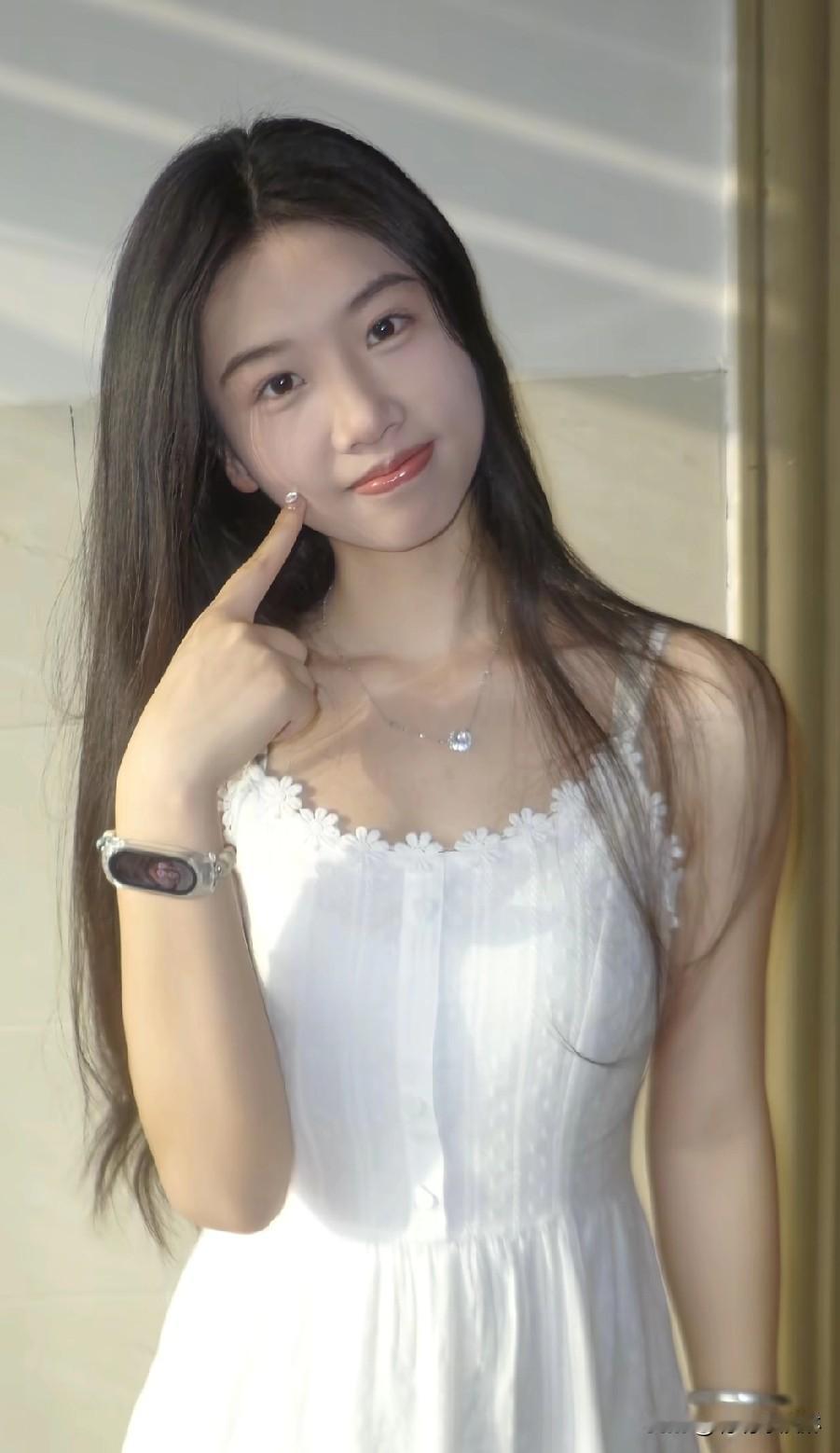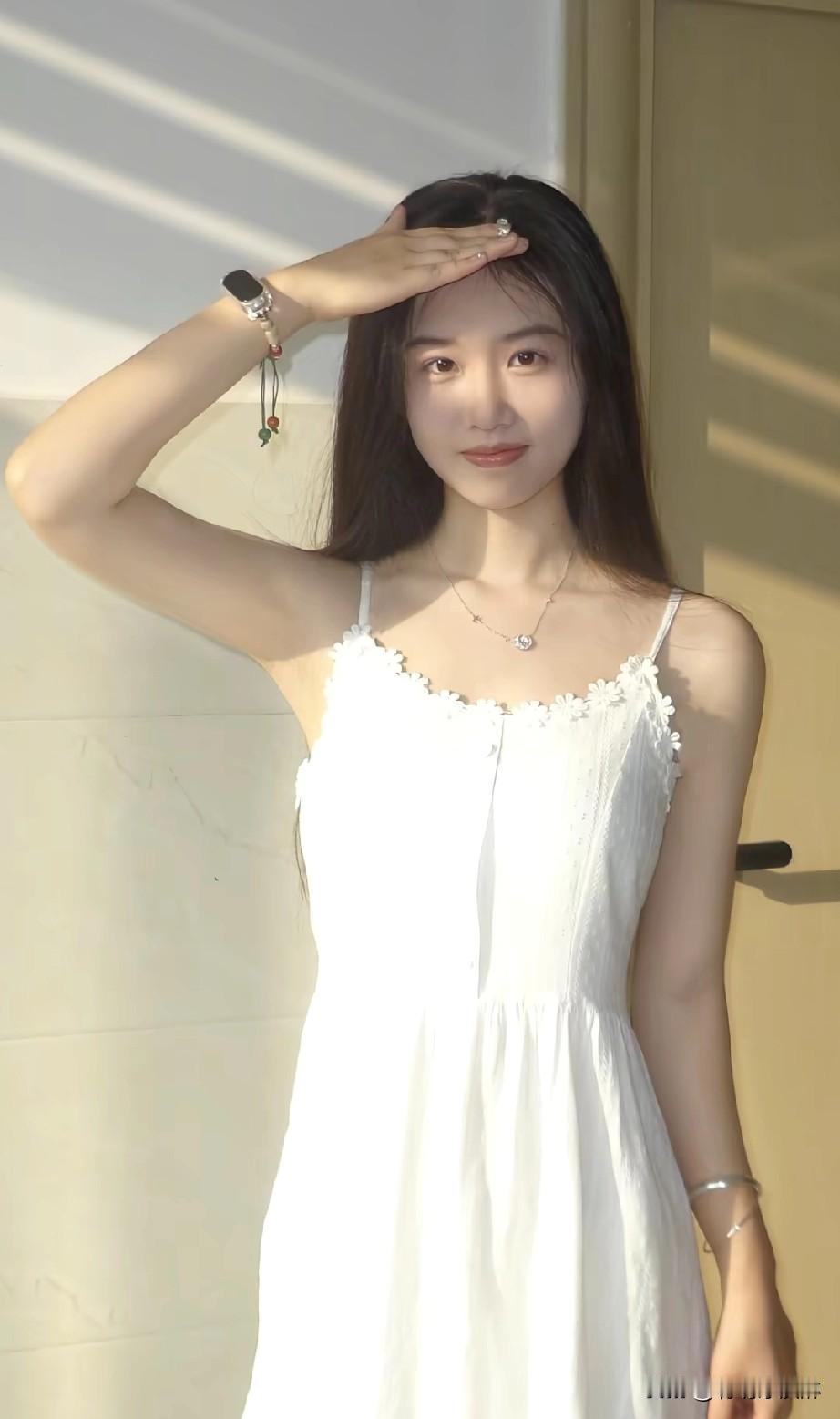 阳光下的甜美少女,白色连衣裙,微笑如阳光般灿烂。