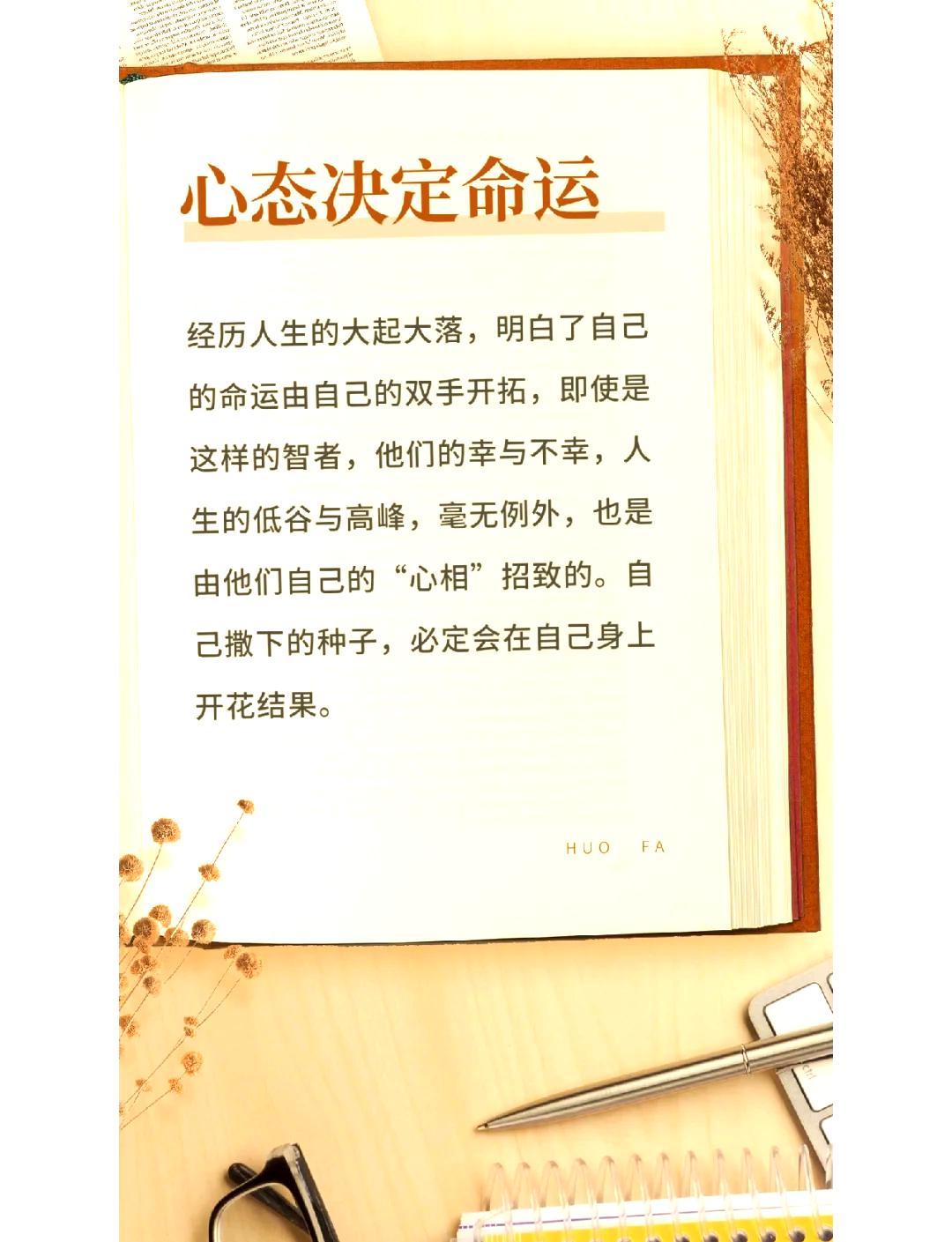 心态决定命运,积极心态带来美好人生。 心态决定命运,积极心态带来美好人生。这句话似乎简单,却蕴藏着改变命运的无限力量。你是否曾经在低谷中迷失自己,觉得前路迷茫?又是否在成功时因为一时的骄傲而迷失了方向?其实,人生的每一次起伏,都与我们的心态息息相关。 有人说,人生就像一场长跑,关键不在于跑得有多快,而在于你是否能坚持到最后。坚持的秘诀,正是那颗积极向上的心。你是否注意到,那些在逆境中依然微笑、不断前行的人?他们之所以能逆风而行,不是因为他们没有困难,而是因为他们心中燃烧着希望的火焰。 试想一下,如果我们每个人都能用一种积极的心态去面对生活的每一个挑战,或许失败也会变成宝贵的经验,挫折也会成为成长的养分。那些看似无法逾越的障碍,其实只是心态的试金石。正如一位哲人所说:“心态决定高度,心境决定宽度。” 然而,现实中很多人却陷入了负面情绪的泥潭,抱怨生活的不公,迷失在过去的阴影中。其实,改变心态并不难,只要你愿意从今天开始,学会用感恩的眼光看待每一件事,用积极的心情迎接每一个晨曦。你会发现,原本阴云密布的天空,也会因为你的微笑变得明亮。 人生没有绝对的幸运,也没有永远的逆境。关键在于你是否拥有一颗坚韧不拔、积极向上的心。那些真正成功的人,都是在无数次跌倒后,依然能够微笑着站起来的人。因为他们知道,心态决定命运,而命运的钥匙,始终掌握在自己手中。 所以,朋友们,是时候重新审视自己的心态了。不要让负面情绪成为你前行的绊脚石,而要让积极的力量成为你人生的助推器。相信我,一个积极的心态,不仅能让你看见更多的希望,也能带你走向那片属于你的光明未来。只要心怀善意,脚踏实地,任何梦想都不会遥远。让我们一起,用心态点亮人生的每一个角落,迎接属于我们的美好明天! 心态人生感悟 只要有个好心态 对命运的态度 心态要调好