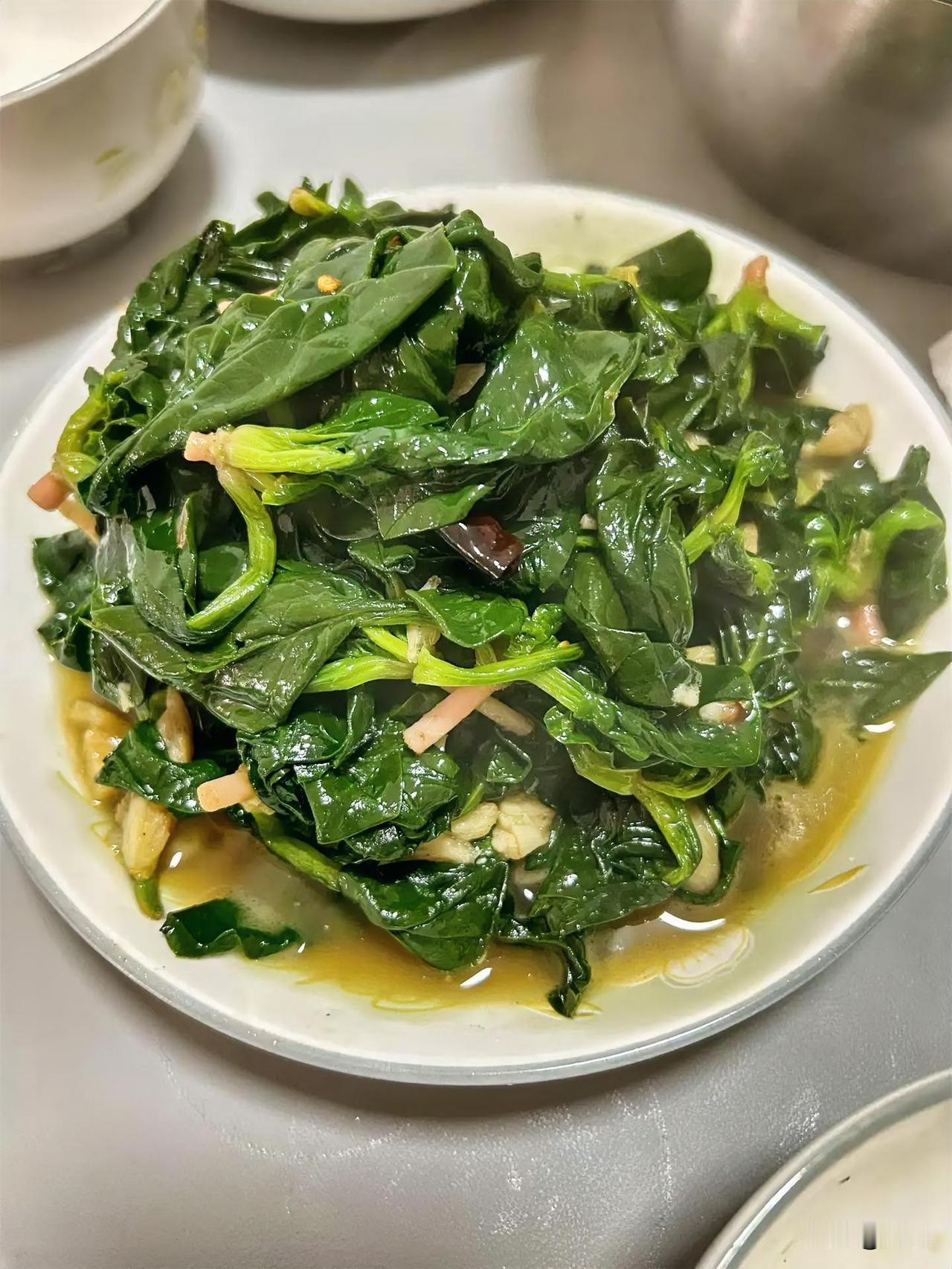 今晚这盘炒菠菜可把我香迷糊了! 刚端上桌那股热油裹着蒜香的味儿就往鼻子里钻,叶片油亮油亮的,裹着点浅黄的汤汁,嚼起来软嫩还带着点脆劲儿,混着零星的火腿丁,鲜得连盘底那点汤都想扒拉干净。 小时候不爱吃绿叶菜,总觉得寡淡,现在反倒觉得这口最熨帖——不是什么山珍海味,就是家常菜里那股“刚出锅的热乎劲儿”,裹满烟火气,吃一口就觉得这日子踏实得很。