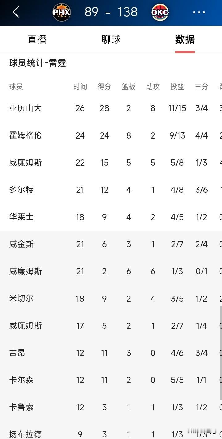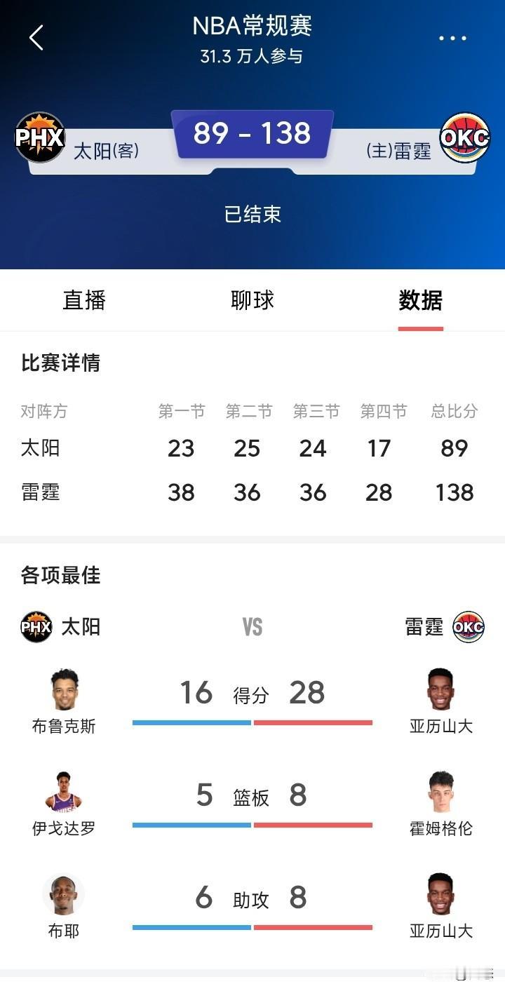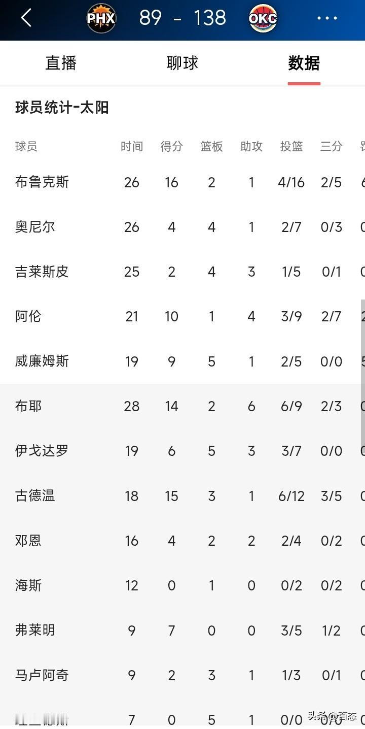 太残暴了,雷霆对阵太阳,可以说是毫无悬念的,没想到雷霆居然138比89太阳。可以说是太残暴了,一点面子都不给太阳。 不得不说雷霆攻防两端太厉害了,能和雷霆掰掰手腕的估计没几个了,除了掘金和全员健康的快船能掰掰手腕,我实在是想不出来还有谁了? 你们分析分析雷霆为什么战绩排名第一,他们有什么过人之处呢?