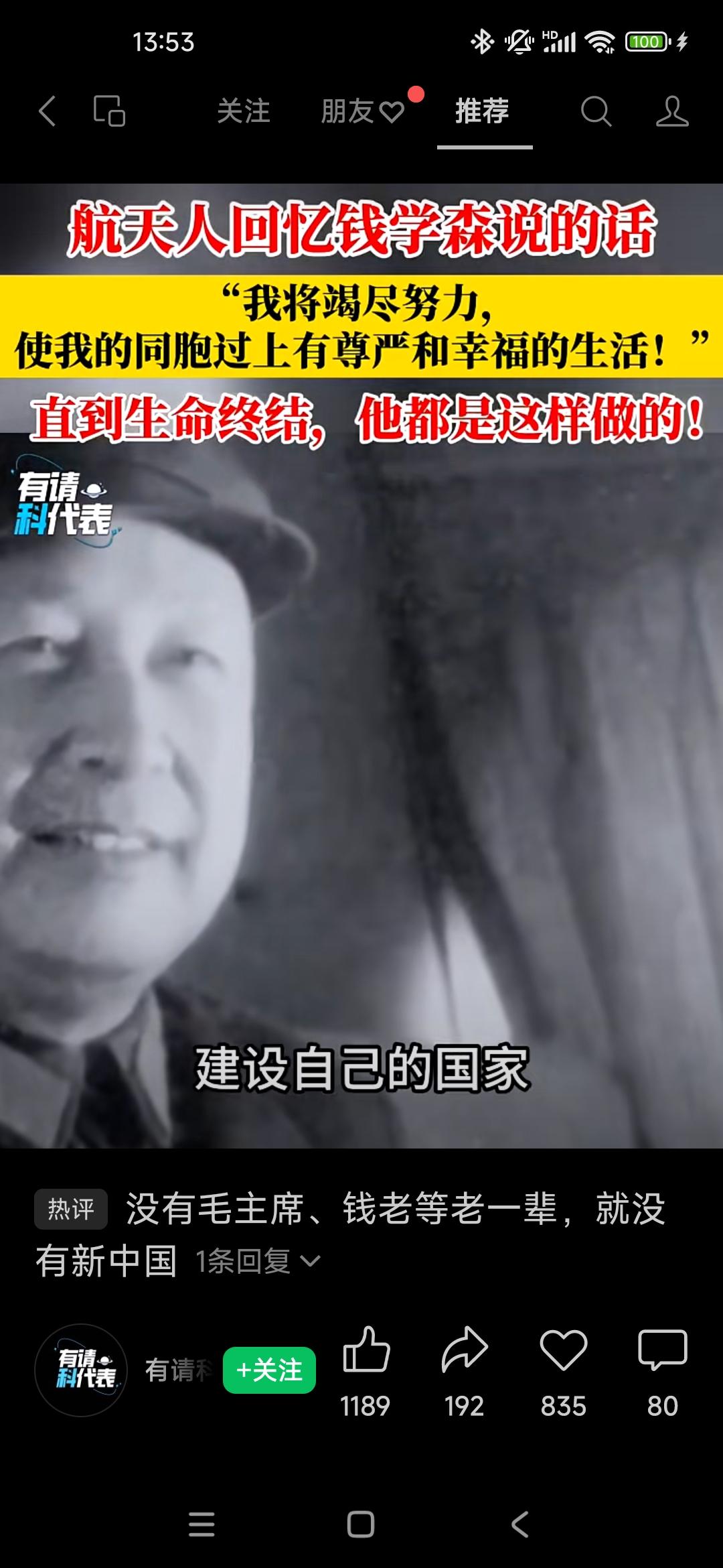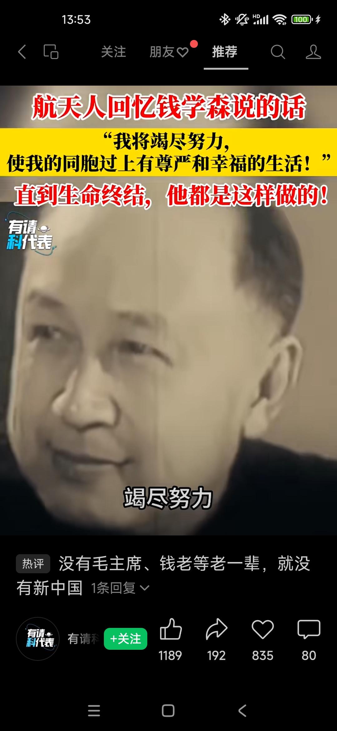 航天人回忆钱学森说过的话 我看到钱老从红旗车下来,这是我第一次见到钱老。 钱学森说了一句话:“今后我将竭尽努力,和中国人民一起建设自己的国家!让我的同胞过上有尊严和幸福的生活!”[心]