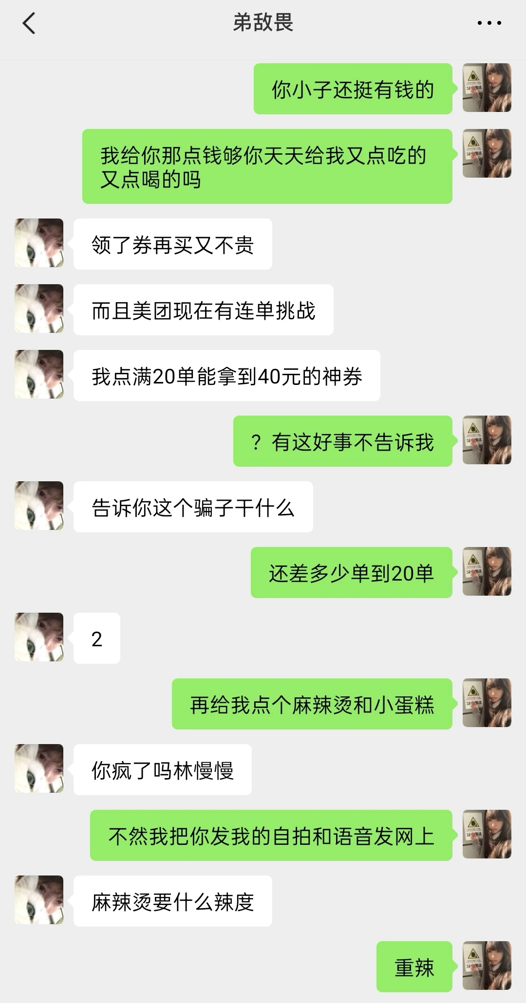 每次跟弟弟说不要网恋他都不听 好好好,非得我出马骗骗他 现在终于老实了吧哈哈哈哈哈 连着免费吃了弟弟一星期的外卖太爽了 这小子还精的很 给我点外卖也不忘参加美团外卖的连单挑战 全部通关了就能拿到40元的超大额券 这么好的事也不跟我说 天天点外卖的姐妹们也别忘了去看看! 打开美团App/美团外卖App 🔍【连单挑战】就能进入活动页面了 我弟给我连续点了很多单已经成功拿到40元的神券了 晚上再忽悠他拿神券给我点外卖嘿嘿嘿 美汁汁