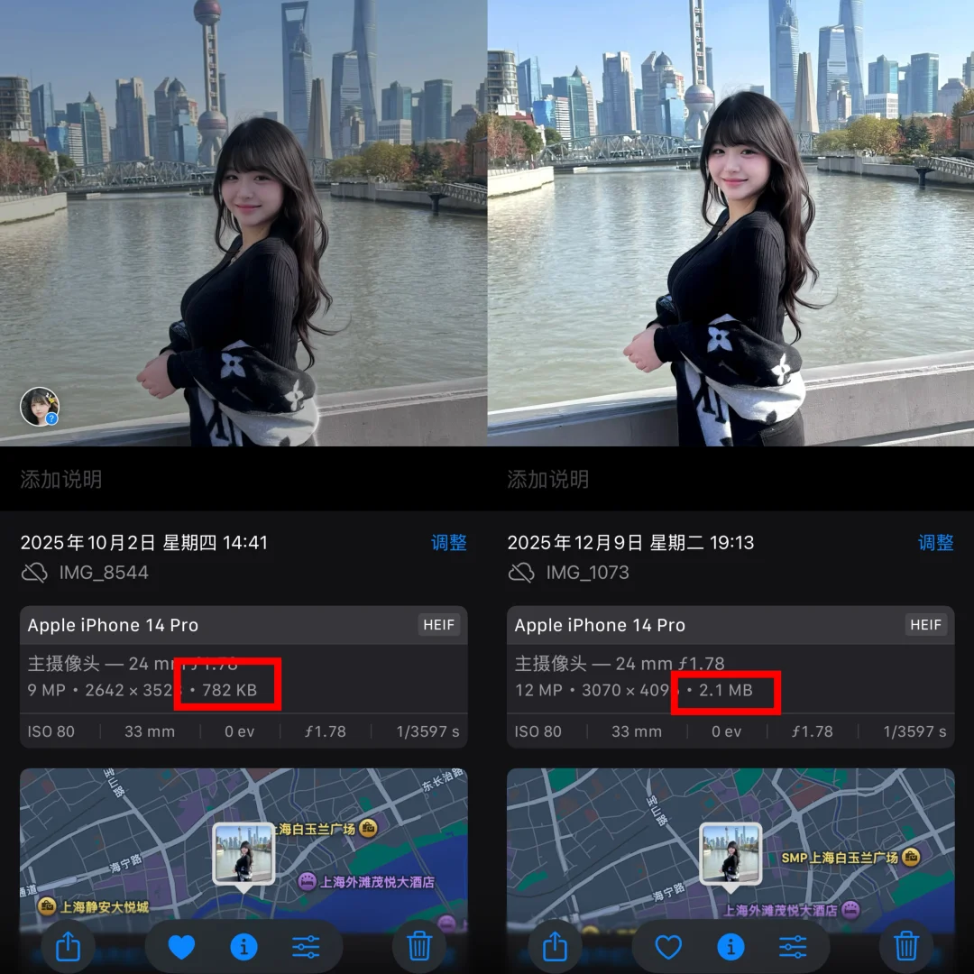 看看设置后的图片占比内存的大小,真的不压缩画质啦