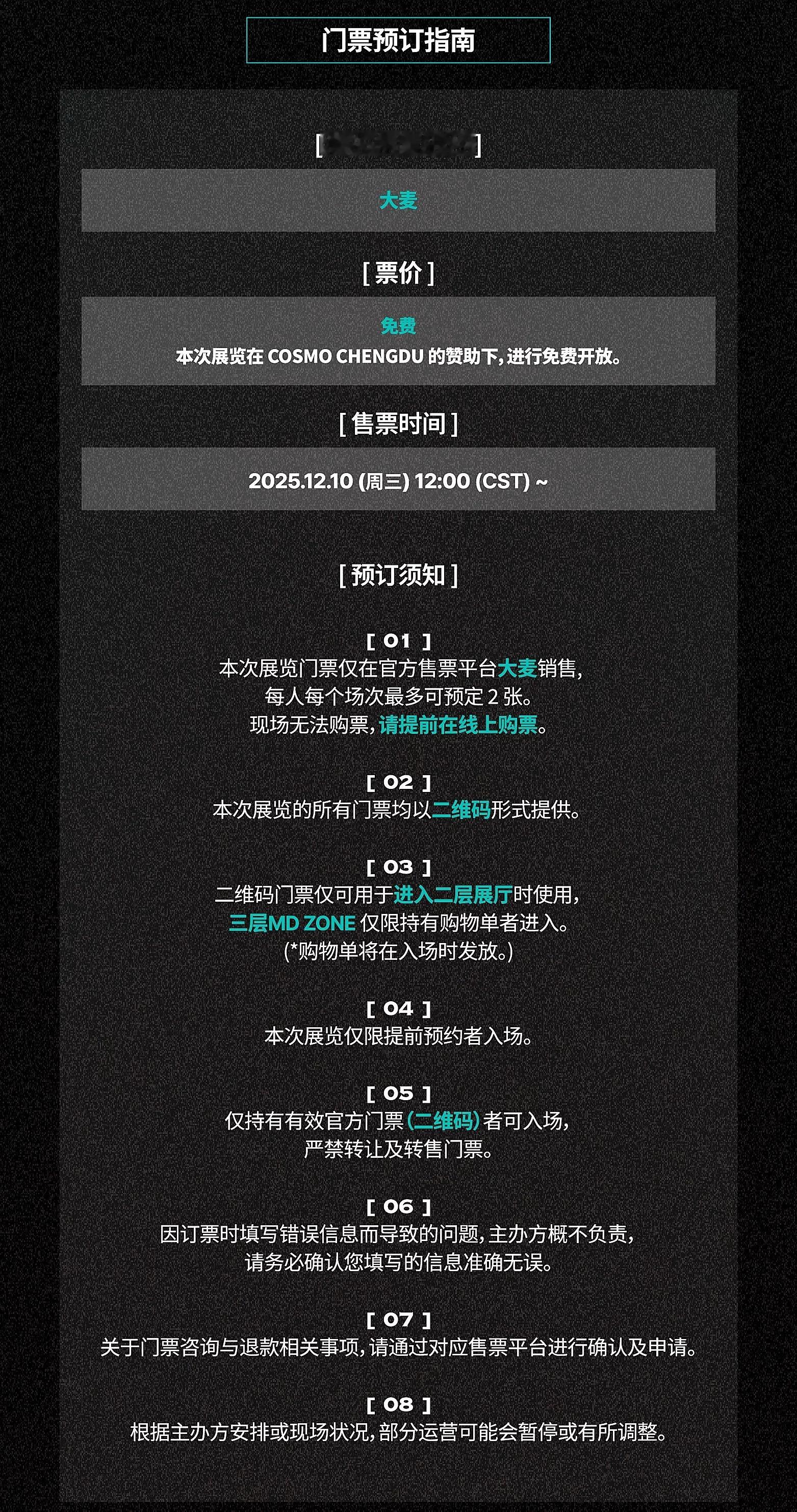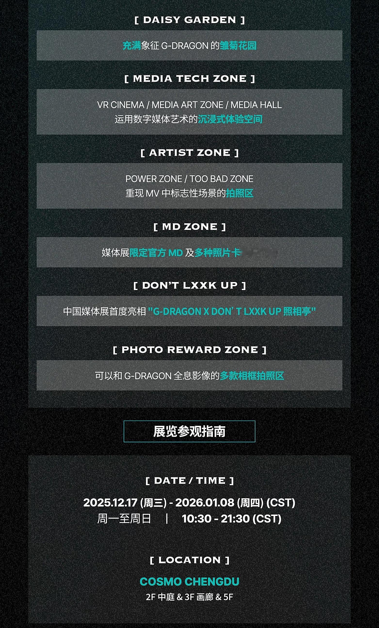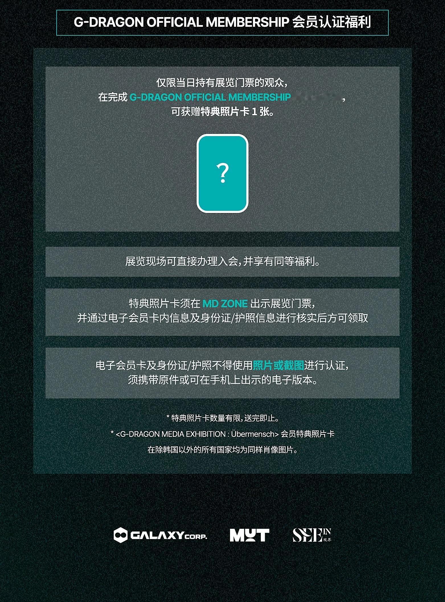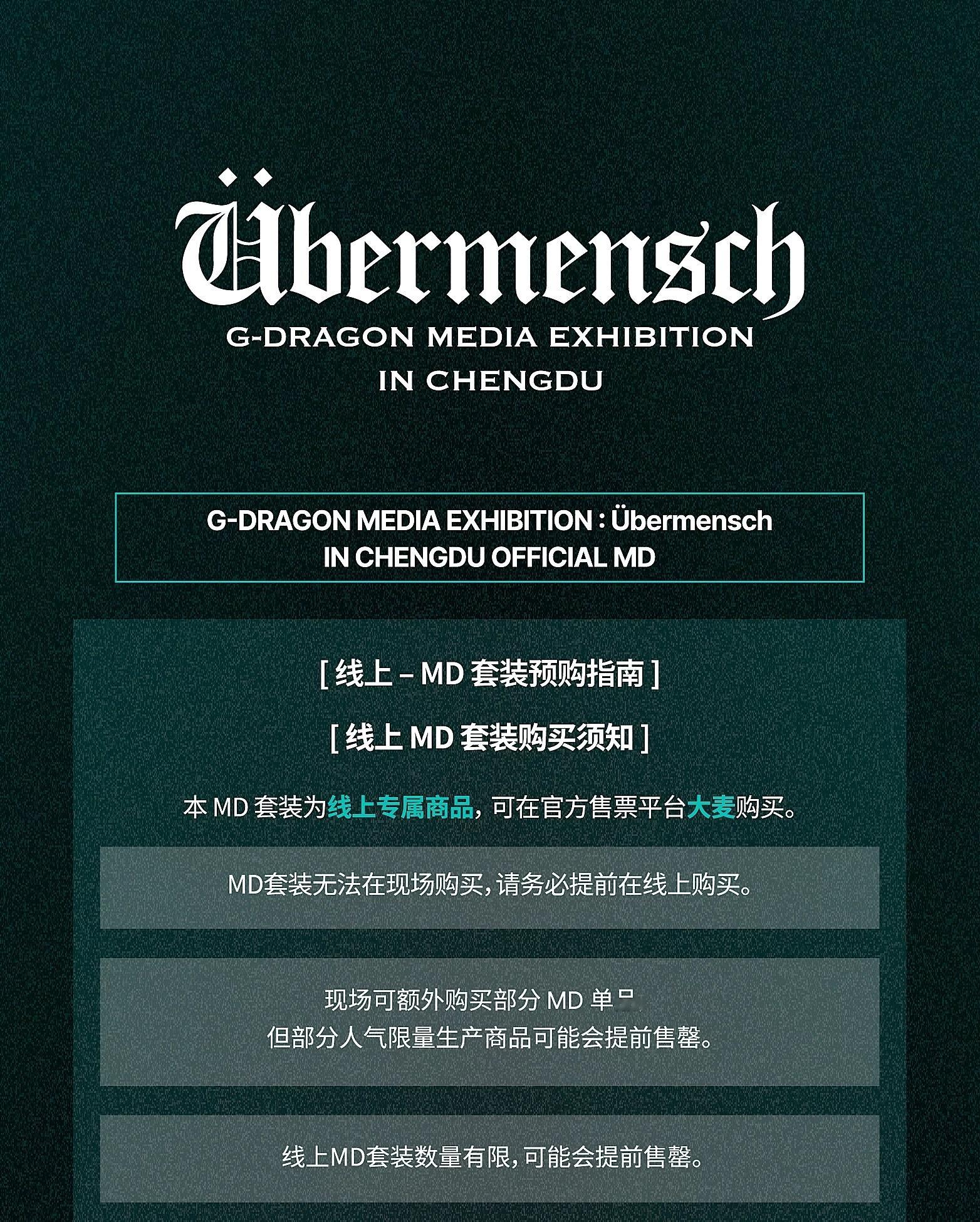 G-DRAGON/权志龙 展览+快闪店✨✨场次首尔 250309~250919东京 250712~250721中国台北 250717~250811中国香港 250815~250907大阪 250830~250915中国澳门 250929~251030新加坡 251001~251013杭州 251115~251207成都 COSMO 2F中庭&3F画廊&5F2025年12月17日~2026年1月8日✨注意事项①门票免费②检查身份证入场③入场后领取入场卡、入场手环、纹身贴纸、MD购物单④官咖会员可获得一张特典卡,数量有限⑤线上只能买线上专属套装,线上套装只能线上买⑥线下可以买线下专属套装或单品,只能线下买