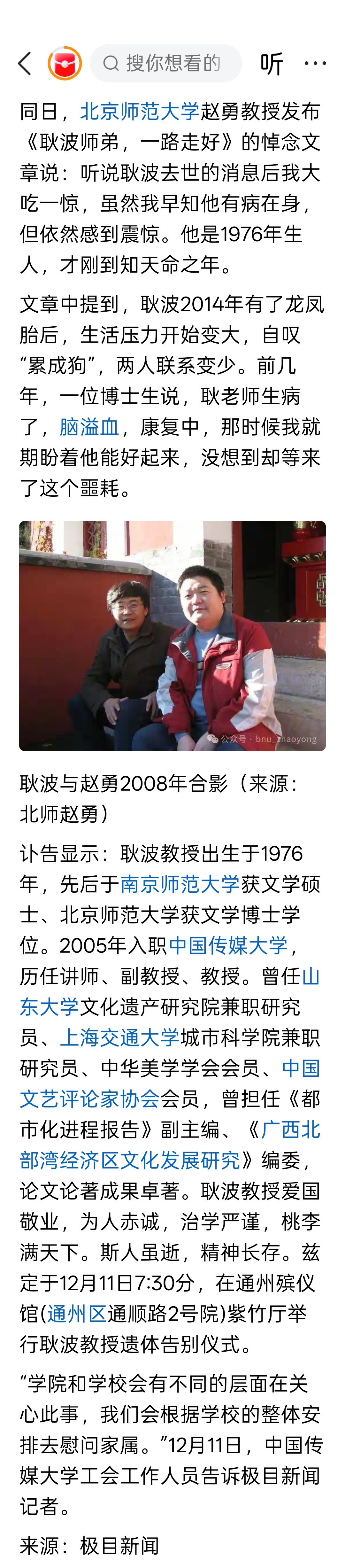 中国传媒大学博导耿波教授去世,年仅49岁,留下11岁龙凤胎。曾患脑溢血