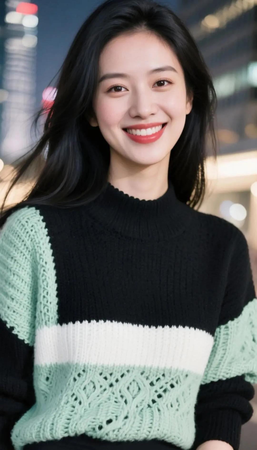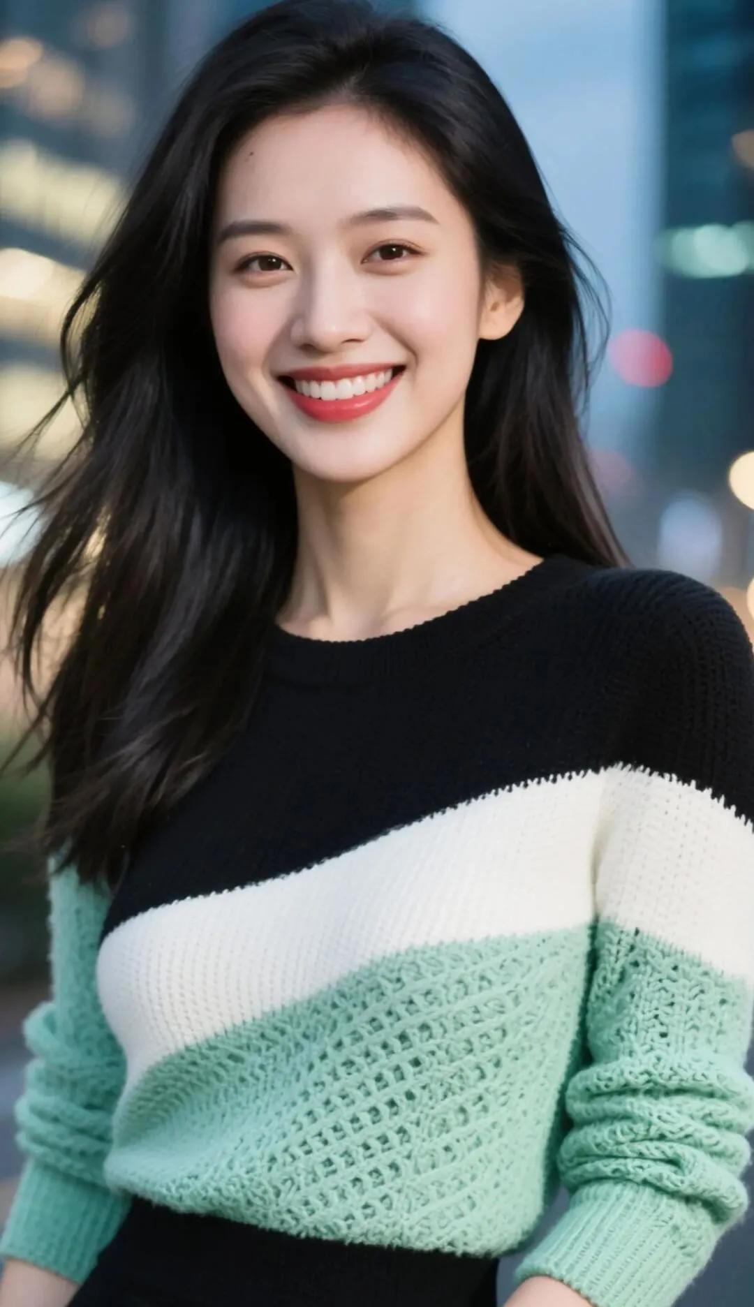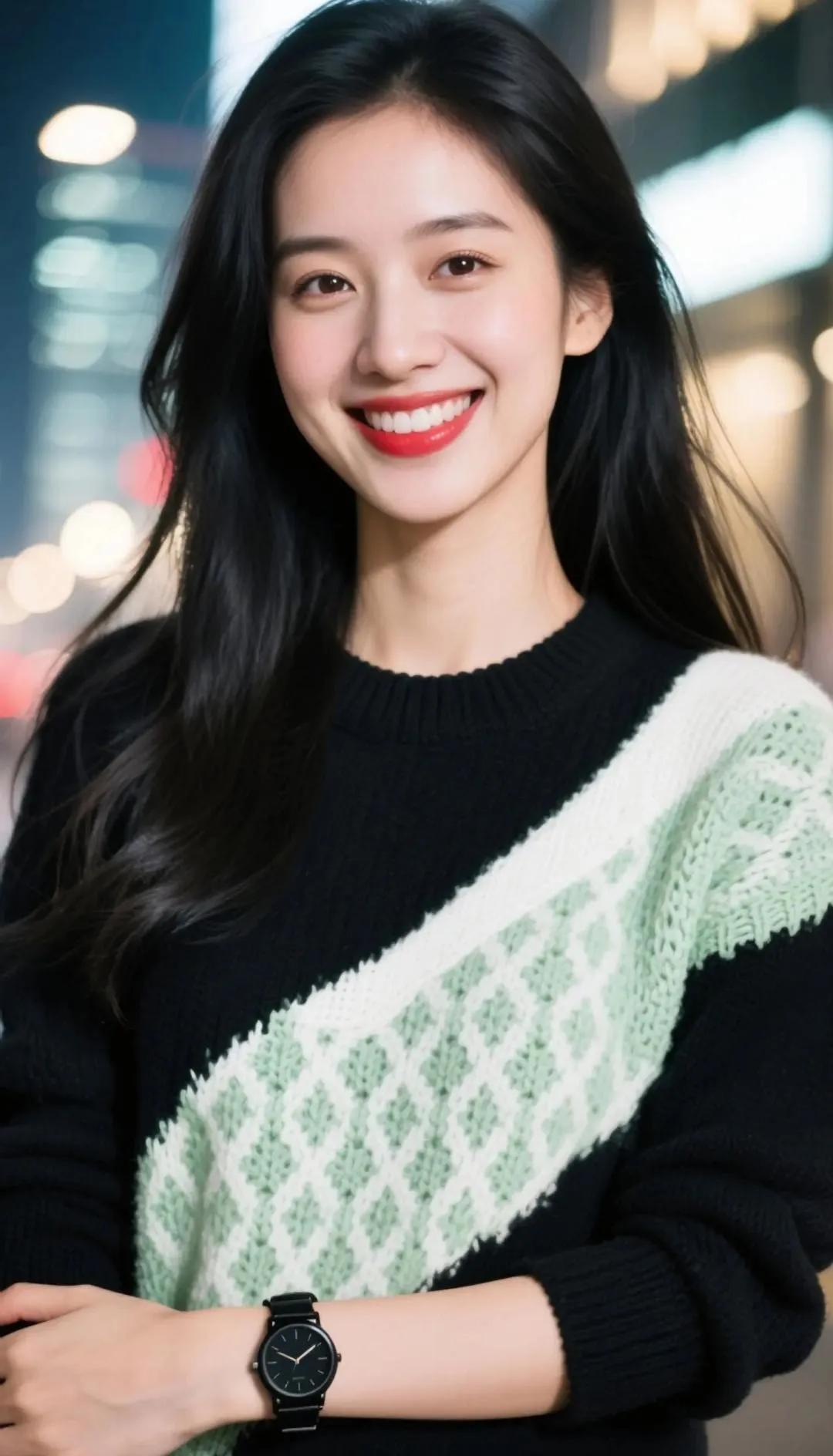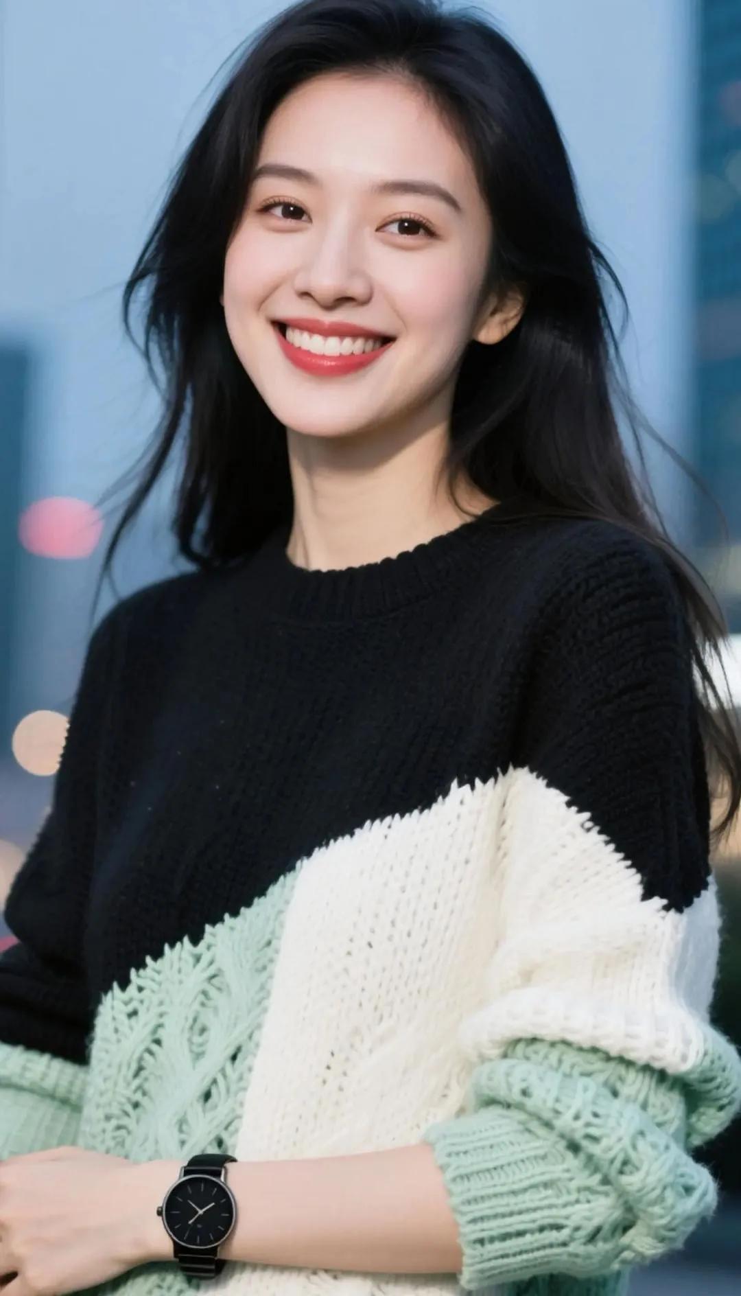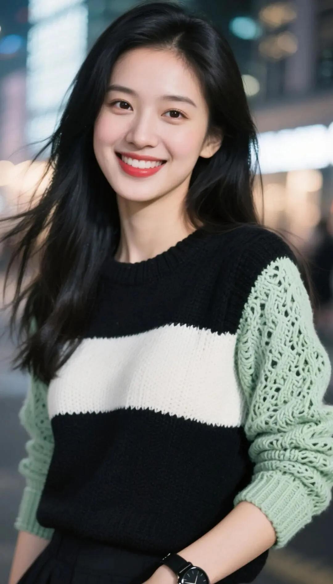 温柔甜美的少女,浅黄色毛衣搭配白色内搭,红唇点缀,自然光下更显清新动人。