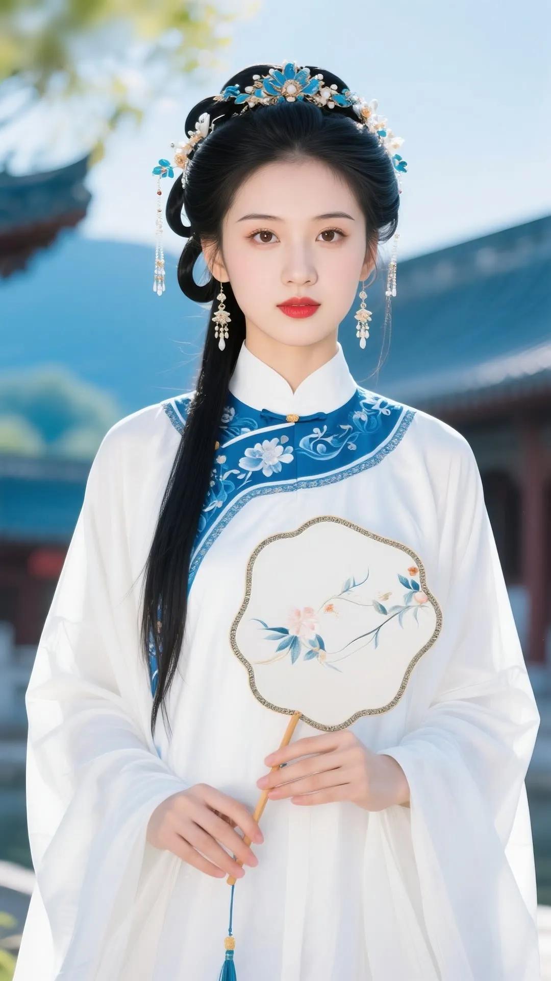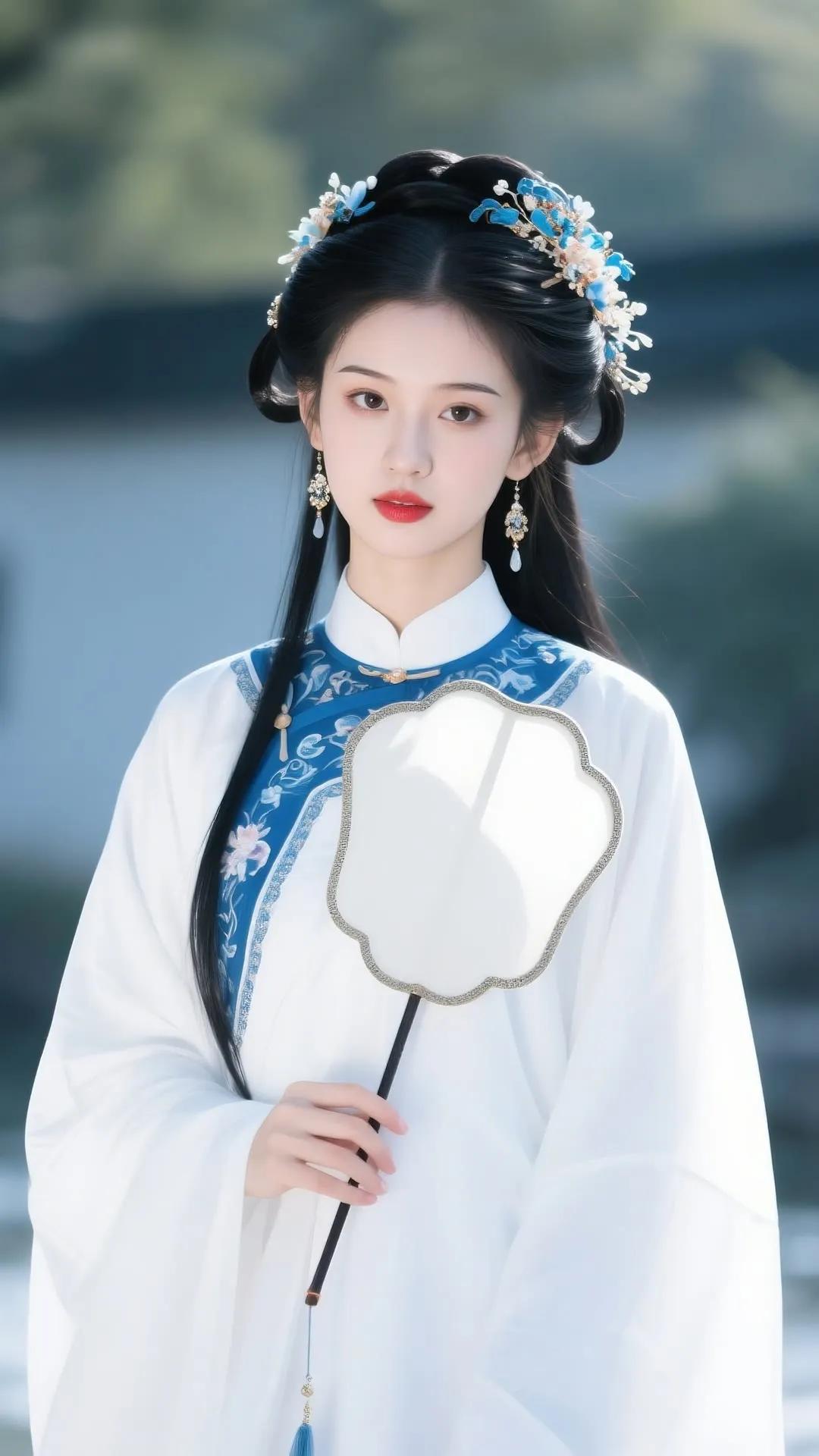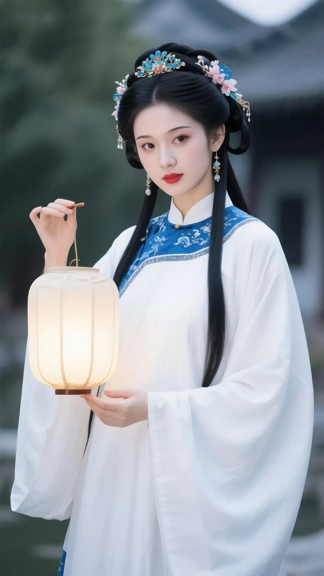 古典美人,黑发如瀑,蓝衣飘逸,宛如画中仙。