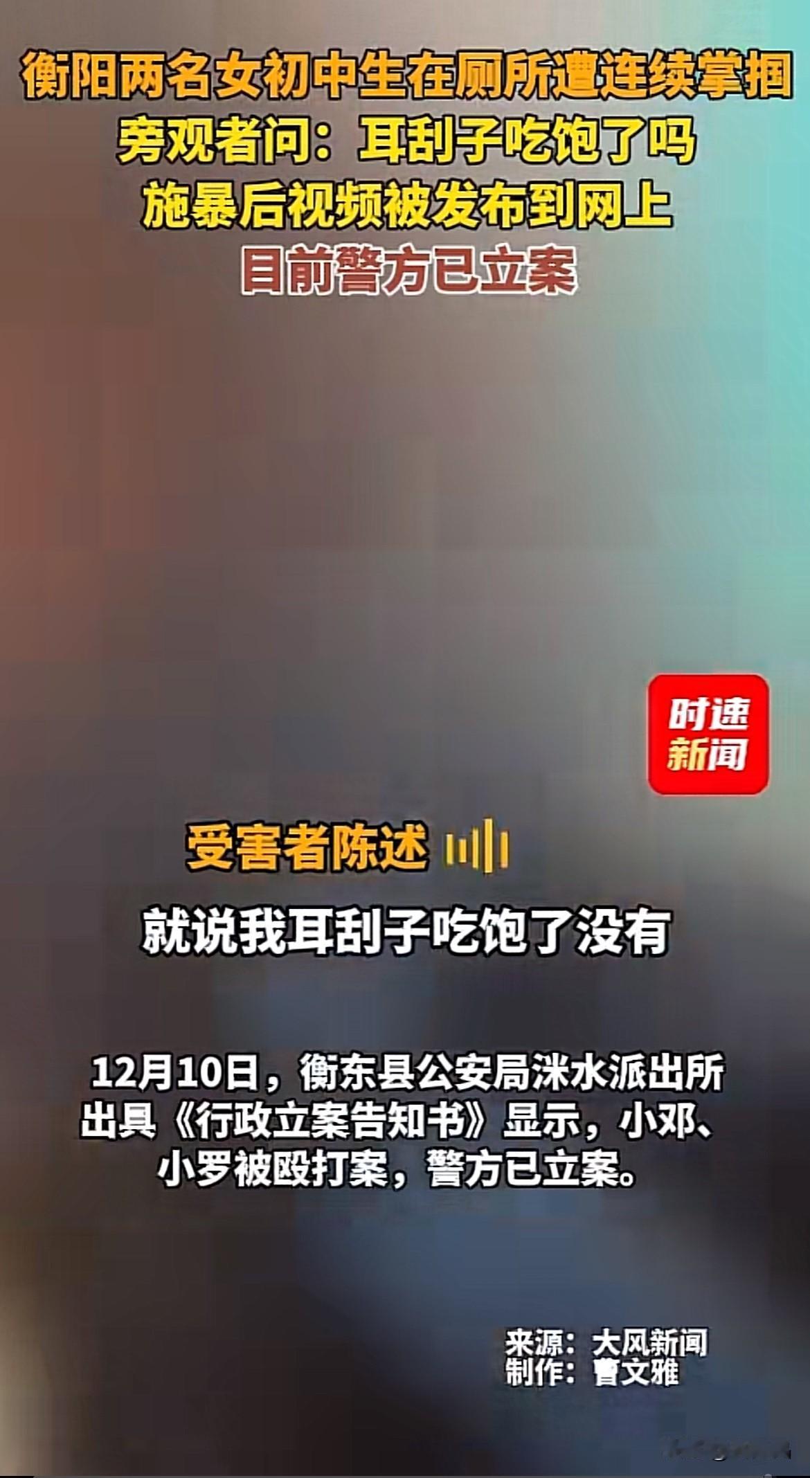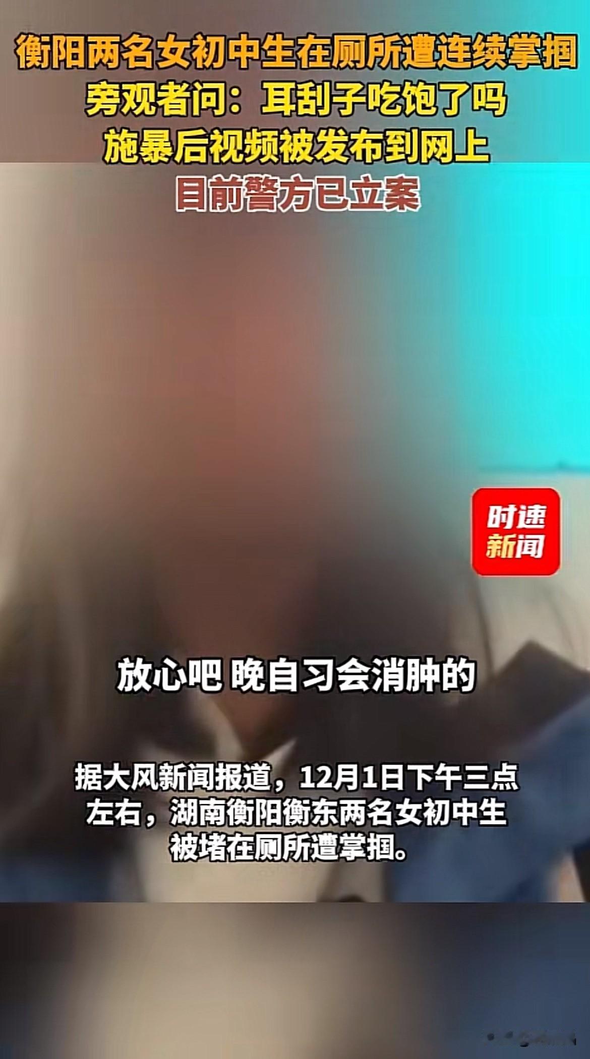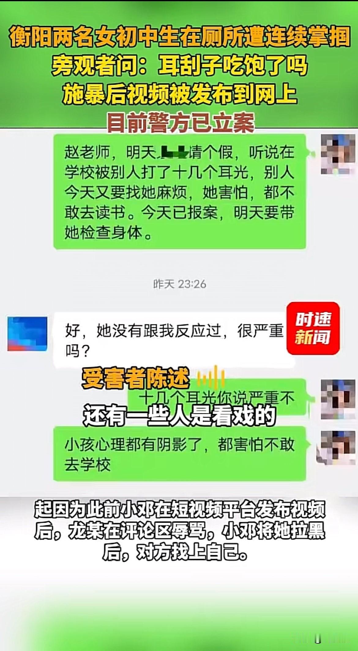 无法无天!两初中生被围堵在厕所扇耳光,围观同学落井下石,发问:耳光吃饱没?施暴者竟敢拍摄视频并发在网上。 湖南衡东,初二学生小邓此前在社交平台发布视频,评论区遭到同校初三学生龙某辱骂,于是小邓把龙某拉黑了。 12月1日,龙某怀恨在心,找来外校高一好友,通过初二好友小吴传话,把小邓和其闺蜜小罗叫去厕所,随后围堵扇耳光,因第一次没录视频,龙某竟又分别对小邓和小罗掌掴了6次,边录边打,嚣张放话:“放心吧,晚自习会消肿的。” 期间有10余名同学围观,事后同学竟嘲笑小邓,问:“耳刮子吃饱了没?”小邓和小罗不敢告诉老师和家长,怕龙某再次报复。 直至9日,同学传话龙某将再次晚自习后报复,小罗出于害怕,让爸爸来接时透露u了真话。小罗爸爸立即打电话给小邓妈妈,说“你女儿和我女儿在学校被打了。”小邓妈妈这才明白女儿这几天闷闷不乐的原因。 如今,龙某被休学,教育局介入调查。施暴者龙某因小事就对小邓施以报复,同班围观和传话同学助纣为虐,嘲笑小邓,同学的冷漠对其造成二次伤害。 同学间都传开了,老师和学校竟然一无所知,管理不严,对学生的安全保障不到位。 休学的处分未免太低,完全起不了以儆效尤的效果,龙某故意伤害同学,行为恶劣,本就无心向学,休学对他来说简直无关痛痒。初三的年纪已经对其行为有认知能力,该法律严惩。