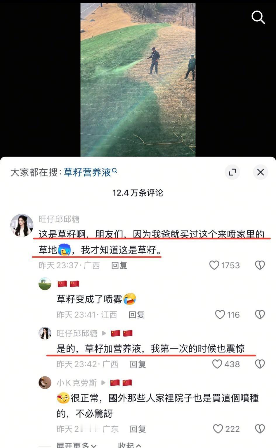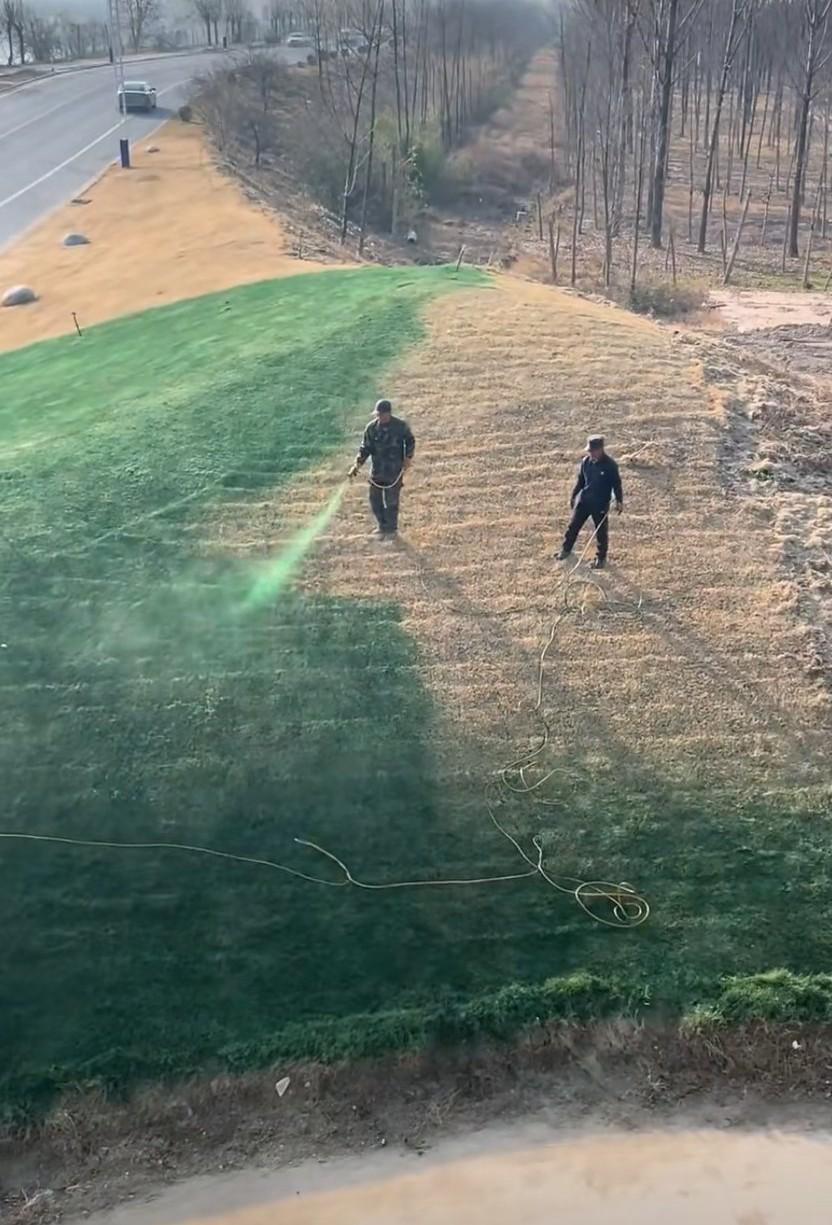 两名工作人员向枯黄的草坪上喷洒绿色的雾状液体,评论区网友说这是带有草籽的营养液,是现在草皮养护的基本操作。 这种操作有以下几个好处: 1、成本轻,比我们所知道的直接铺草皮便宜多了。 2、效果立竿见影。 3、速度比铺草皮来的快。 不过,也有网友表示:这个雾状液体里面是没有草籽的,就是普通的草坪染色剂。 评论区有没有专业人士,可以出来科普一下?
