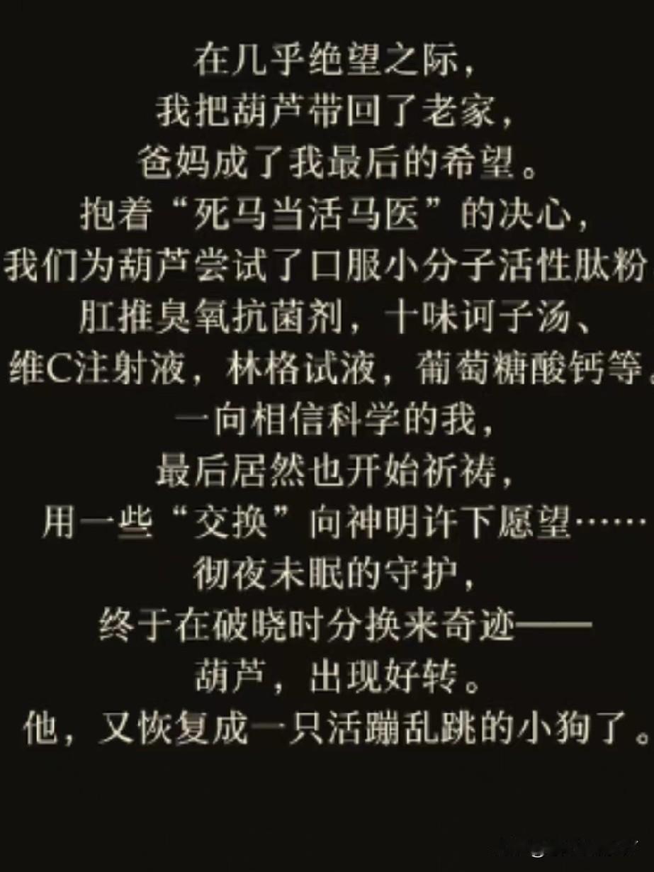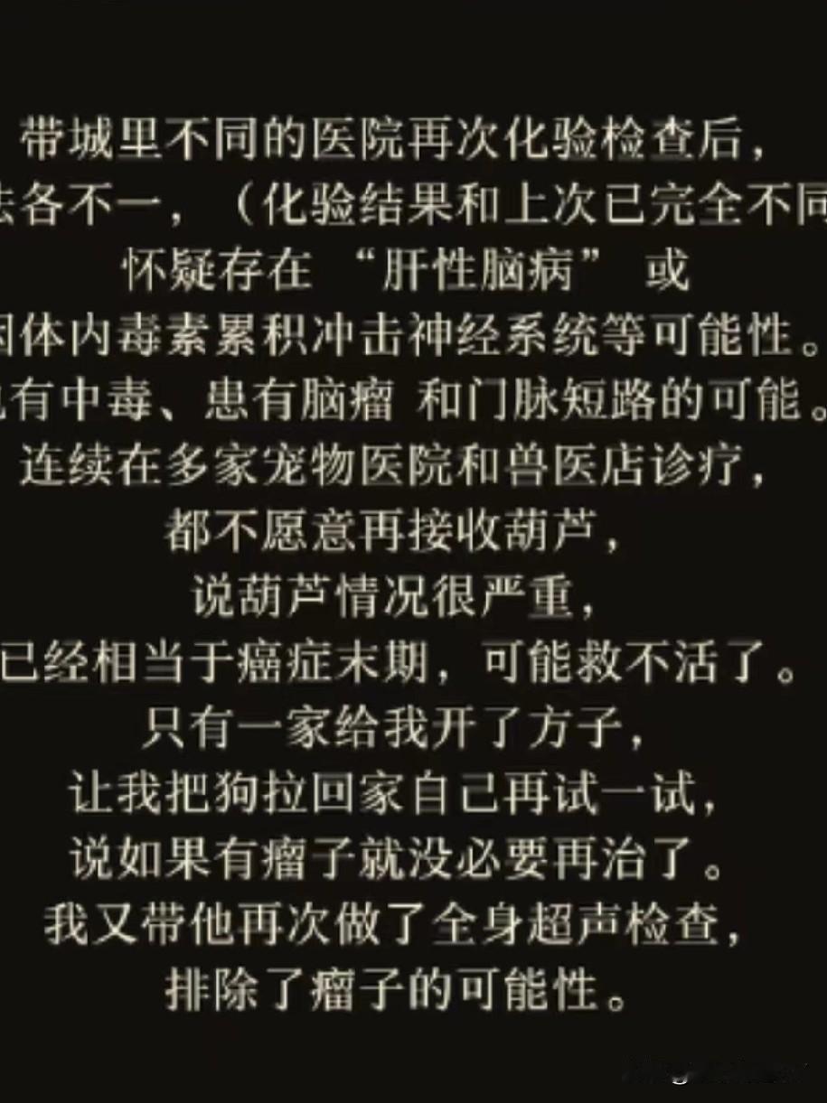 一只肚子肿得老高的流浪狗,莫名守在女子(拍摄者)家门口两天,眼神中满是迷茫和不安。 女子试着给它递食物,它却不吃。女子慢慢靠近,才发现,这只狗看着可怜,性子却十分温顺。 它格外孤单,女子每次出门,它都会立刻软乎乎地凑过来跟着,没人知道它是怎样熬过那饥寒交迫的日夜。女子心生怜悯,收留了它,并取名“葫芦”。 谁能想到,此后它竟经历了如此多的磨难…… 命运似乎对它格外苛刻,脑病复发时,它口涎不止,意识模糊到失控攻击,甚至疼得自残,眼仁充血到完全失明;紧接着,肝硬化晚期又找上门来,腹水把肚子撑得更大,肾病、肝性、脑病接连袭来,每一种病症都像一把利刃,连兽医都隐晦暗示:它大概率熬不过去了,仿佛提前给它判了“死刑”。 但生命从不会轻易屈服,它没有放弃,女子更不敢松手。打疫苗、跑遍医院做检查、住进ICU全天候照料。 更暖的是,无数陌生人的善意纷至沓来:专家远程连线问诊,兽医耐心调整治疗方案,朋友和网友主动送来药物、粮食,一句句鼓励的话语,成了支撑他们扛下去的动力。 葫芦从起初呕吐昏睡、瘦的只剩一把骨头,到后来慢慢能吃能喝,再到如今能在小巷里撒欢奔跑,对着电视里的动物好奇张望。 葫芦用一次次倔强的挣扎,回应着每一份善意。 它的每一次挺过来,都是对生的渴望;每一点好转,都是无数温暖汇聚的微光。 这不是一只流浪狗的独角戏,而是一场双向救赎的温暖之旅。 原来,再渺小的生命,都藏着不服输的韧性;再艰难的处境,都能被善意照亮。往后愿每只毛孩子都不被抛弃,不负热爱~ 流浪狗